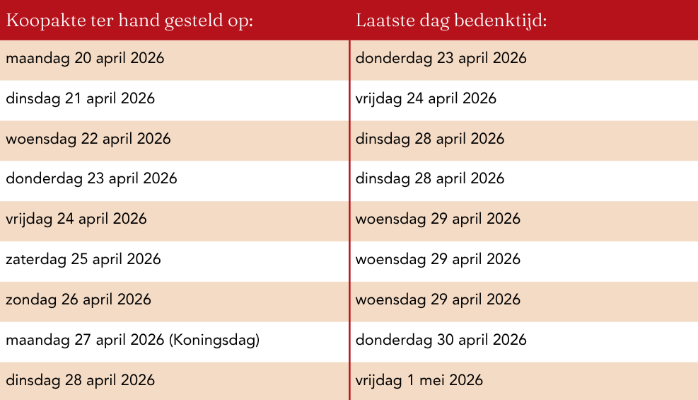De bedenktijd rond Koningsdag 2026 kan anders verlopen dan je verwacht. Door de combinatie van weekenden en de feestdag op 27 april wordt de wettelijke termijn verlengd. Dat is belangrijk om rekening mee te houden als je in deze periode een woning koopt of verkoopt.