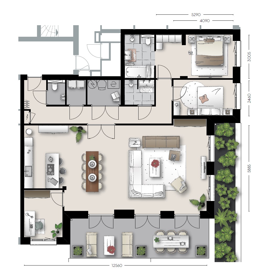 Het terras is bereikbaar via 3 keer dubbele openslaande deuren vanuit de woonkamer/keuken. Het appartement is voorzien van vloerverwarming en koeling.