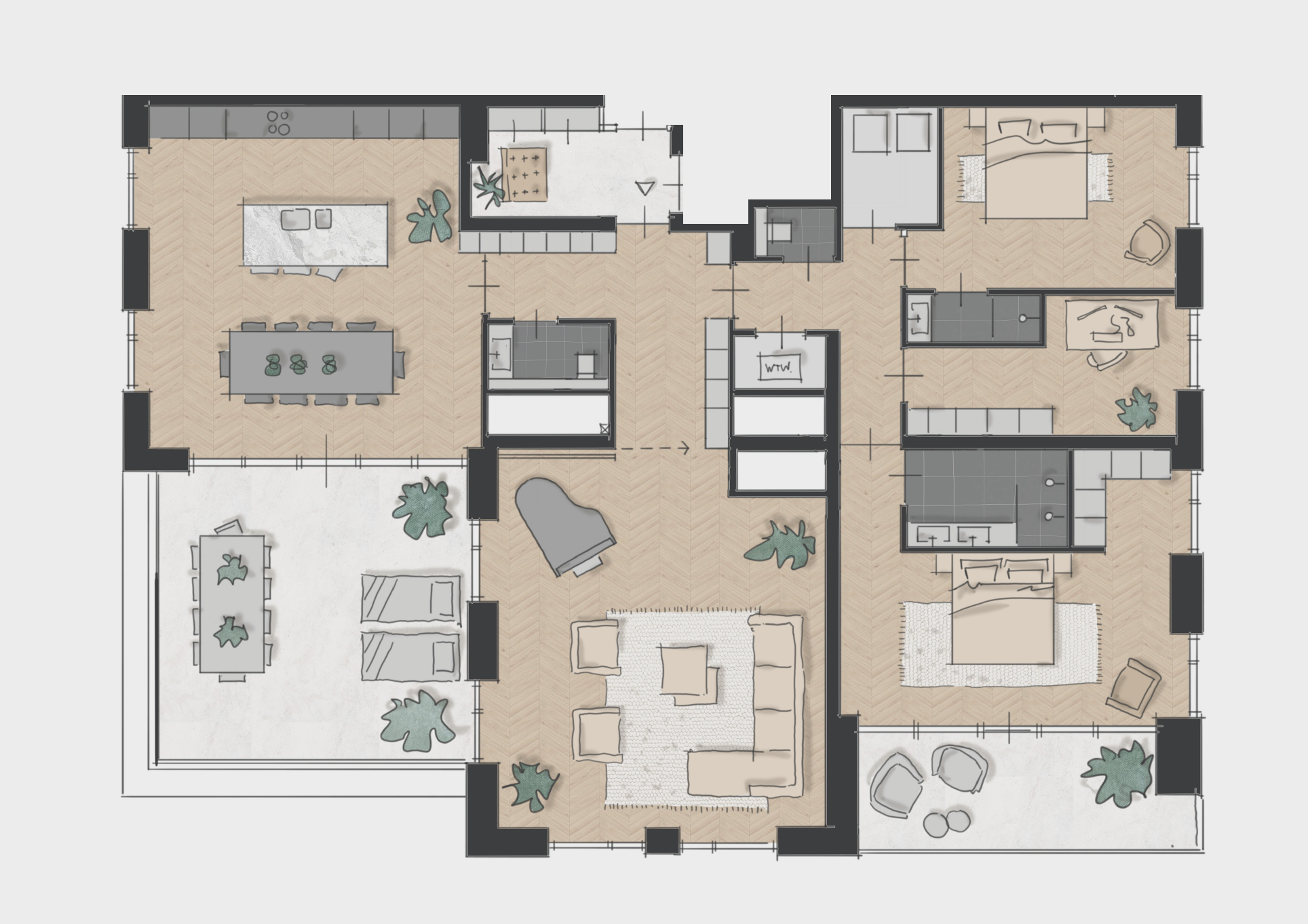 De master-bedroom heeft een ruim balkon (13 m²)gelegen op het zuidwesten en heeft een eigen badkamer en inloopkast. Slaapkamer 2 heeft tevens een eigen badkamer en er is ook gedacht aan een fijne werkkamer. Er zijn 2 aparte toiletruimtes en 2 bergingen in het appartement.