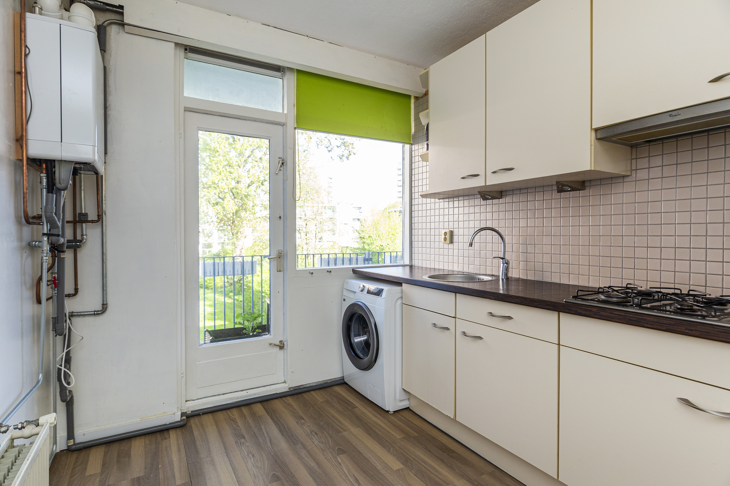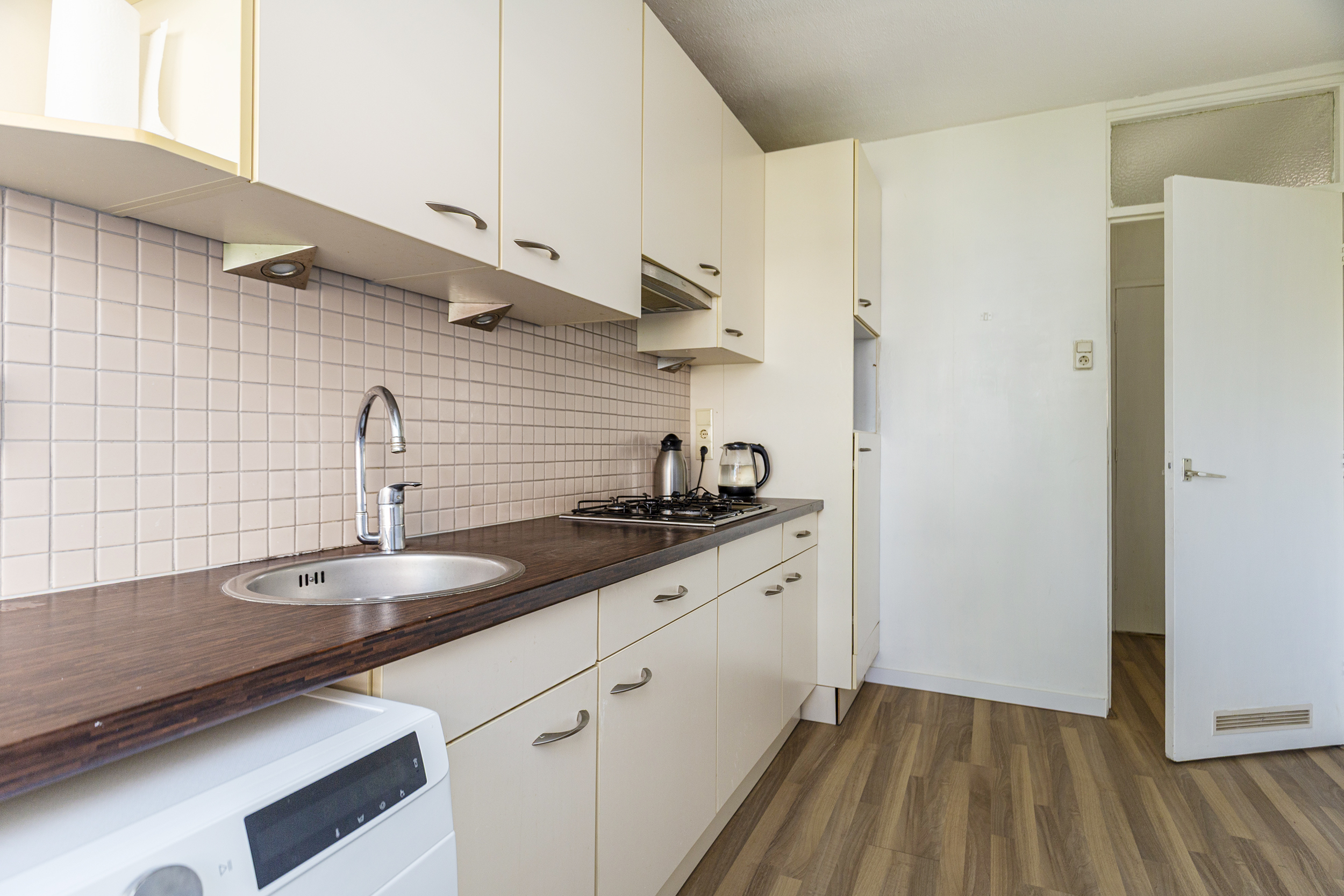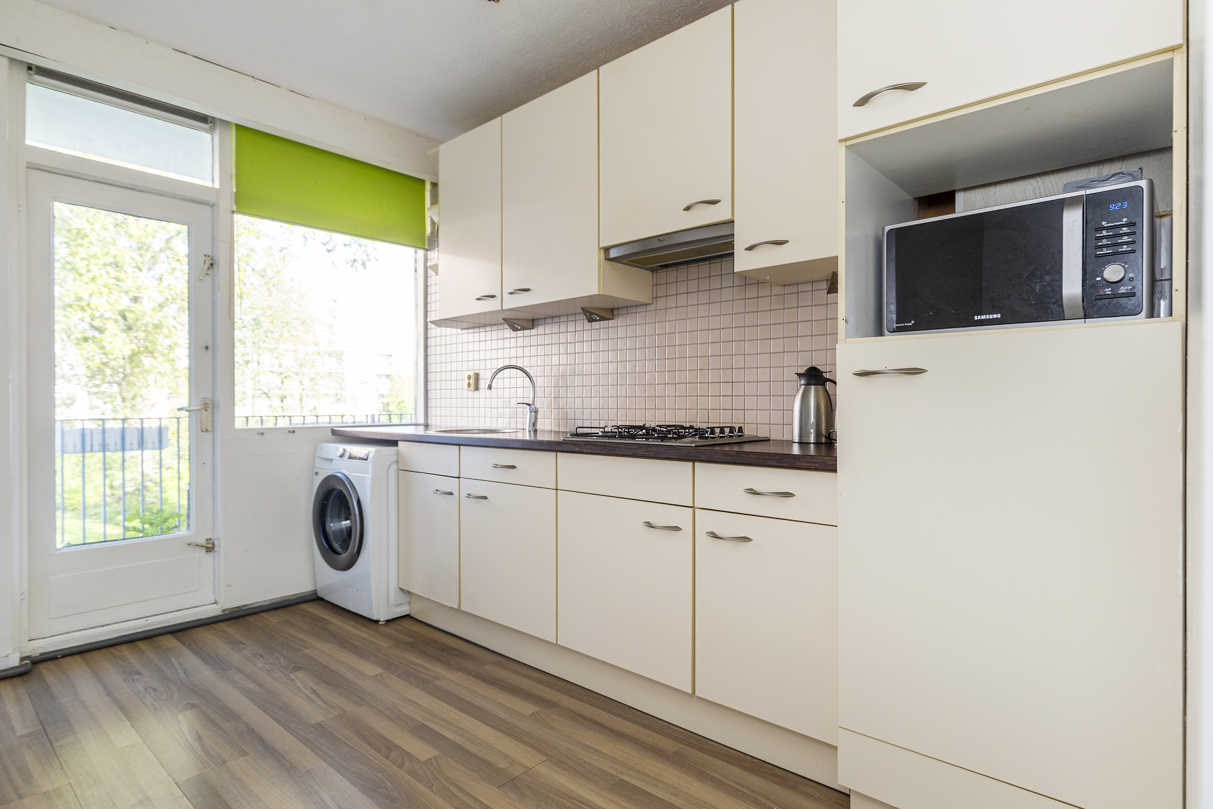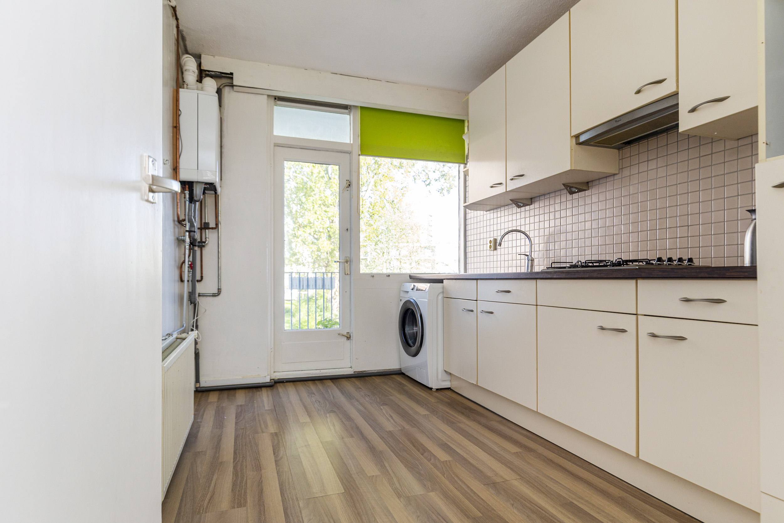 De lichte woon-/eetkamer is een prettige leefruimte met een nette laminaatvloer en grote ramen die zorgen voor veel daglicht. Vanuit de woonkamer is er toegang tot het balkon aan de voorzijde, met een vrij uitzicht over het groen. De ruime, gesloten keuken heeft een nette opstelling en is voorzien van een koelkast, 4-pits gaskookplaat, afzuigkap en een wasmachine-aansluiting. Vanuit de keuken is er toegang tot het zonnige balkon op het zuidoosten, eveneens met balkonkast.