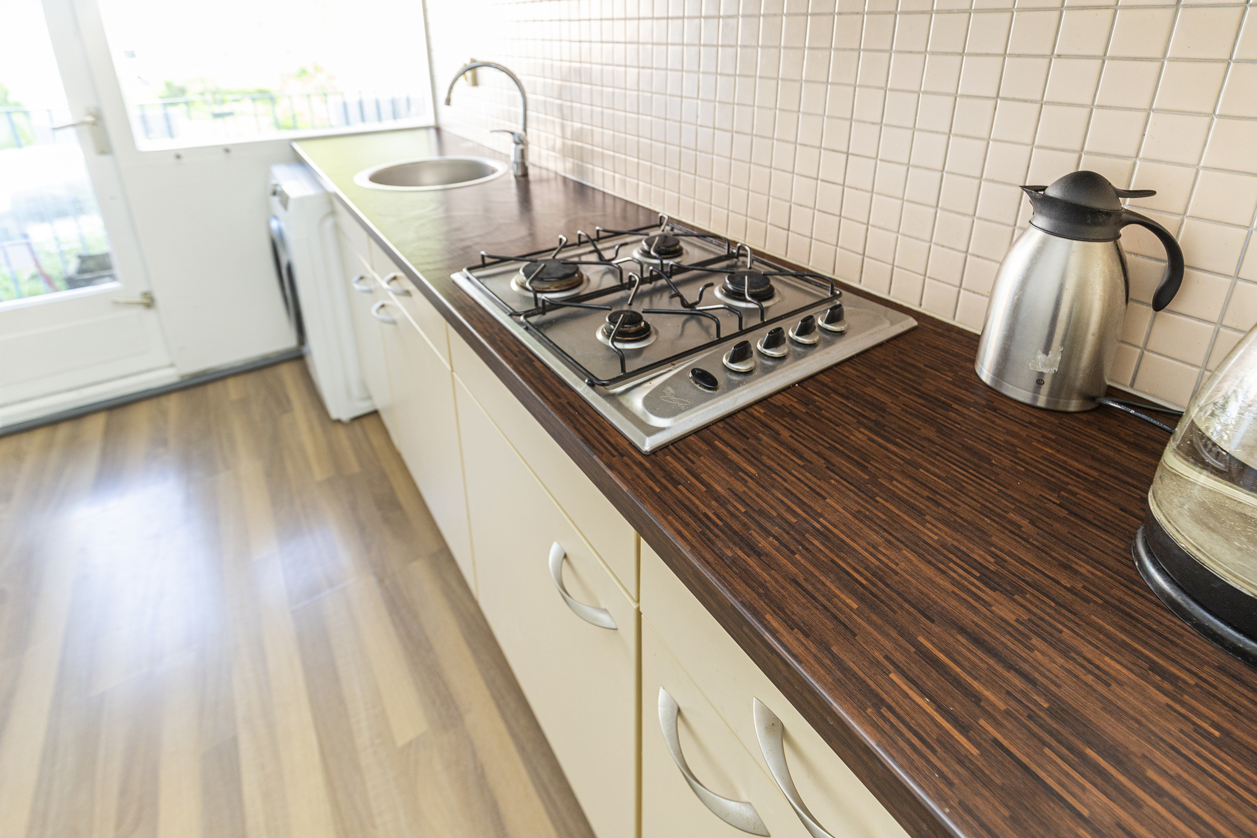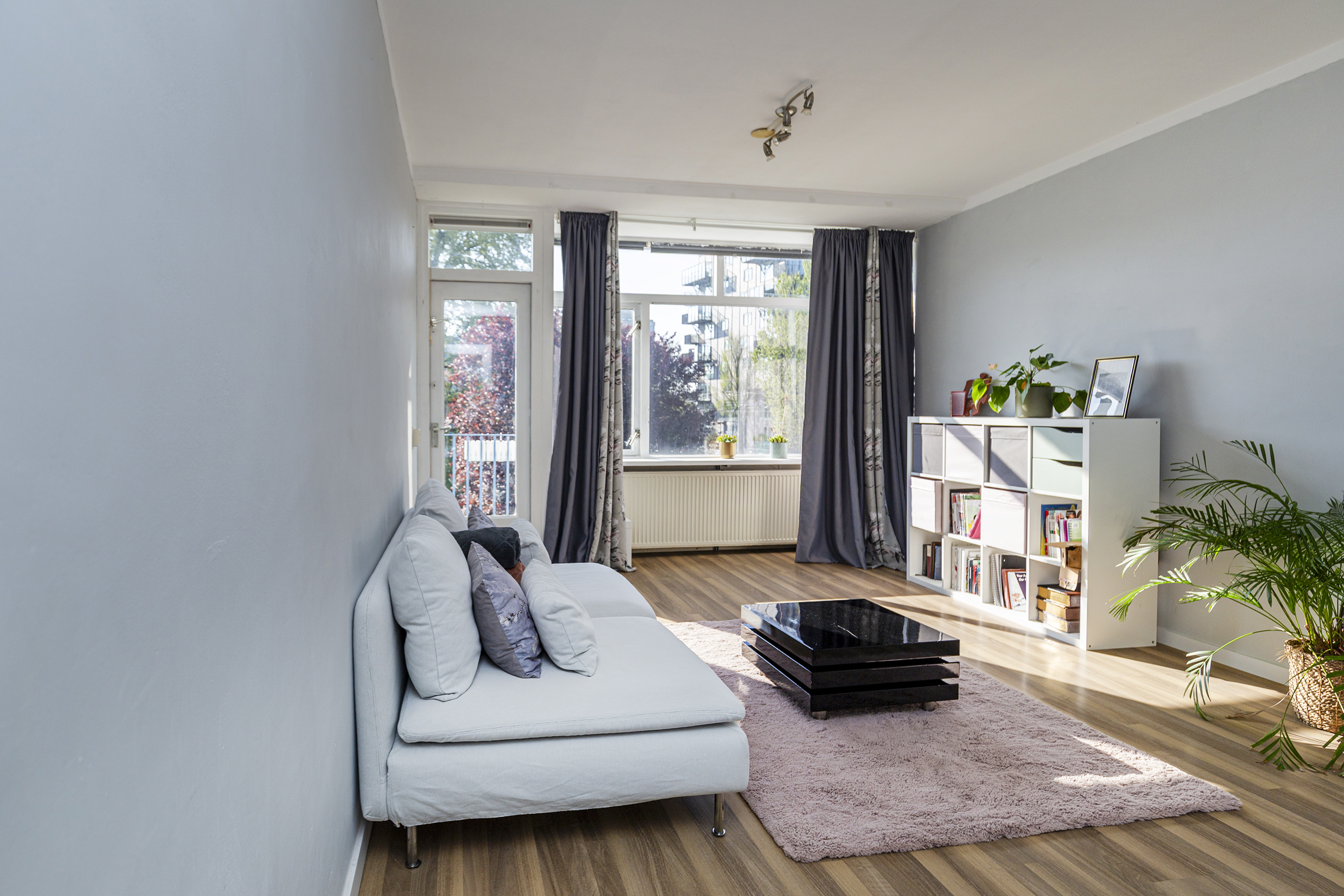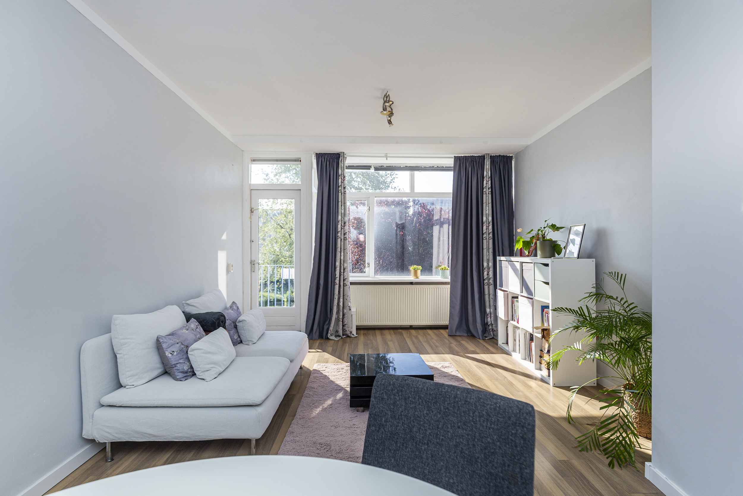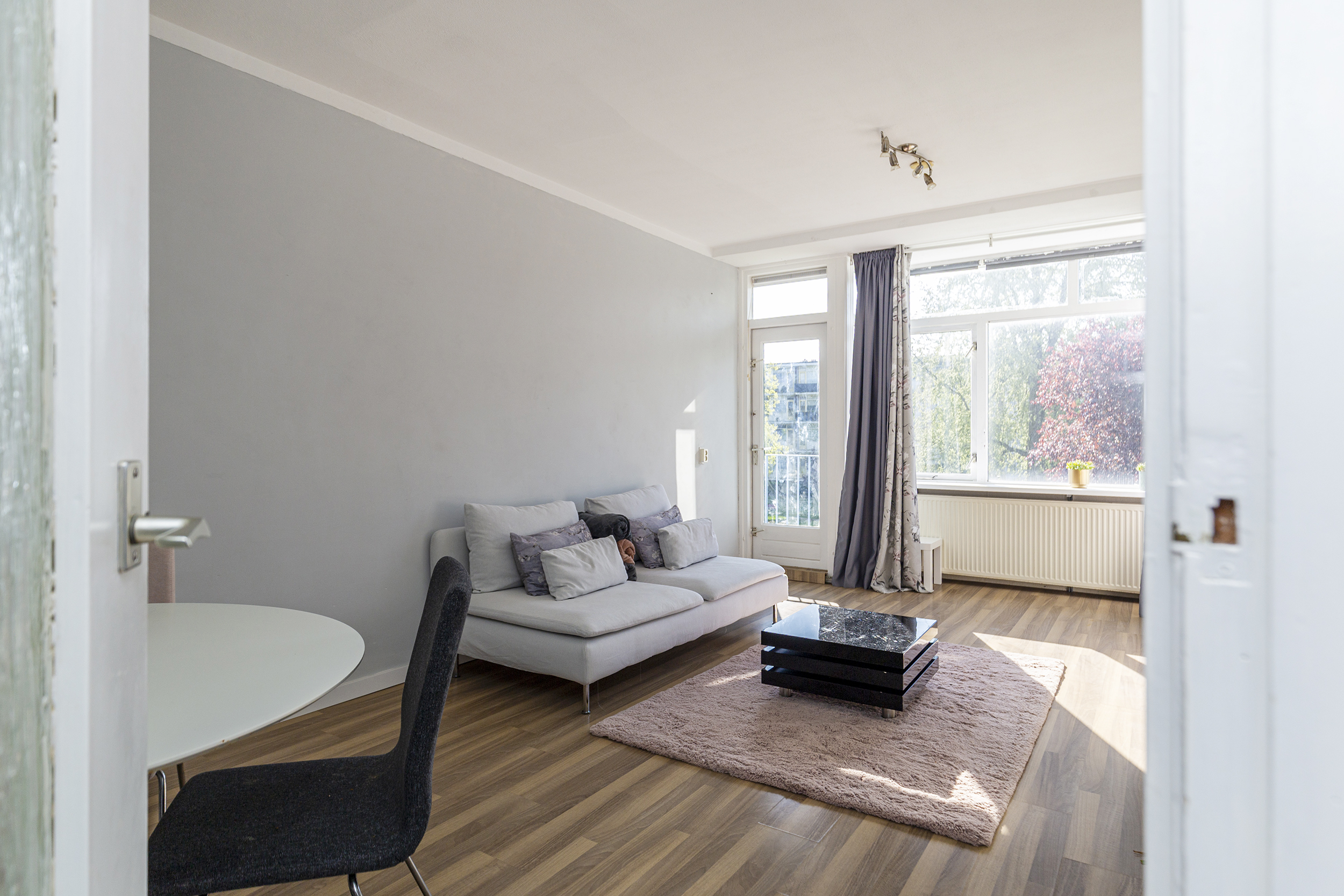 De lichte woon-/eetkamer is een prettige leefruimte met een nette laminaatvloer en grote ramen die zorgen voor veel daglicht. Vanuit de woonkamer is er toegang tot het balkon aan de voorzijde, met een vrij uitzicht over het groen. De ruime, gesloten keuken heeft een nette opstelling en is voorzien van een koelkast, 4-pits gaskookplaat, afzuigkap en een wasmachine-aansluiting. Vanuit de keuken is er toegang tot het zonnige balkon op het zuidoosten, eveneens met balkonkast.