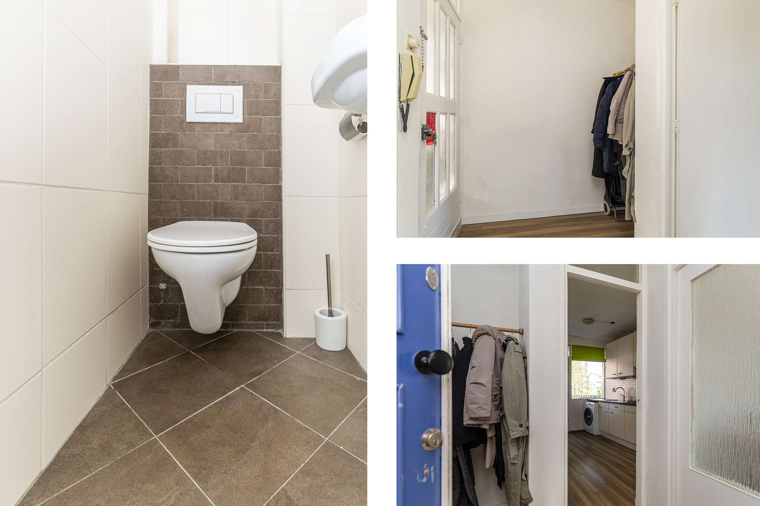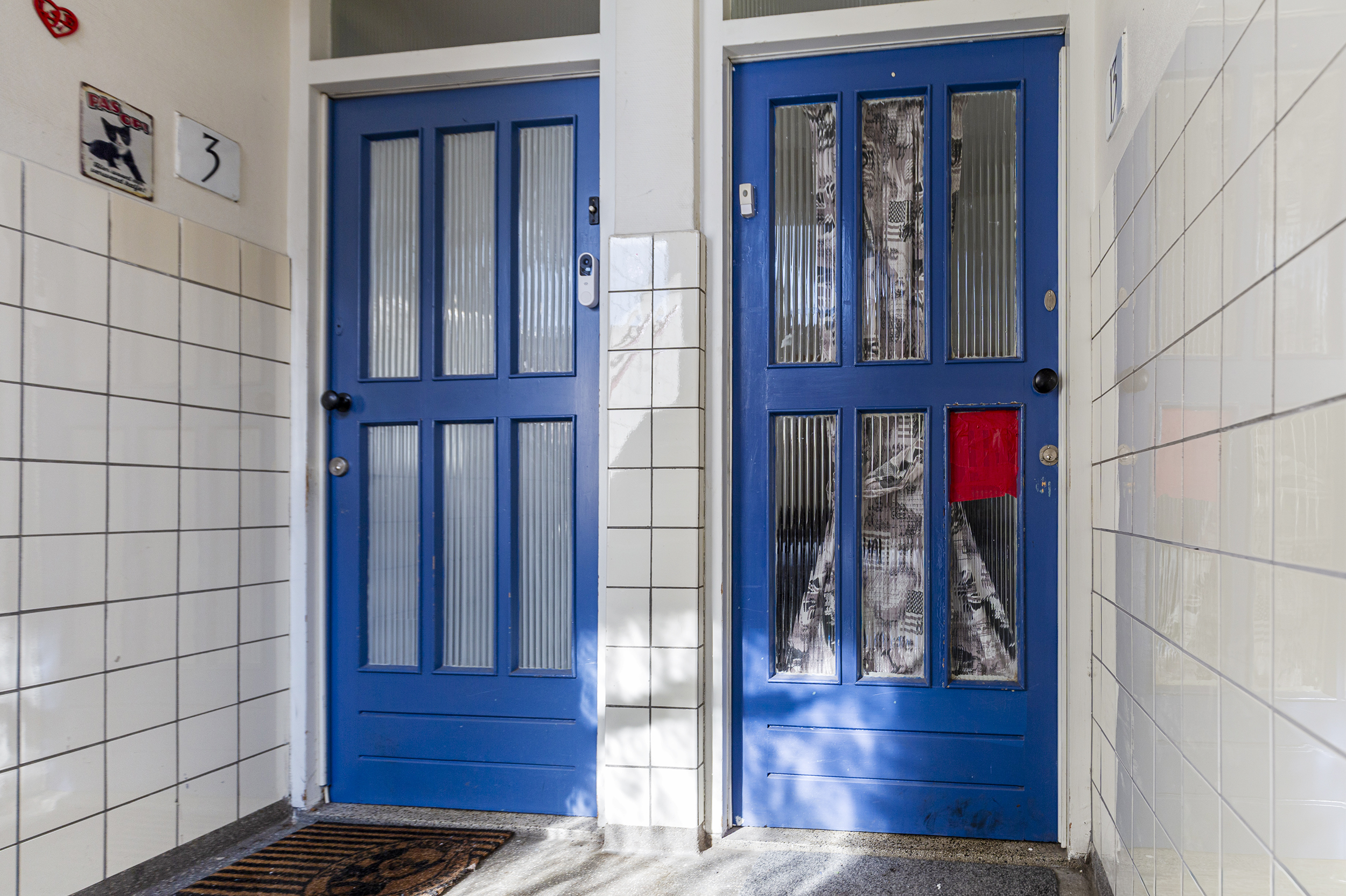 Gesloten entree met bellentableau en trappenhuis. In de onderbouw is de eigen berging aanwezig.