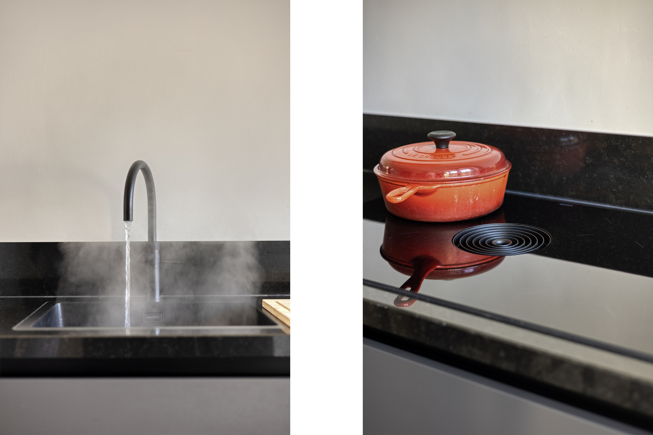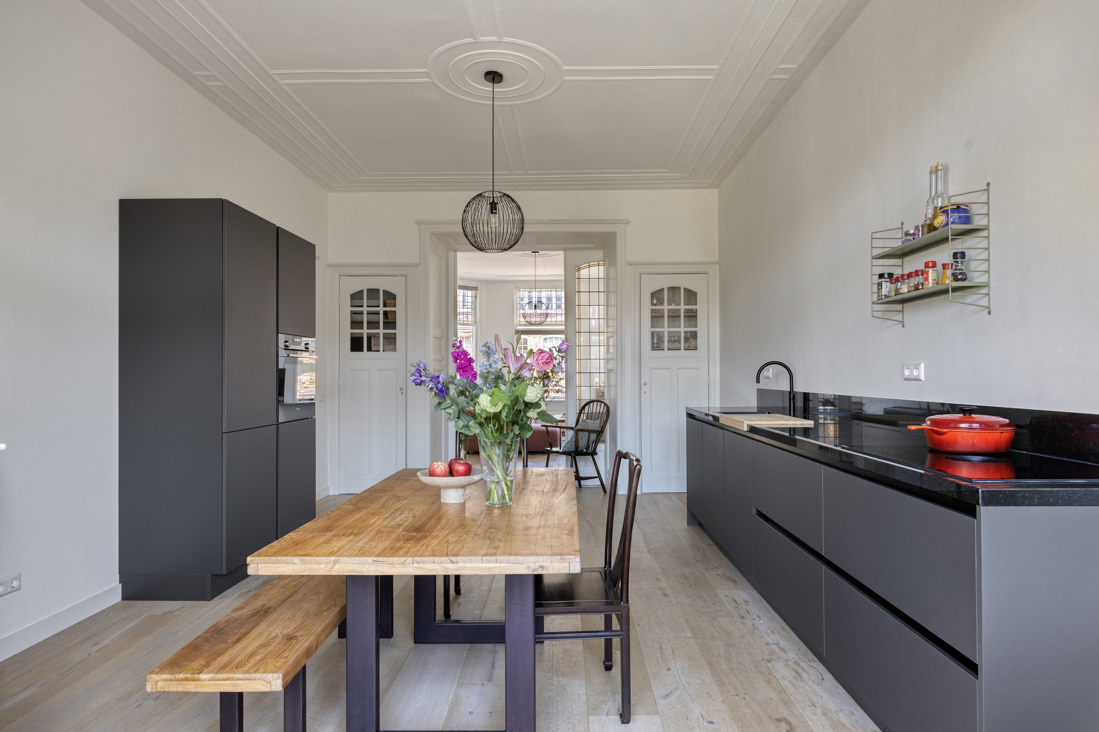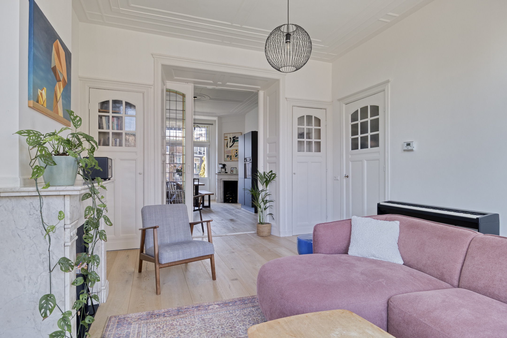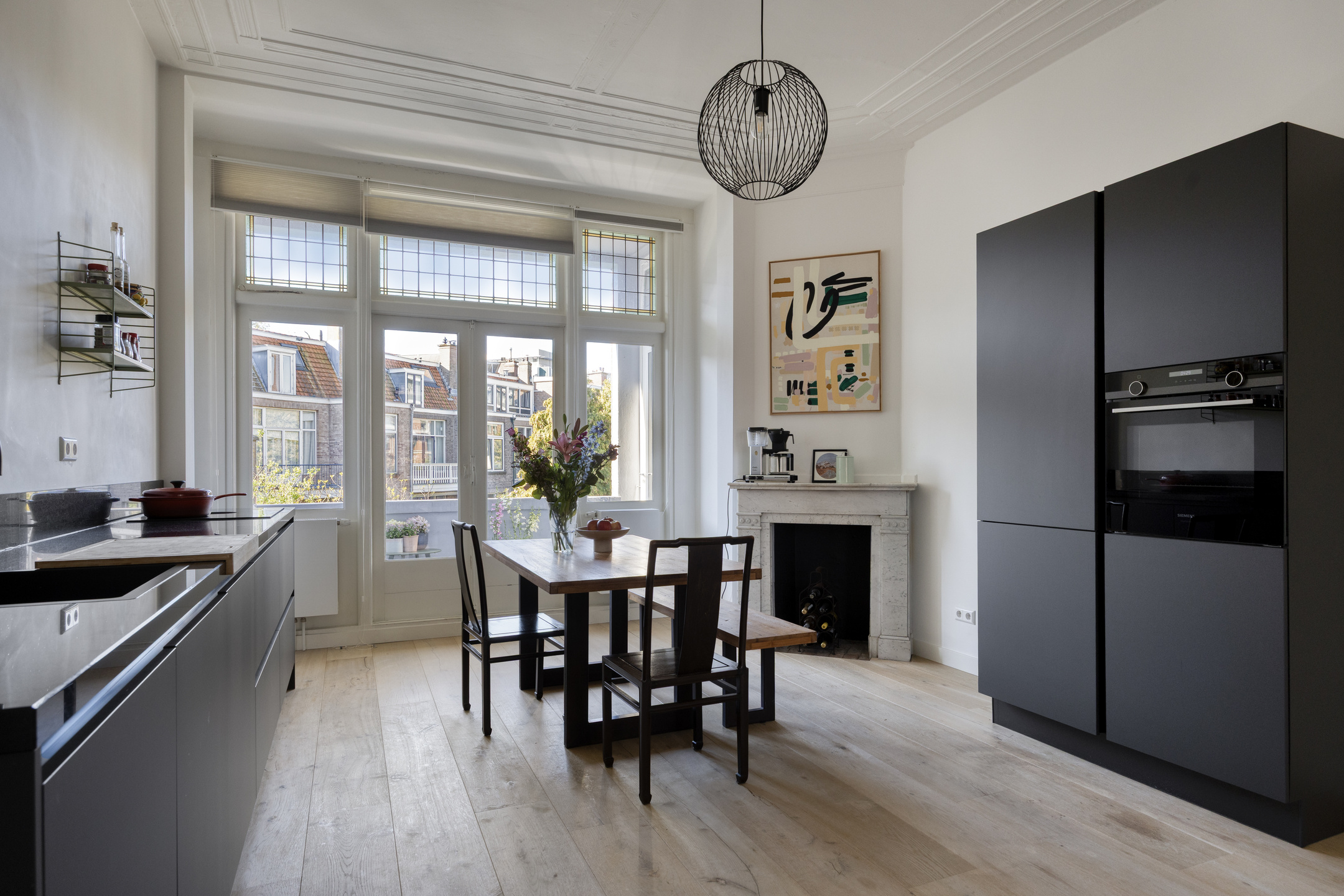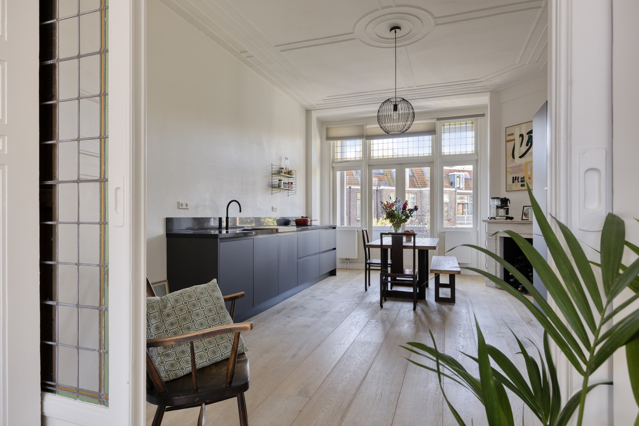 De woonkamer en suite heeft nog de originele en suite separatie met vier kasten en hoge deuren met fraai glas, twee mooie marmeren schouwen, glas-in-lood in de bovenramen (het glas-in-lood is niet geïsoleerd) aan voor-en achterzijde. In de achterkamer is een heerlijke woonkeuken gecreëerd die aansluit op de loggia, je hoeft dus niet om te lopen als je wil genieten van een hapje en een drankje in de zon. De keuken is met de volgende inbouwapparatuur van de nodige luxe voorzien: 4-zone inductiekookplaat van Bora met downdraft afzuiging, vaatwasser, Quookerkraan, koel/vriescombinatie en een oven. Alle keukenapparatuur (behalve de Bora) is van Siemens.
