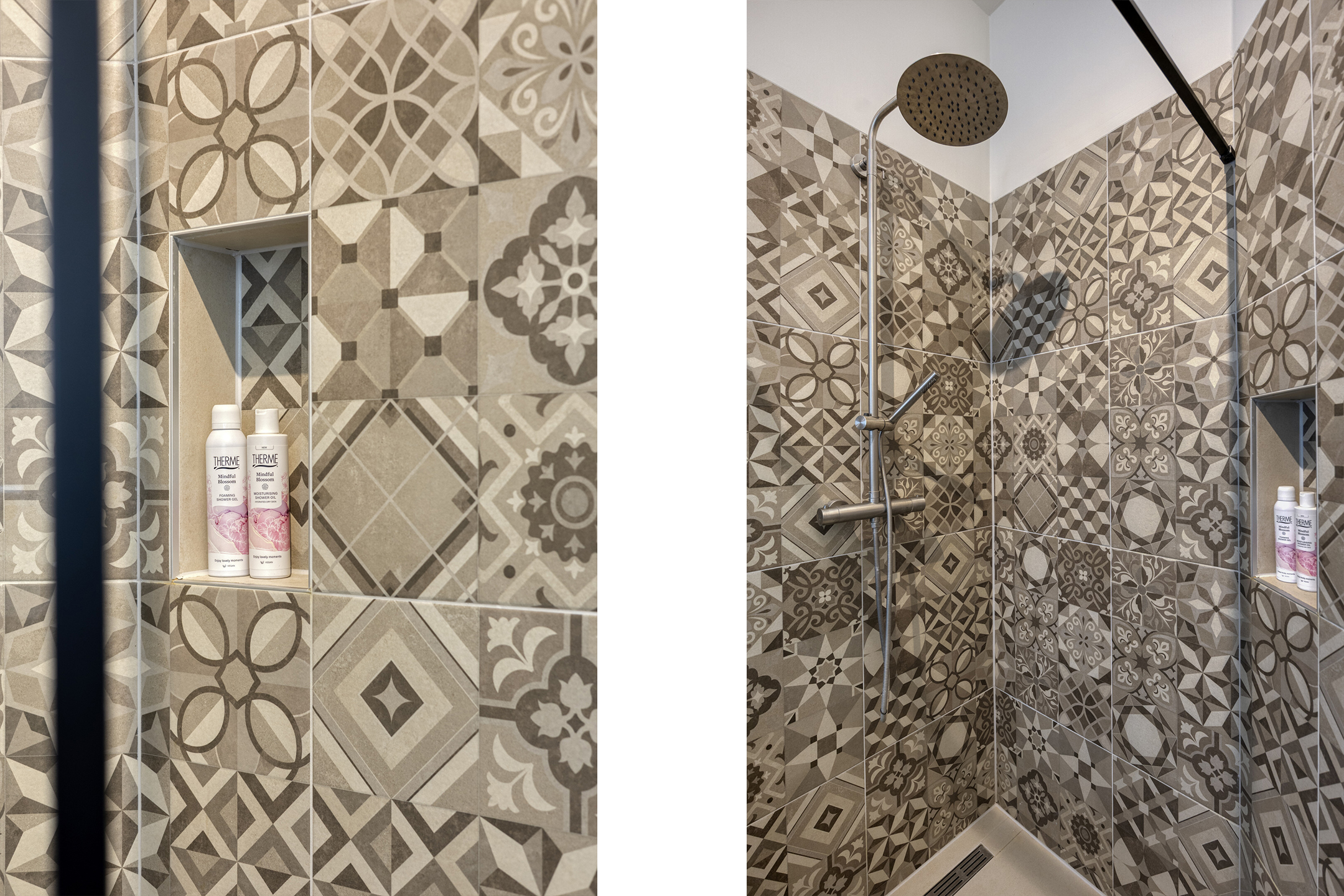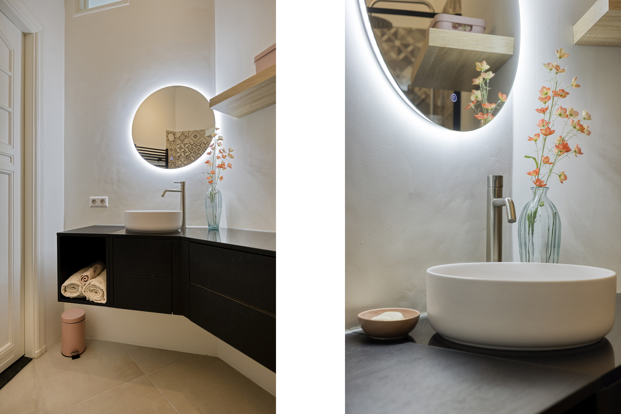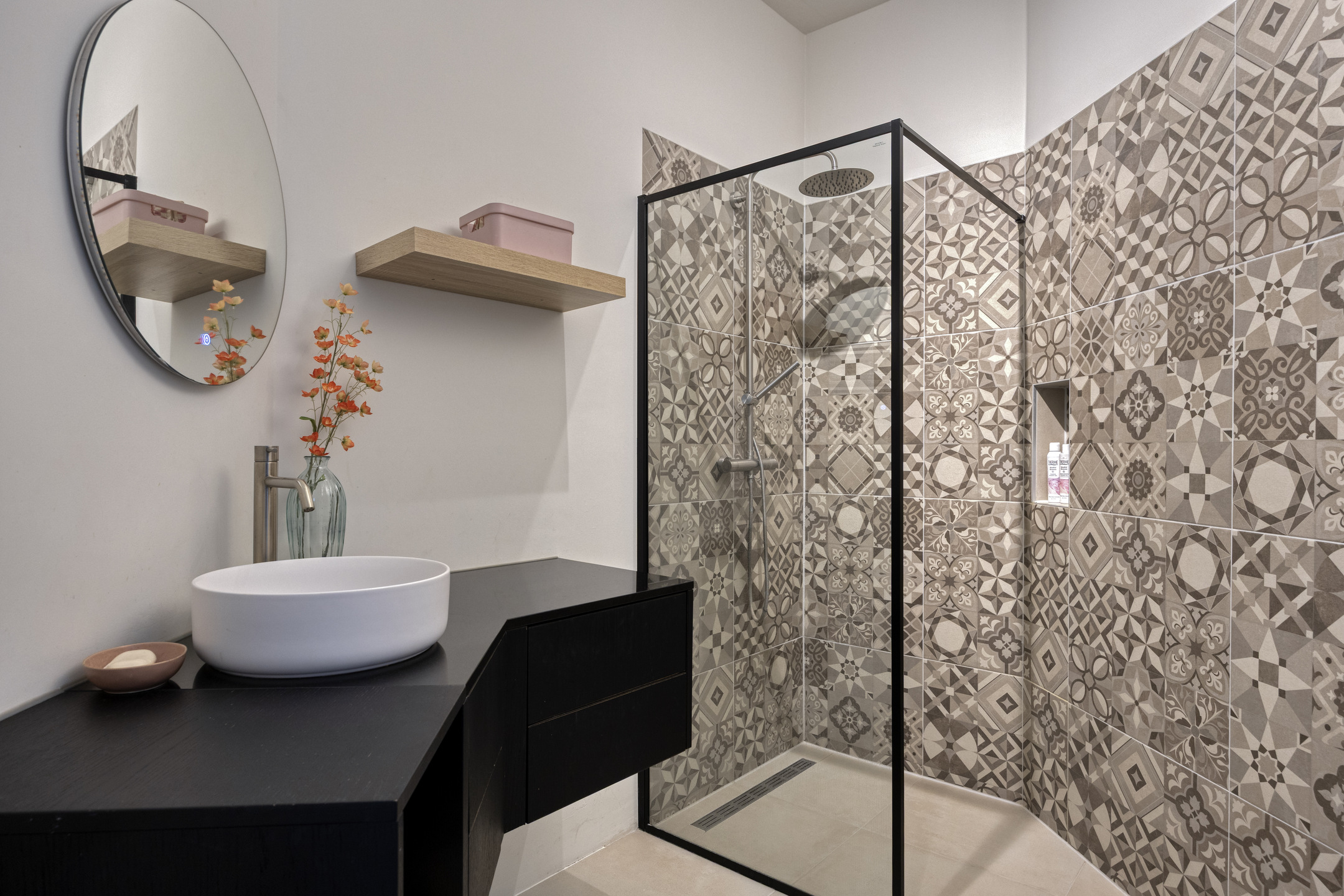 De badkamer is voorzien van een inloopdouche met stort- en handdouche, een wastafel met meubel en een designradiator die ervoor zorgt dat je jezelf 's ochtends comfortabel afdroogt met een warme droge handdoek.