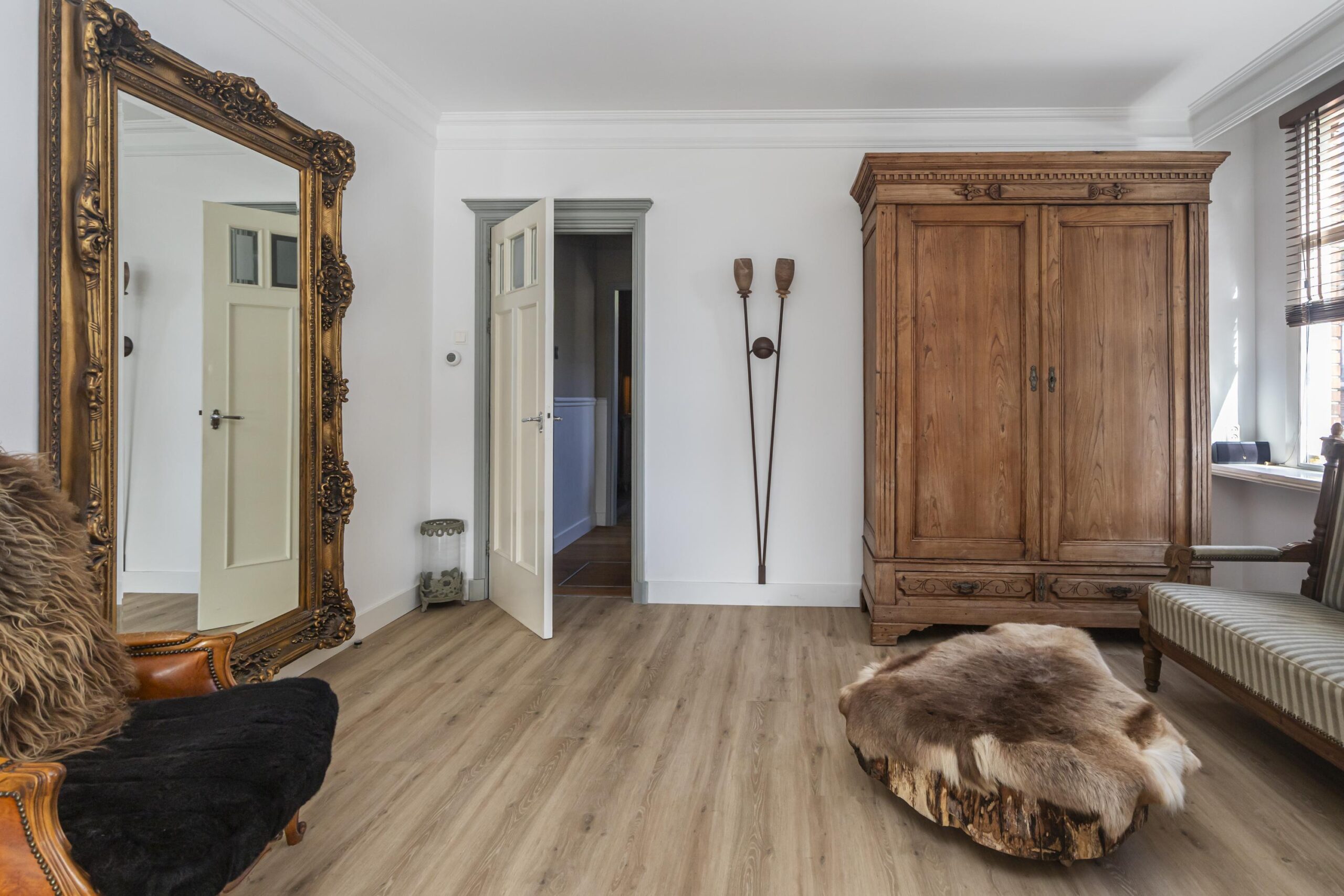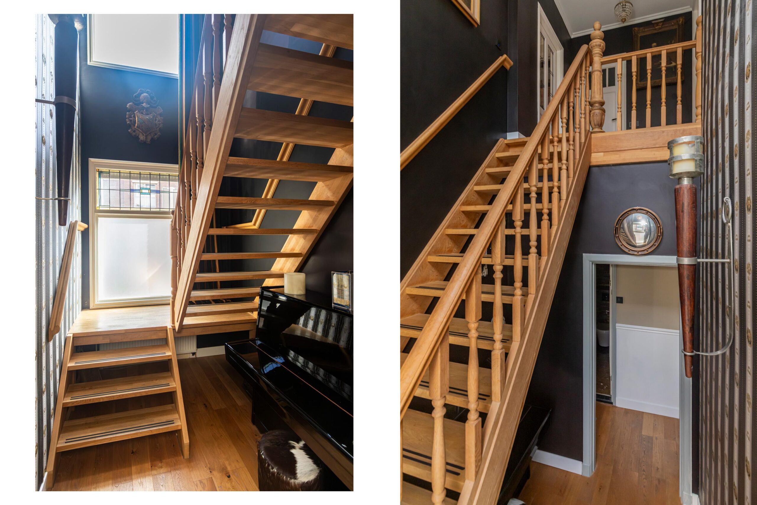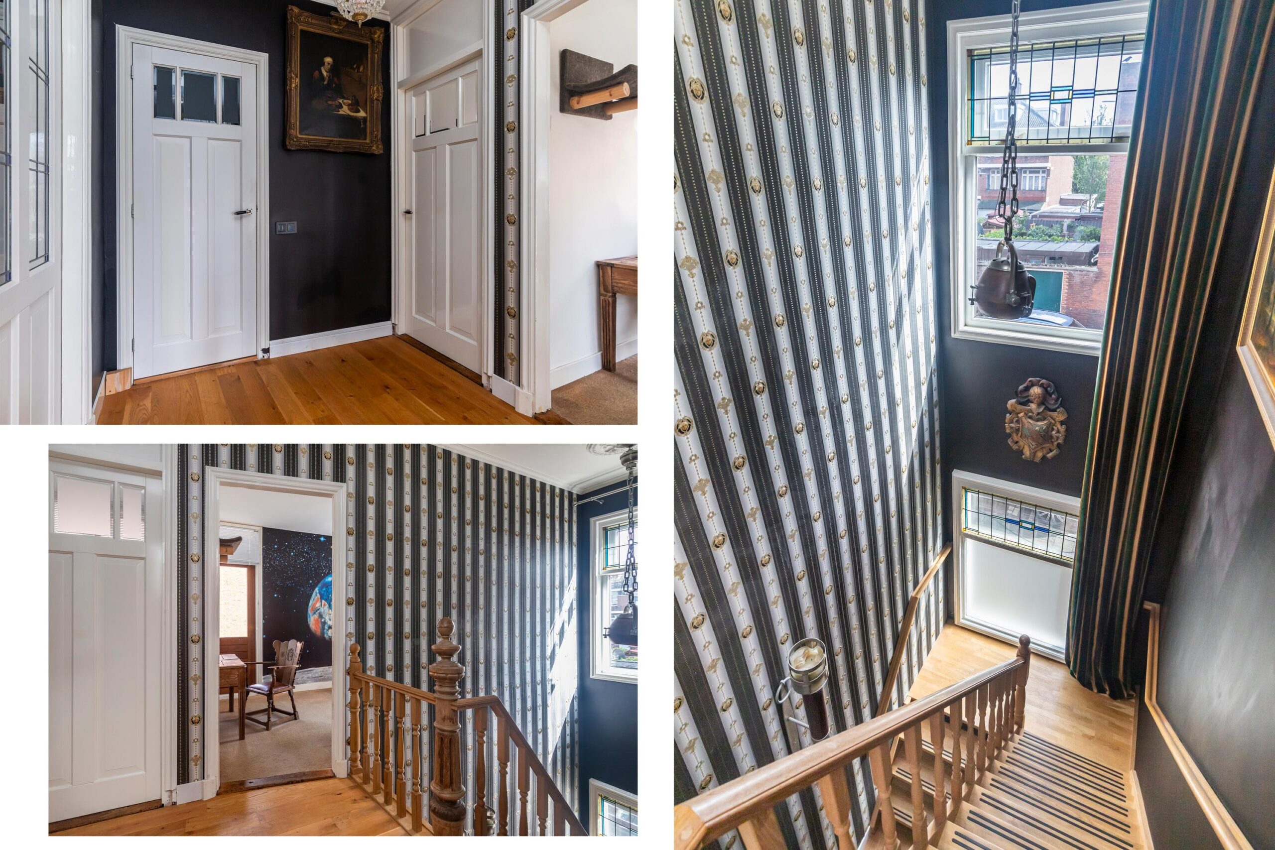 De trap leidt naar de eerste verdieping, waar je via de overloop tot een tweede toilet, uitgerust met extra voorzieningen zoals een urinoir en wastafel komt. Op deze verdieping zijn meerdere ruime kamers aanwezig, waarvan de middelste slaapkamer beschikt over vaste kasten en een natuurstenen schouw. Ook de slaapkamer voor en achter hebben authentieke details zoals natuurstenen schouwen en een separatie door middel van glas-in-lood deuren. Daarnaast is er een aparte waskamer met keukenblok en bergruimte. Zowel de waskamer als de ruime slaapkamer bieden toegang tot het balkon op het noordoosten, dat is voorzien van een balkonkast.