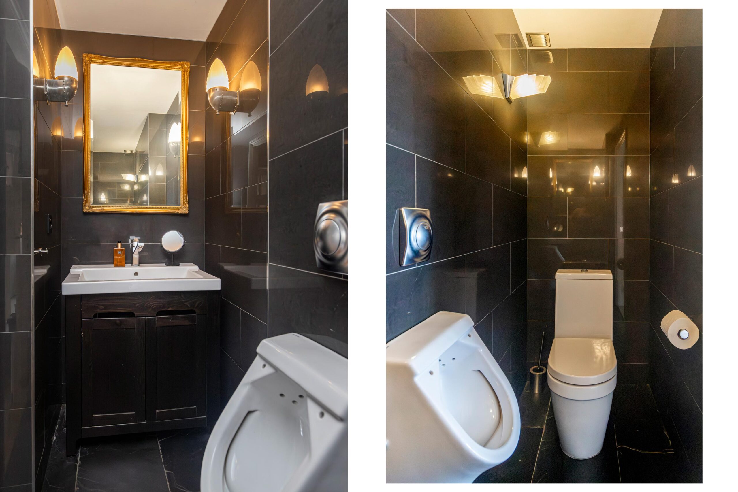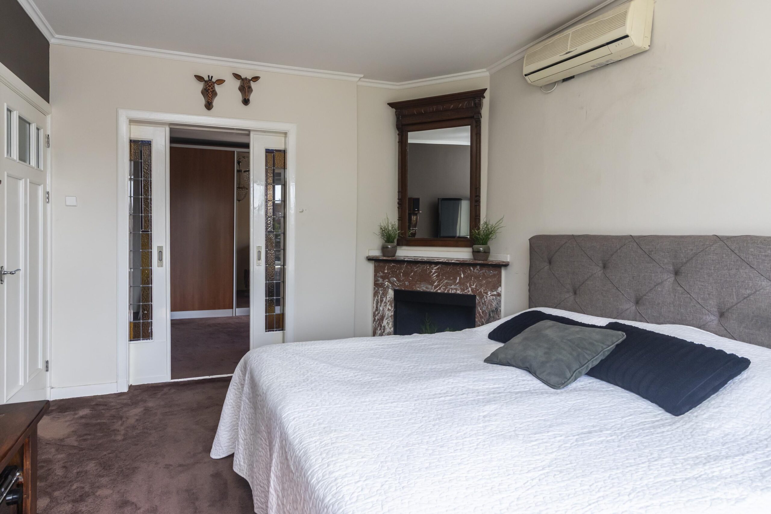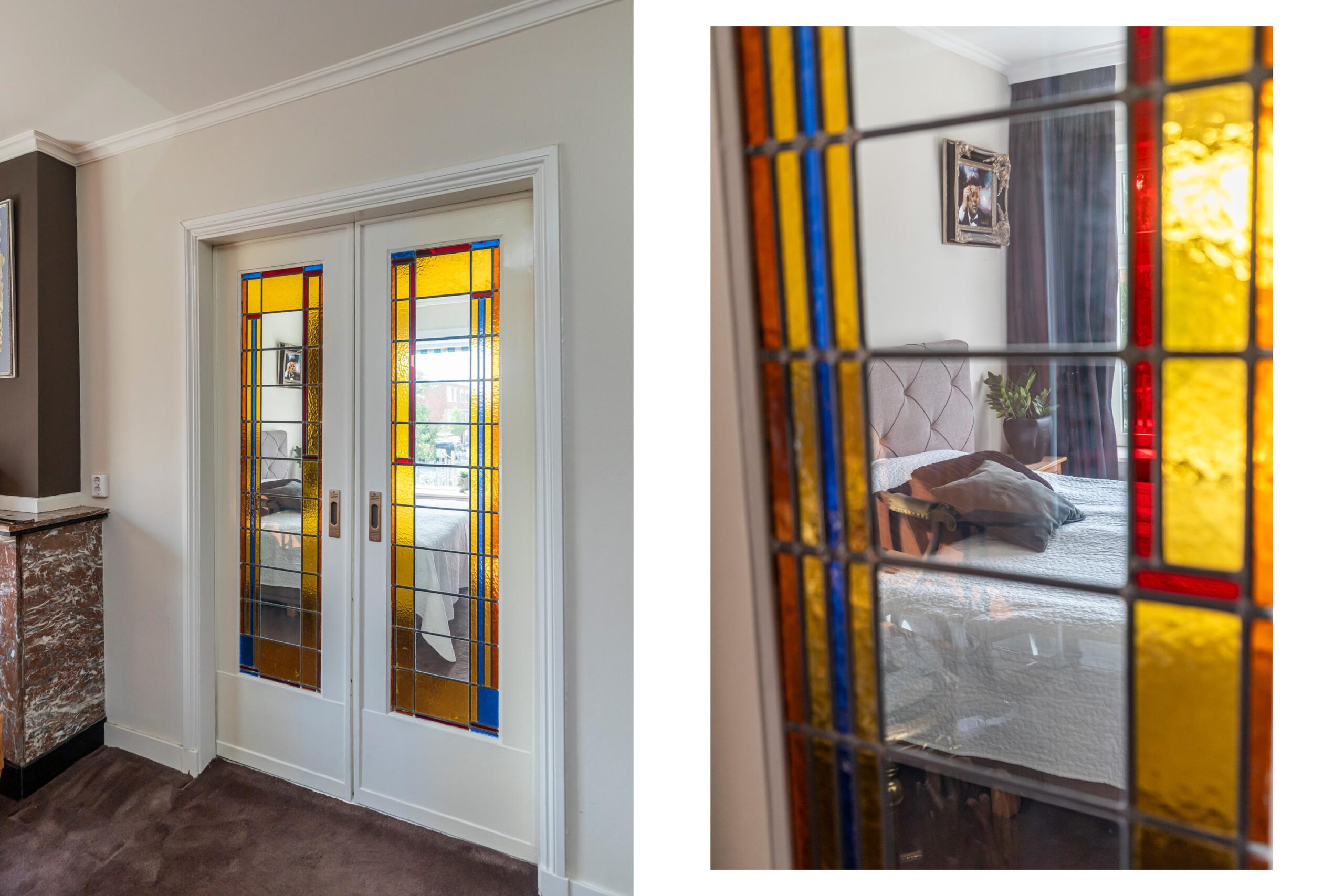 De trap leidt naar de eerste verdieping, waar je via de overloop tot een tweede toilet, uitgerust met extra voorzieningen zoals een urinoir en wastafel komt. Op deze verdieping zijn meerdere ruime kamers aanwezig, waarvan de middelste slaapkamer beschikt over vaste kasten en een natuurstenen schouw. Ook de slaapkamer voor en achter hebben authentieke details zoals natuurstenen schouwen en een separatie door middel van glas-in-lood deuren. Daarnaast is er een aparte waskamer met keukenblok en bergruimte. Zowel de waskamer als de ruime slaapkamer bieden toegang tot het balkon op het noordoosten, dat is voorzien van een balkonkast.
