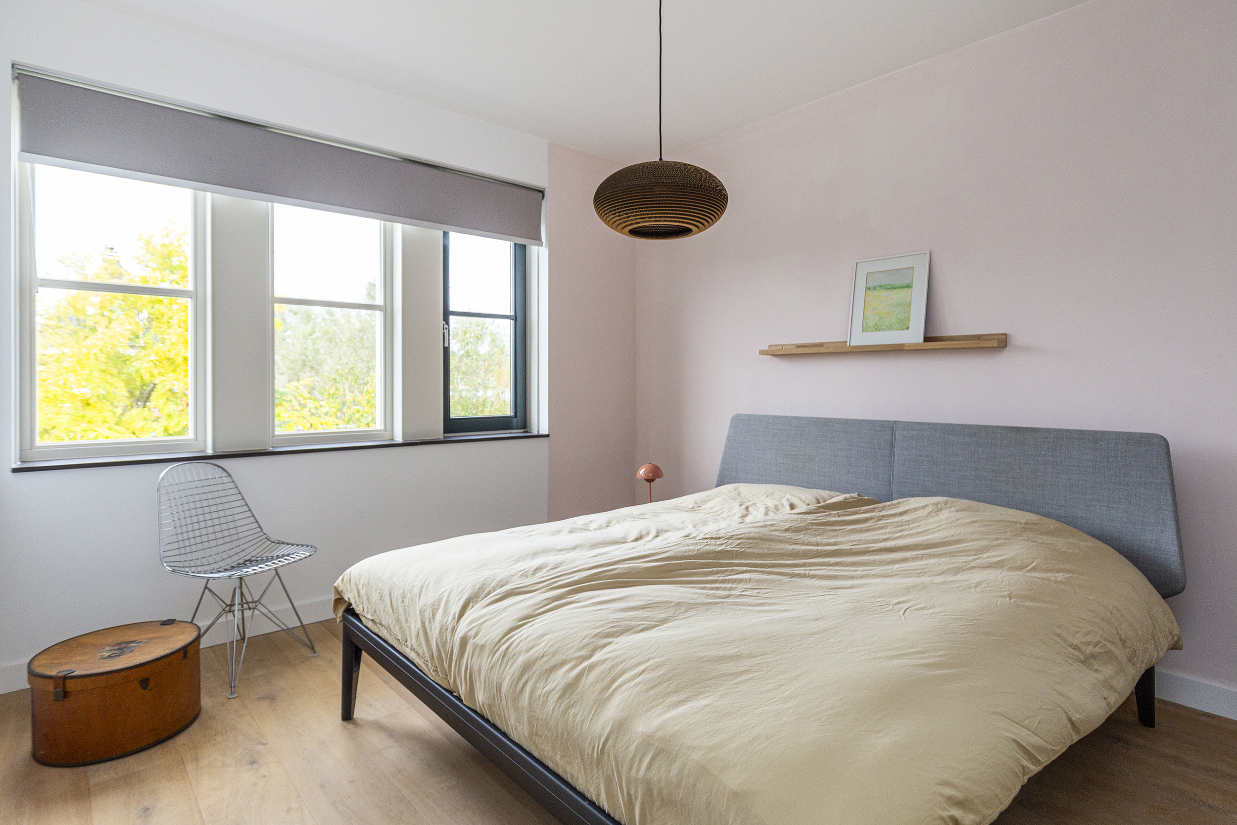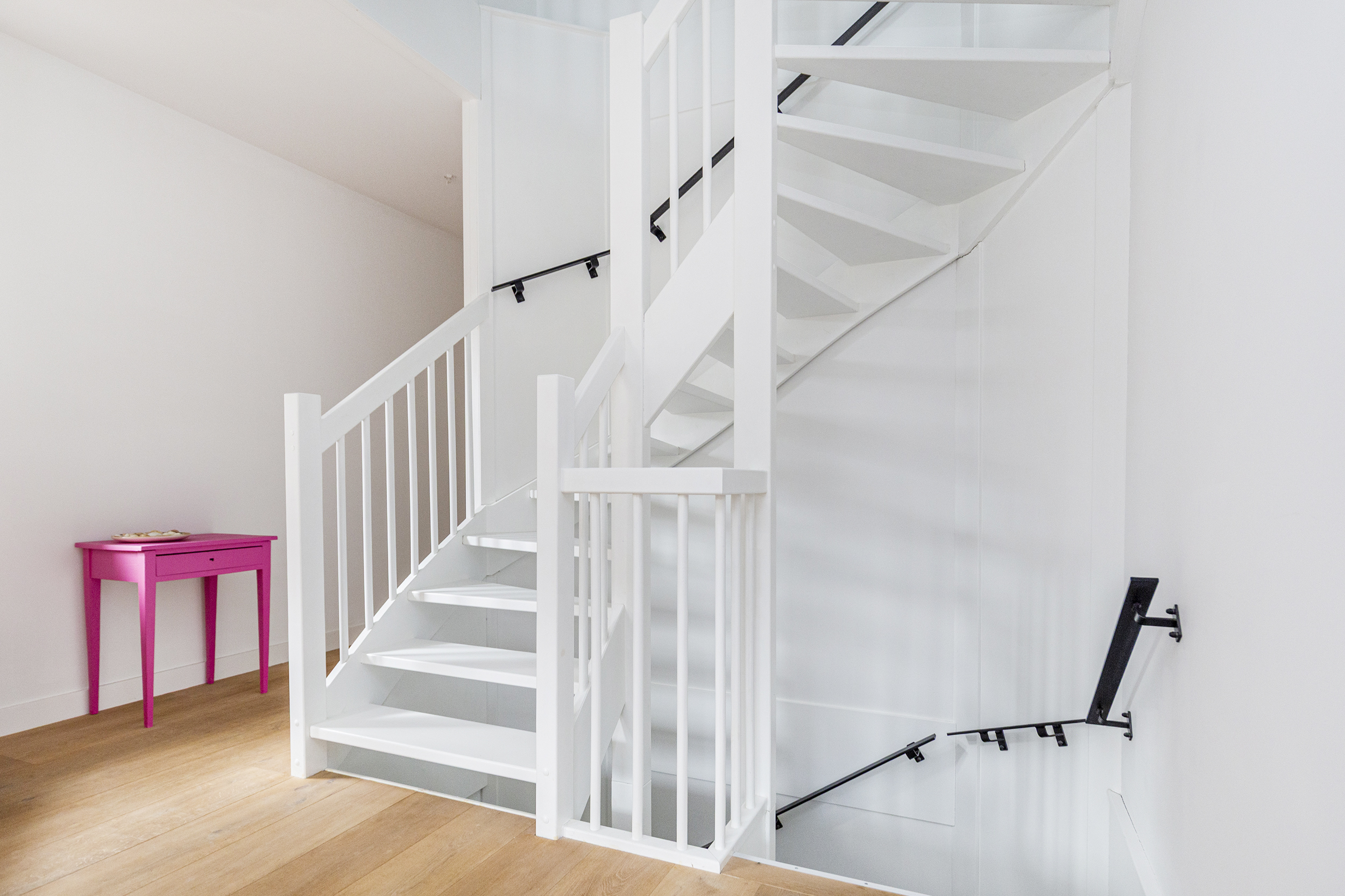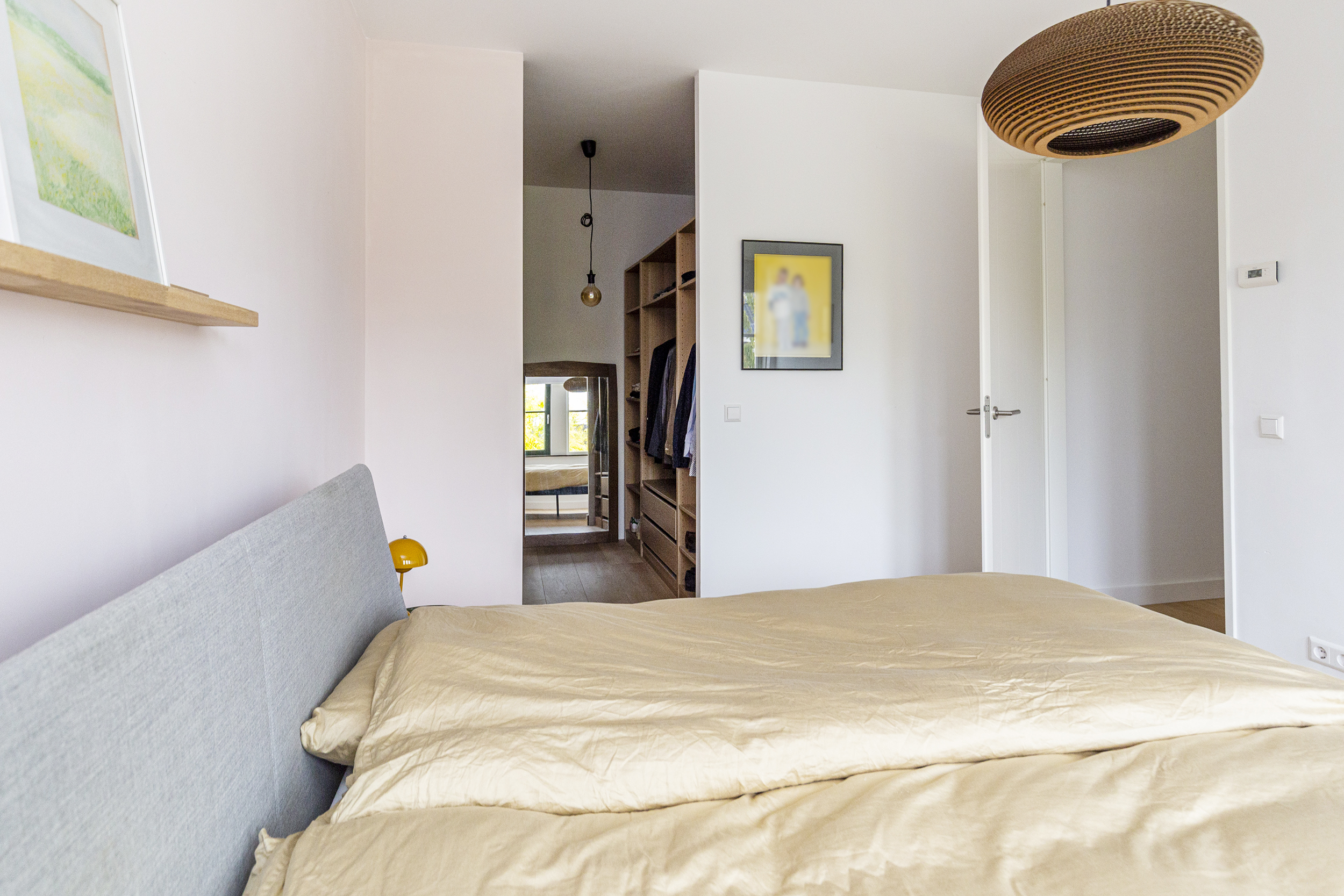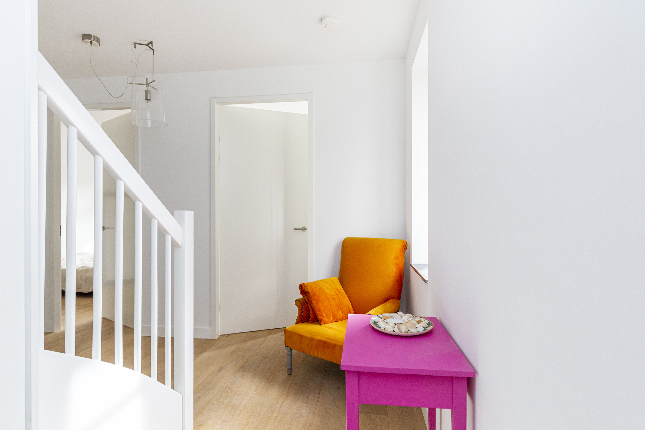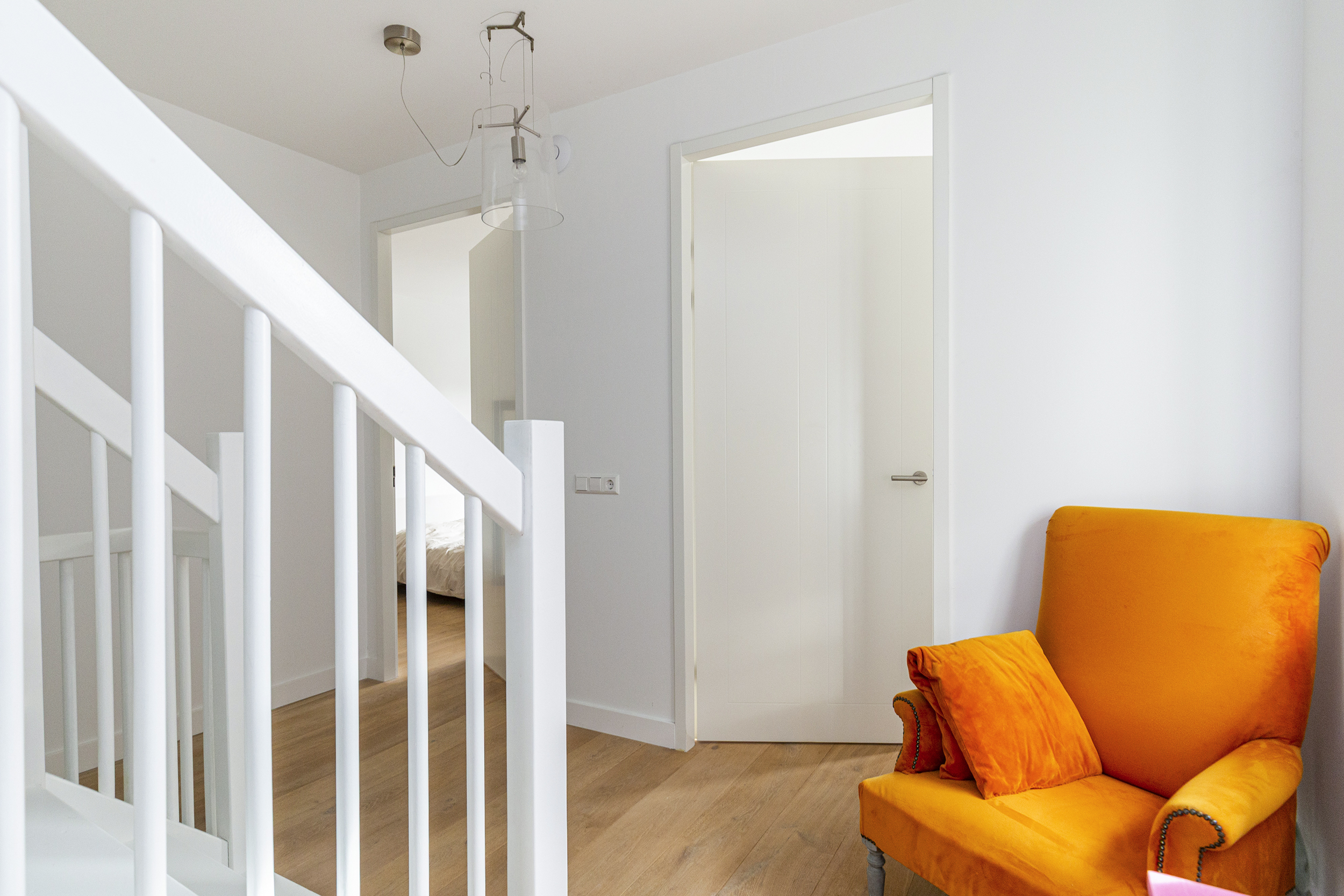 Overloop met toegang tot drie kamers: een voorslaapkamer, een zijkamer en een royale master bedroom aan de achterzijde, voorzien van een ruime inloopkast, en een houten parketvloer gecombineerd met vloerverwarming.