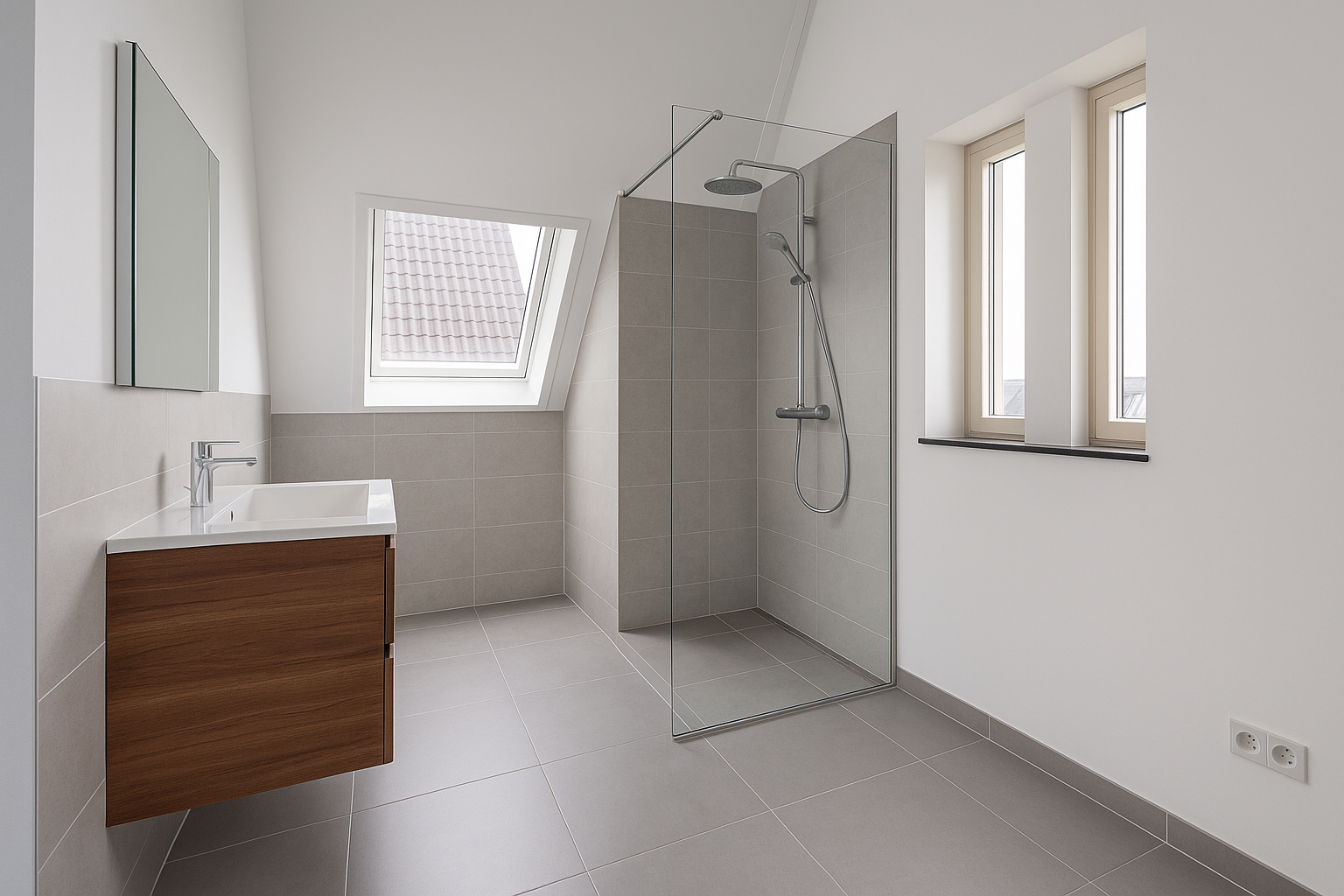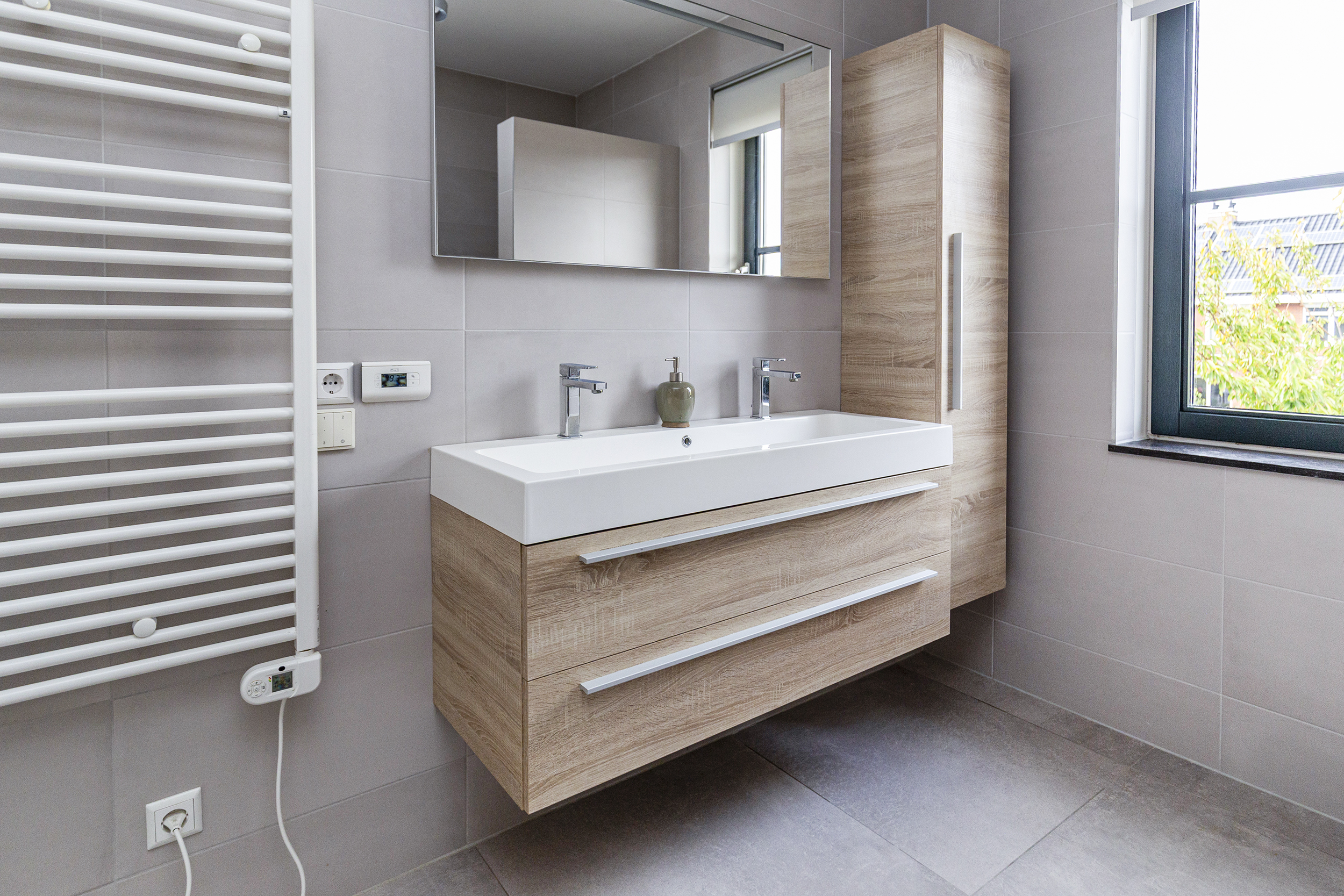 De badkamer is stijlvol afgewerkt en uitgevoerd met toilet, inloopdouche, dubbel wastafelmeubel en radiator.