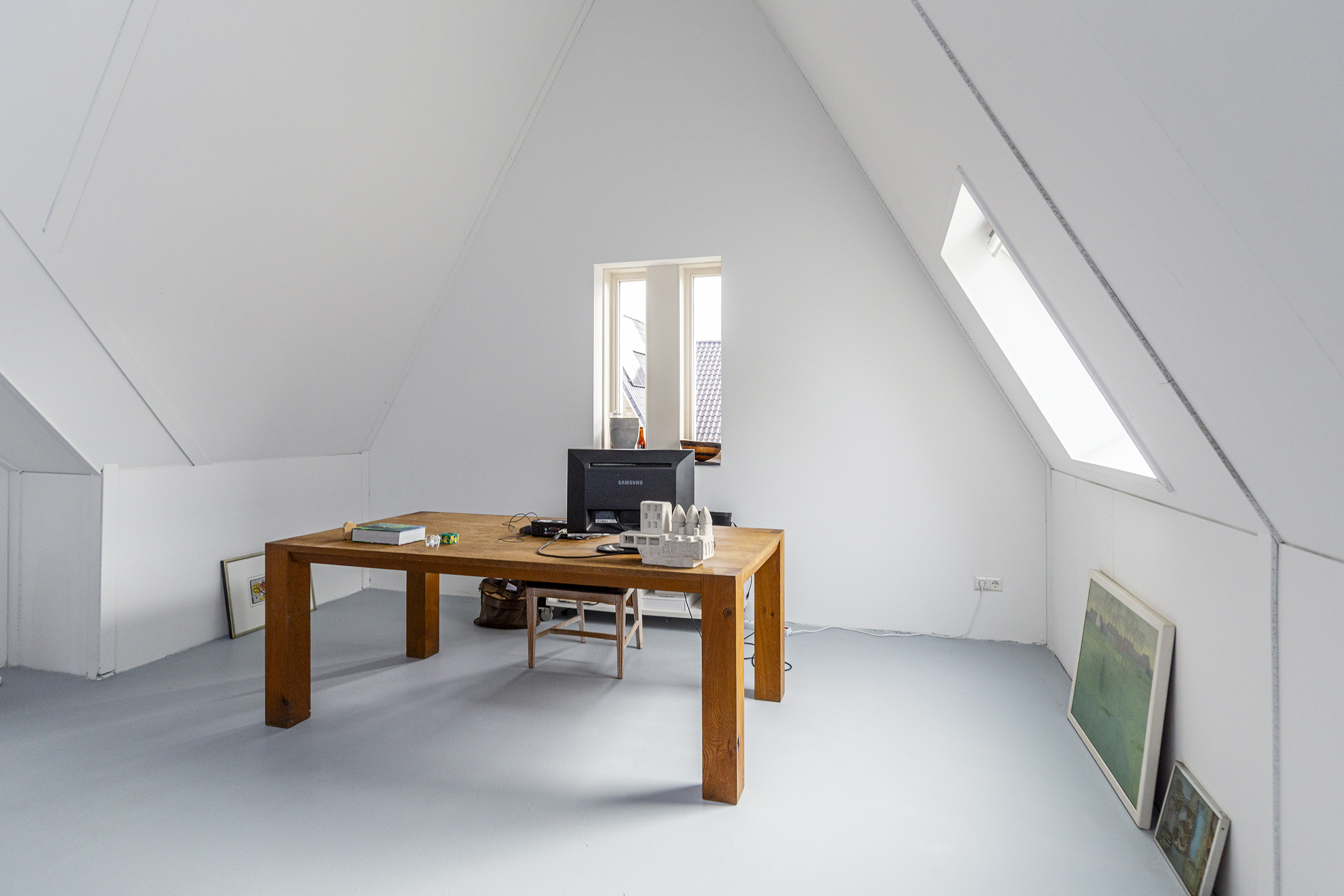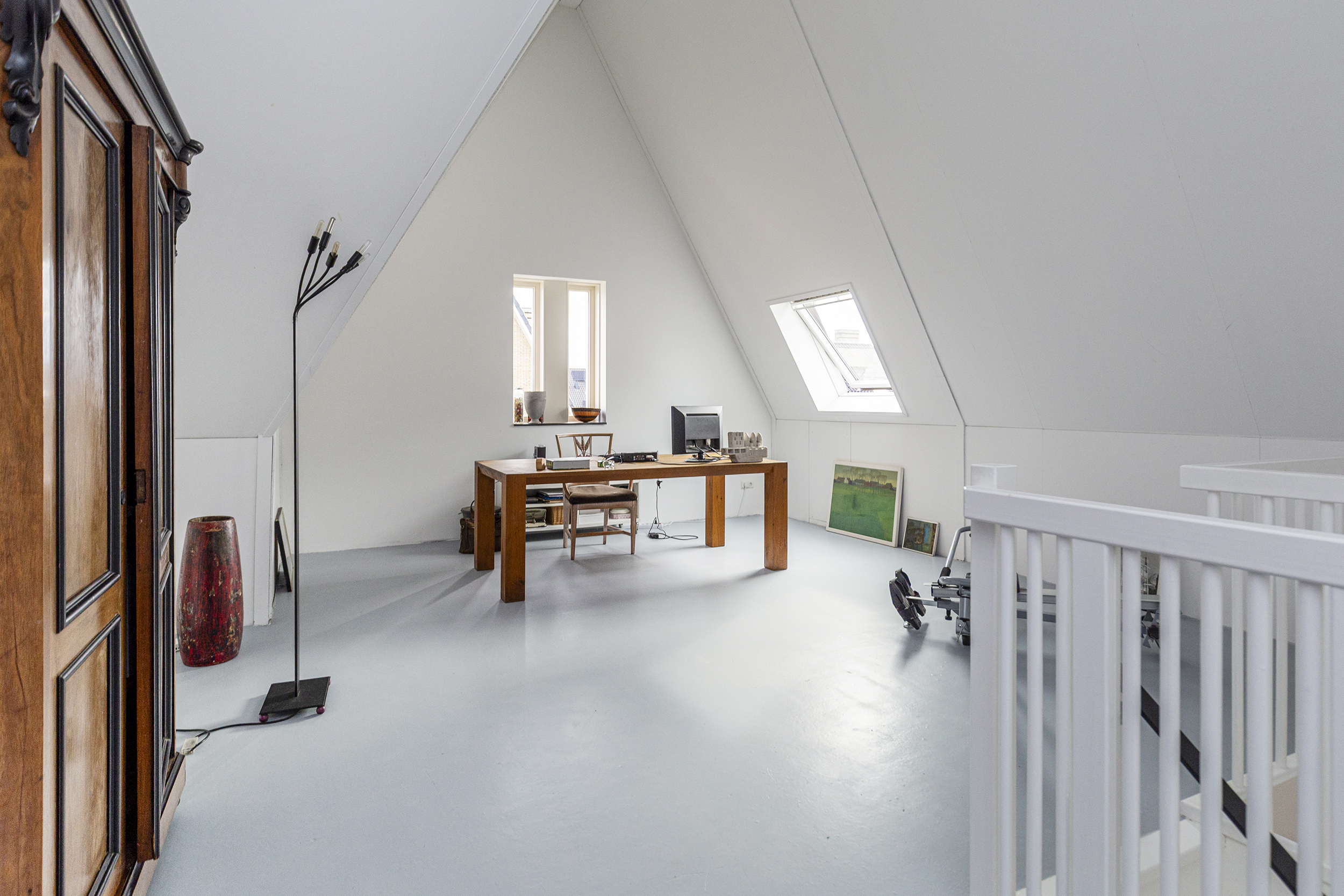 Ruime open zolderruimte met bergruimte achter de knieschotten en twee Velux-dakramen, voorzien van vloerverwarming. In de technische ruimte zijn de wasmachineaansluiting en de opstelplaats van de hybride warmtepomp en mechanische ventilatie ondergebracht. In de achterruimte is de voorbereiding getroffen voor een tweede badkamer. Dankzij de hoge nokhoogte is deze zolderverdieping een veelzijdige ruimte met potentie voor extra kamers of gebruik op maat.