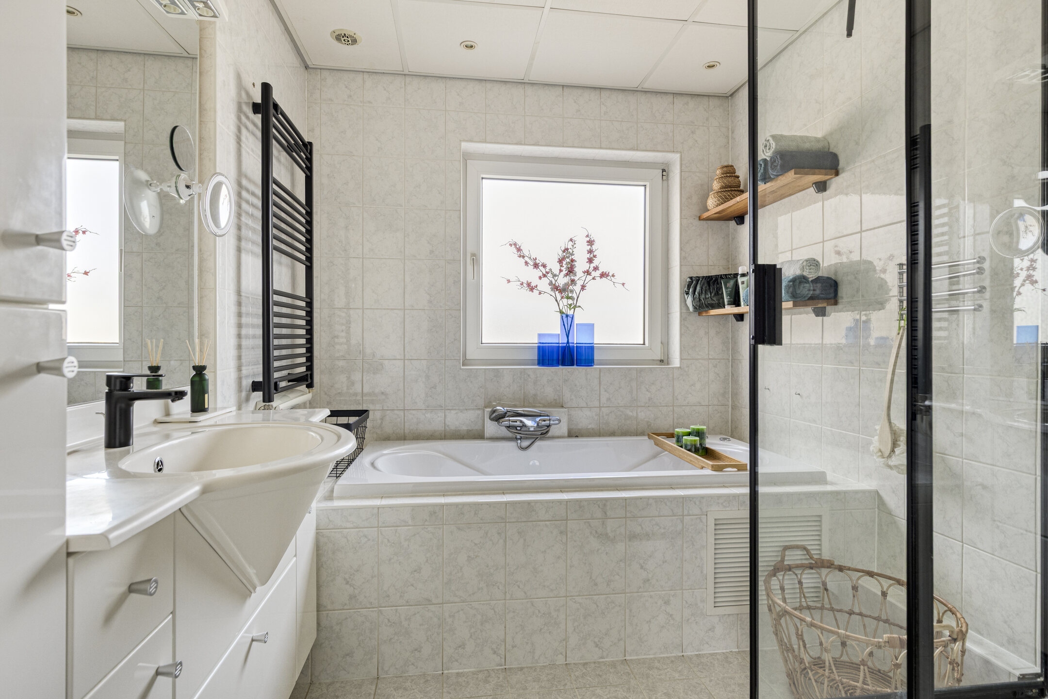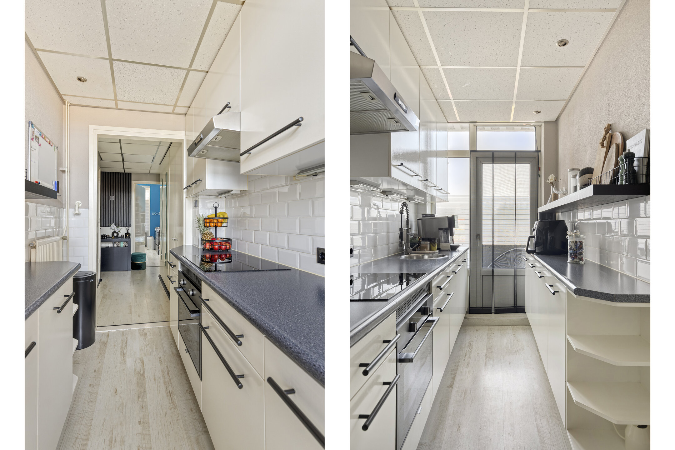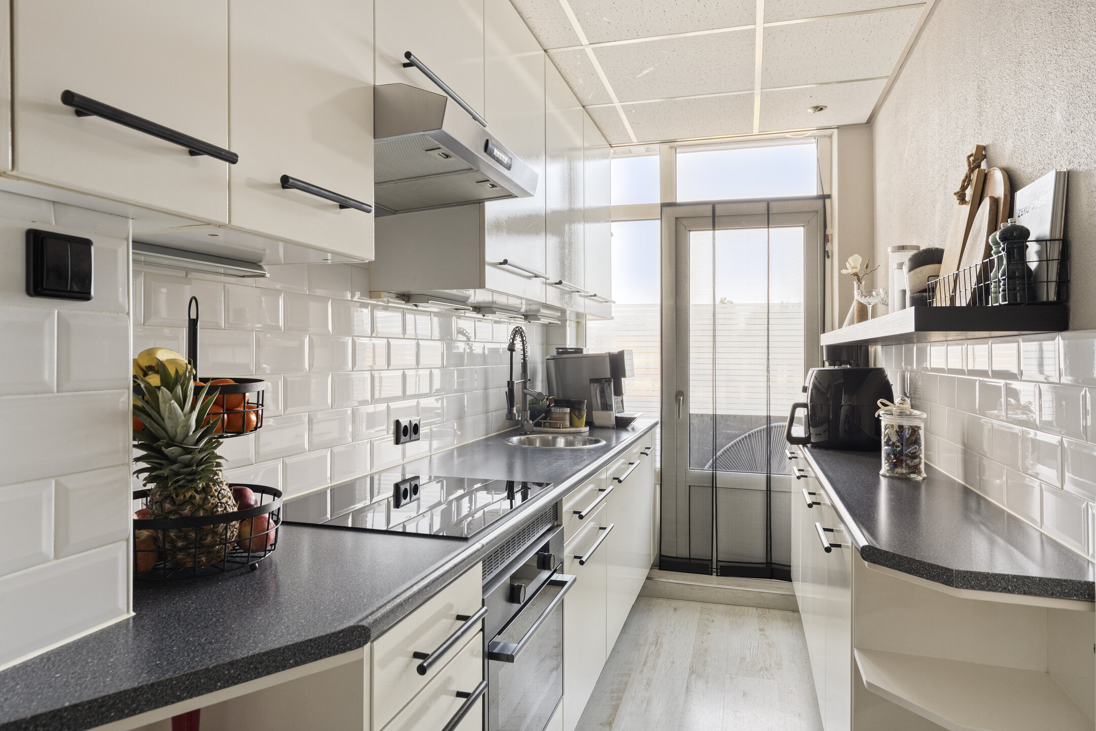 De dichte keuken is uitgevoerd in een lichte kleurstelling, beschikt over diverse keukenapparatuur (geplaatst in 2021) en heeft een deur naar het kleinere balkon aan de voorzijde van het complex. De badkamer is compleet ingericht met een ligbad met whirlpoolfunctie, een douchecabine met streamers en een wastafelmeubel.