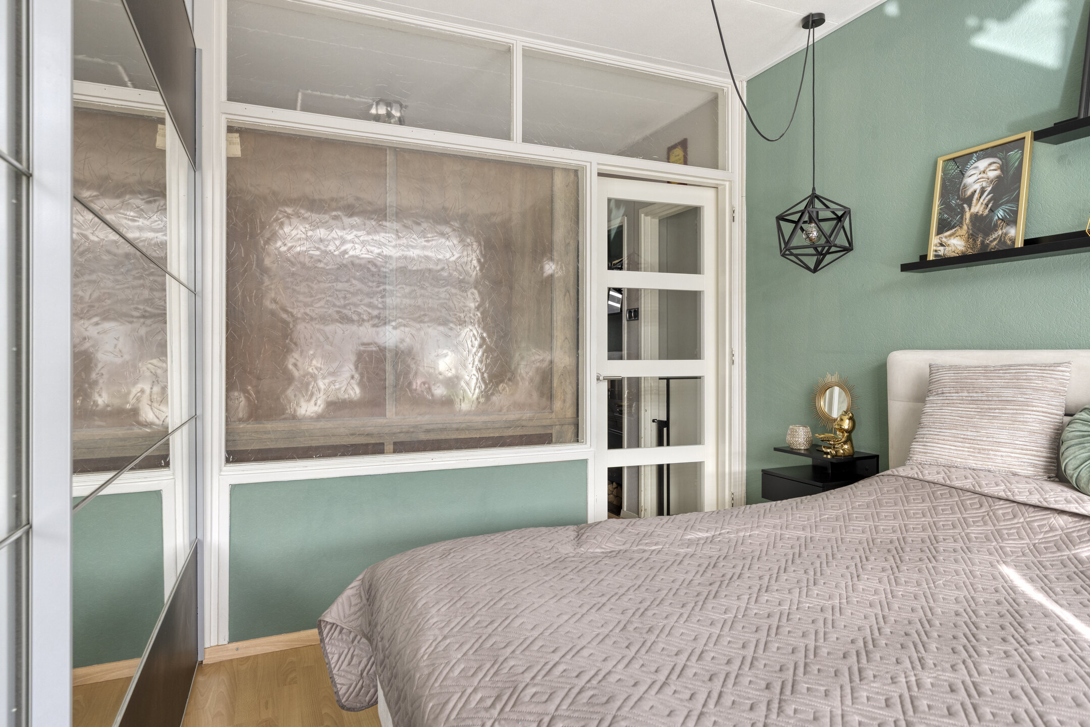 Entree van de woning, hal met toilet, vaste kast, vaste kast met opstelplaats cv-installatie en toegang tot de verschillende vertrekken. De woonkamer is licht en prettig van formaat, met grote raampartijen die zorgen voor een fijne sfeer en veel daglicht en met aan de achterzijde een goed bemeten slaapkamer. De tweede slaapkamer beschikt over een vaste kast en een deur naar het balkon aan de achterzijde.