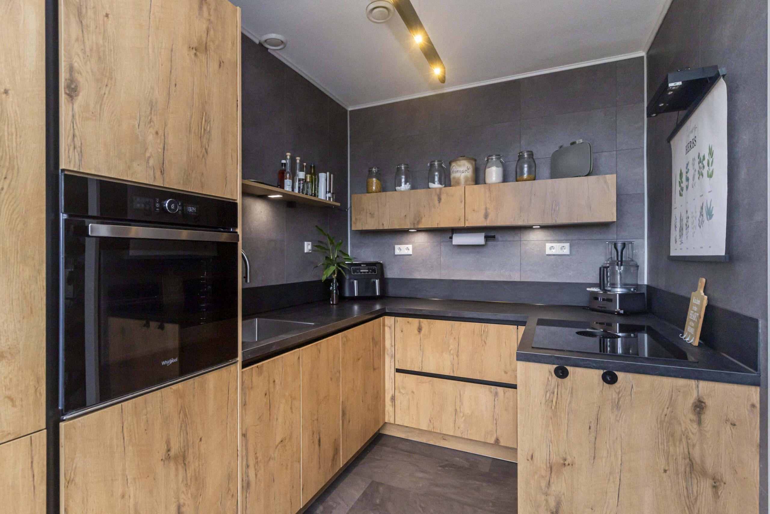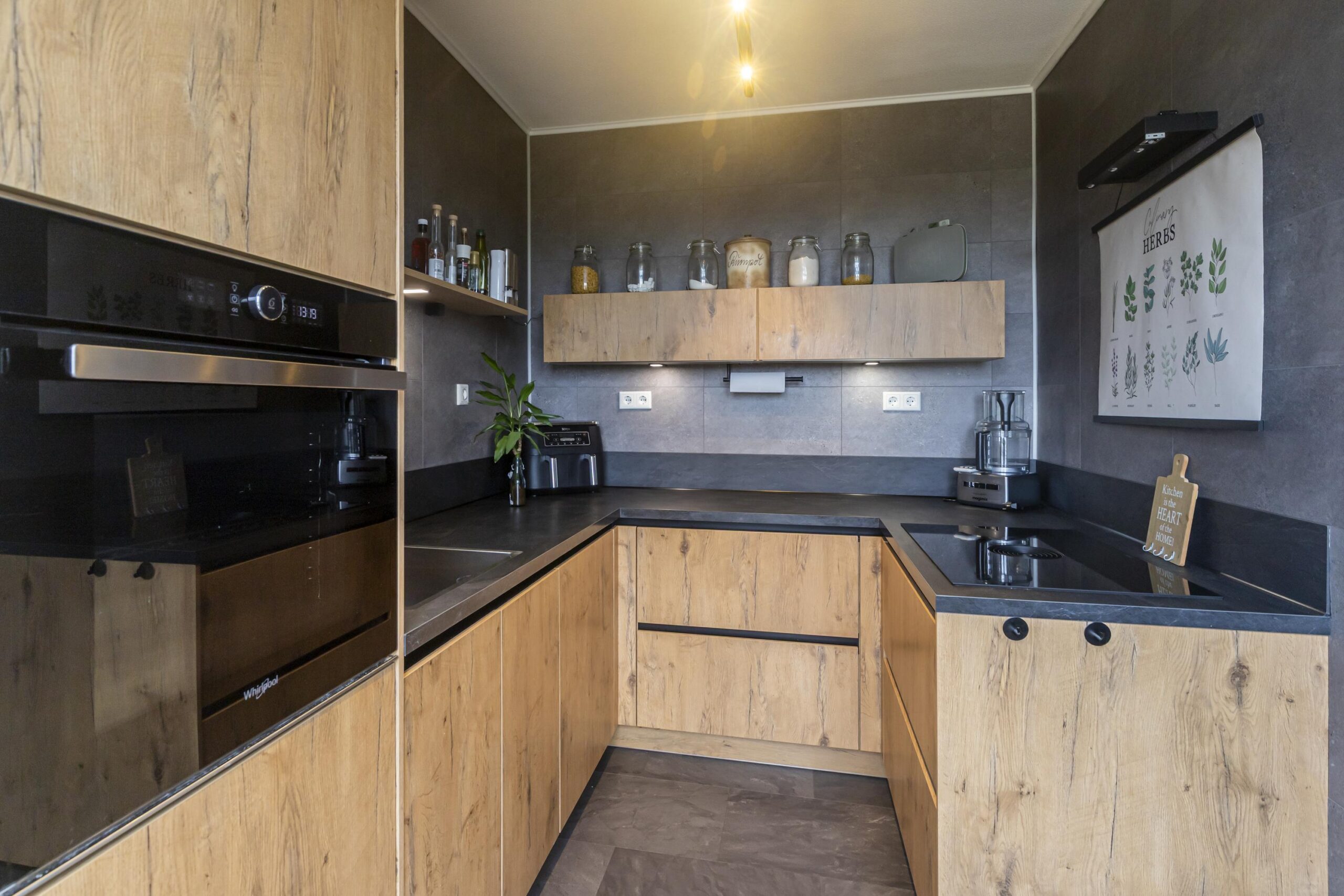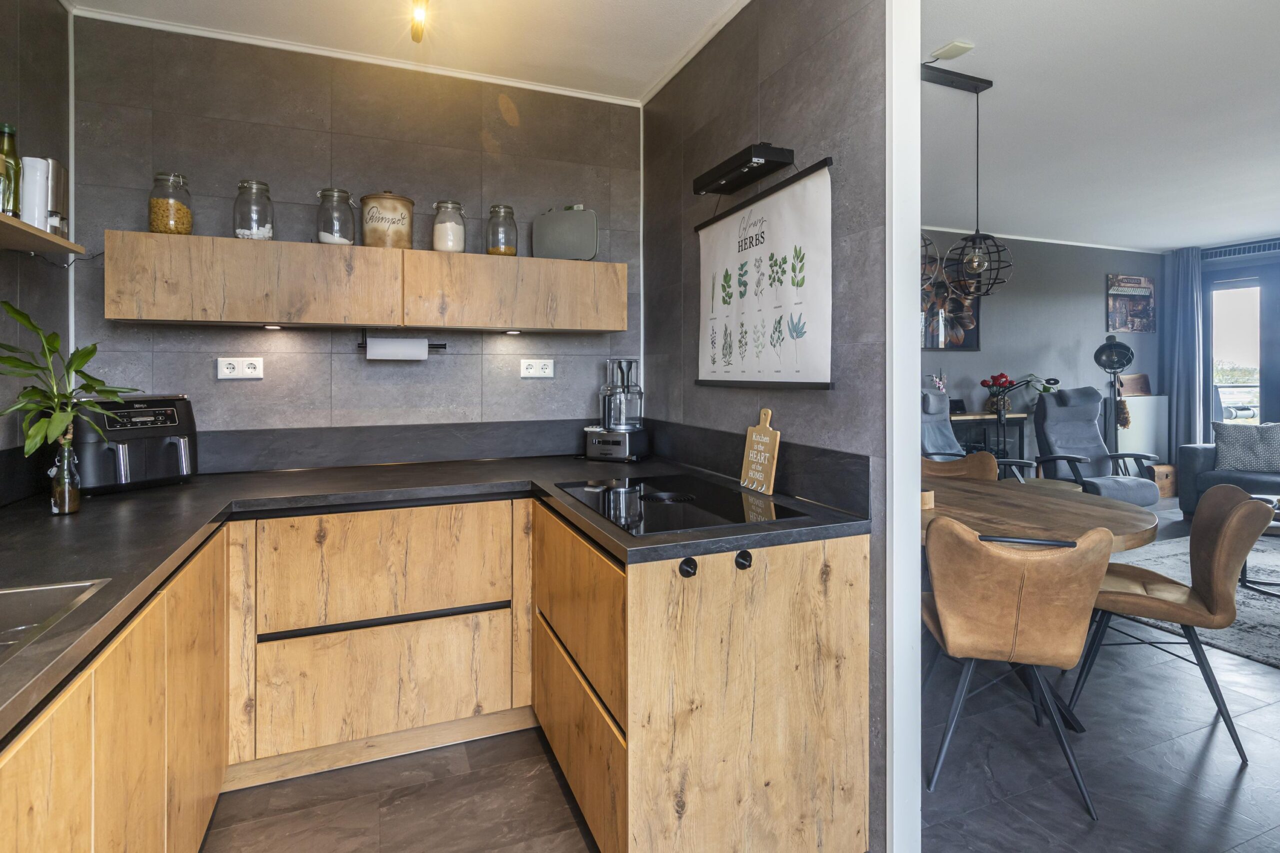 De woonkamer staat in open verbinding met de U-vormige keuken, die is uitgerust met een gasfornuis met electrische kookplaat met afzuiging, een vaatwasser en een koel-vriescombinatie.