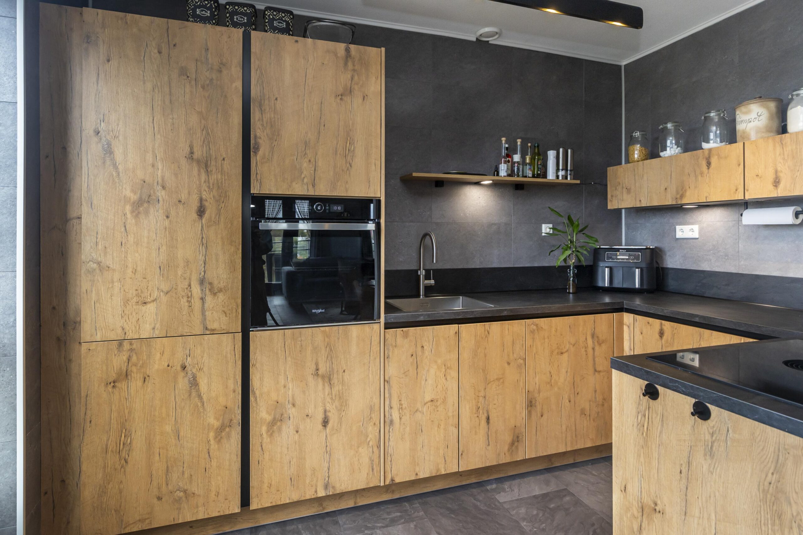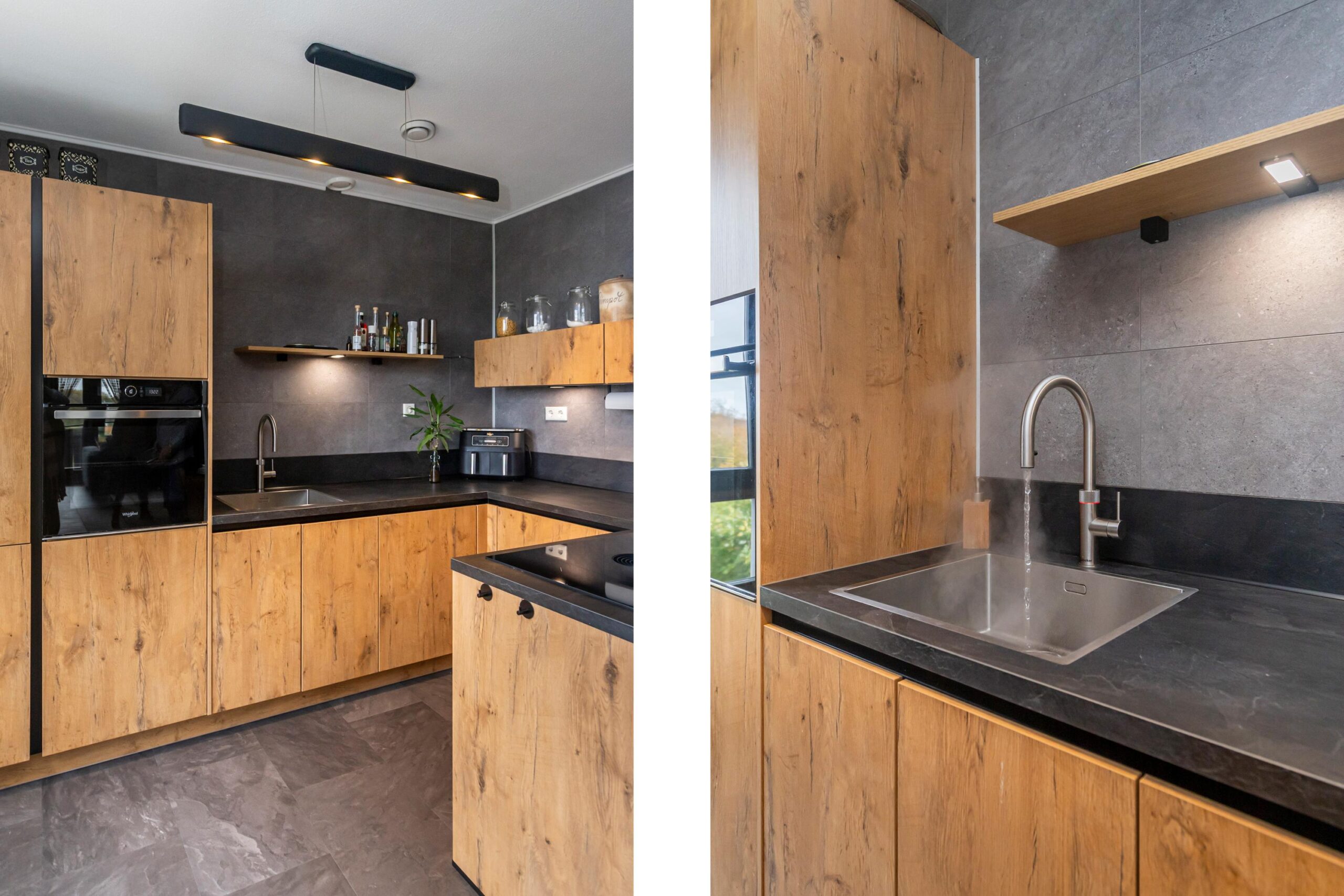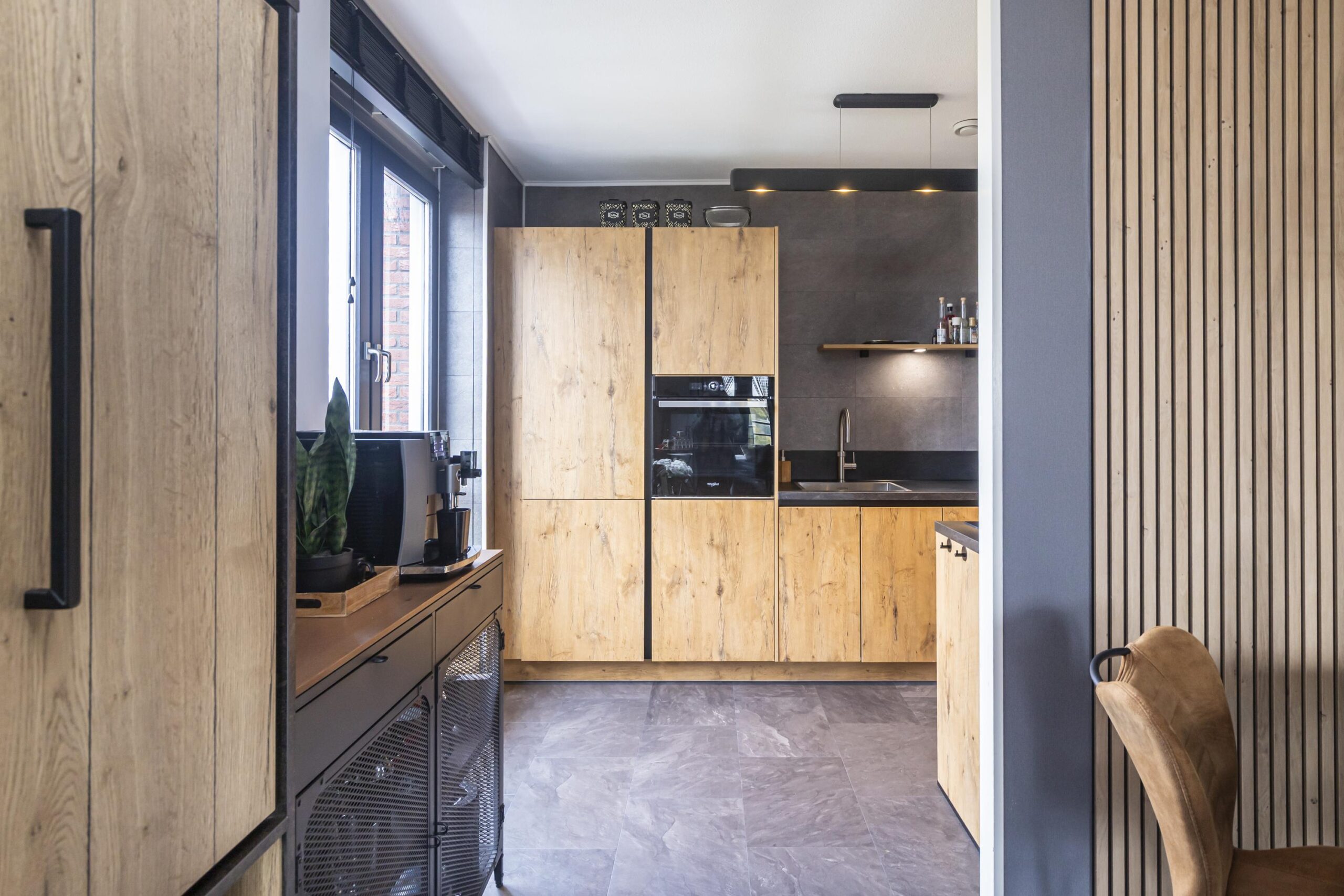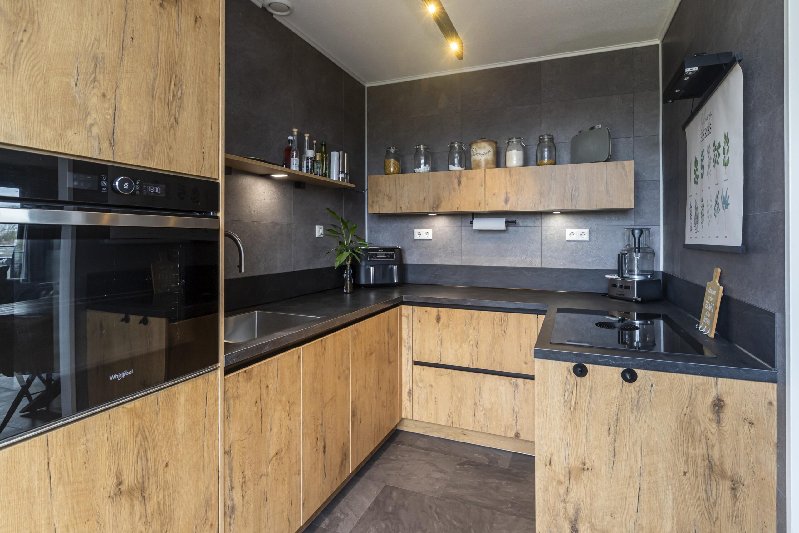 De woonkamer staat in open verbinding met de U-vormige keuken, die is uitgerust met een gasfornuis met electrische kookplaat met afzuiging, een vaatwasser en een koel-vriescombinatie.