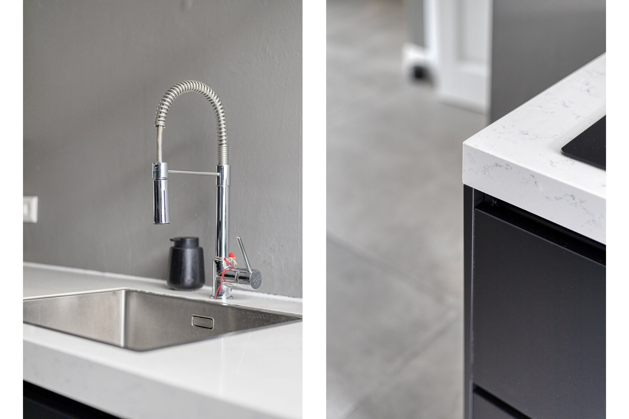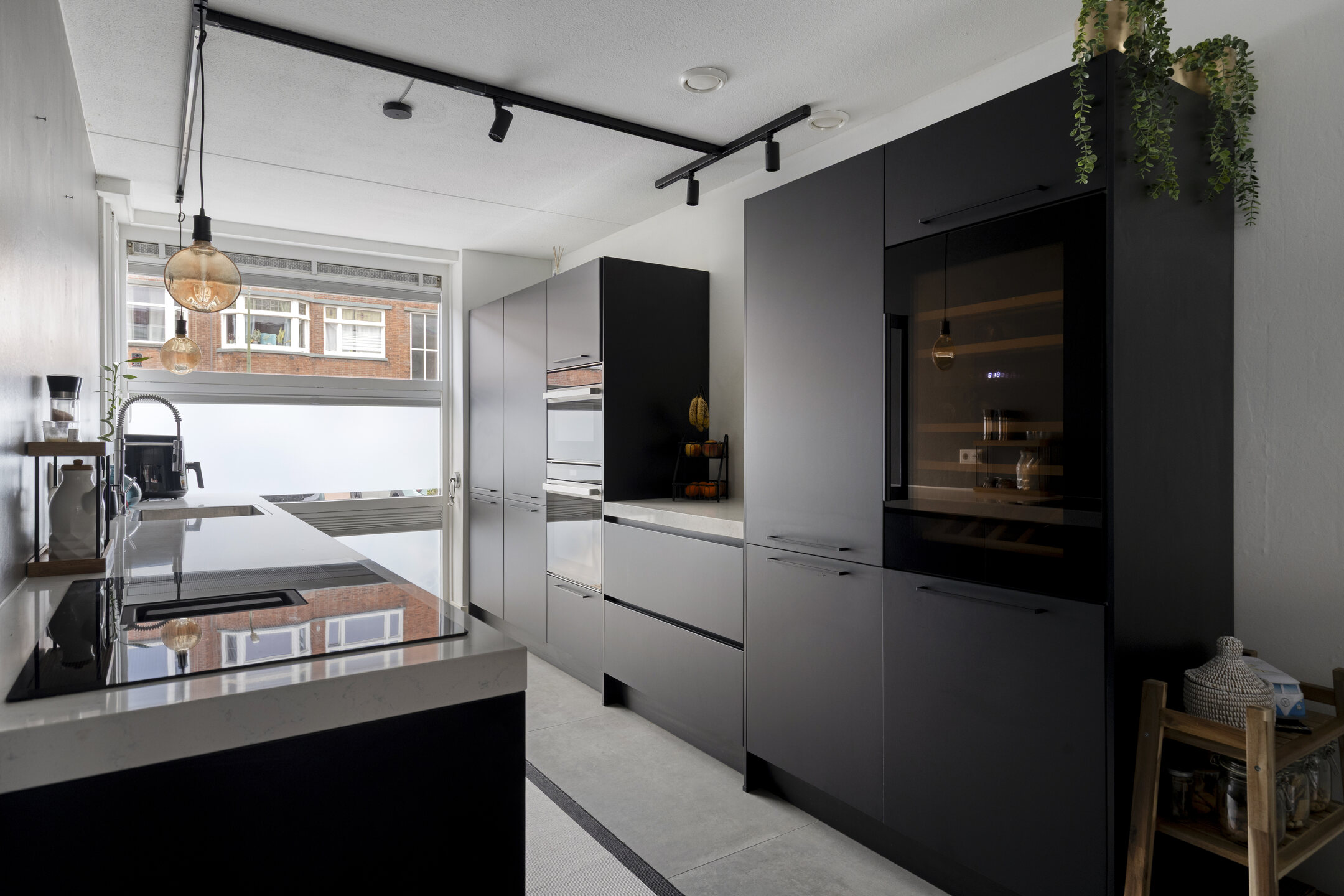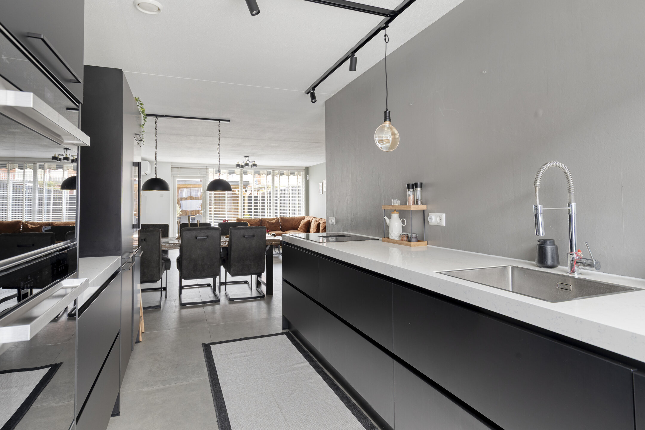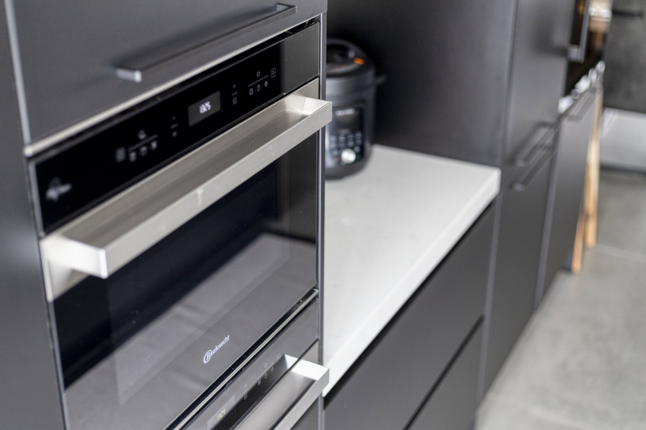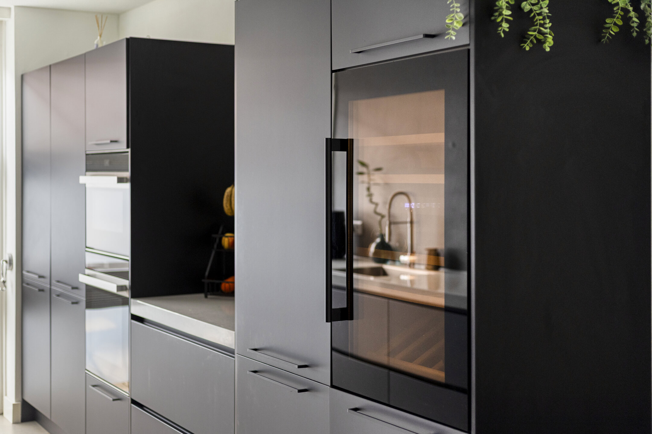 De moderne keuken vormt een echte blikvanger en is uitgevoerd met donkere, greeploze fronten en een licht werkblad. De keuken is uitgerust met diverse inbouwapparatuur, waaronder een inductiekookplaat, oven, magnetron, wijnkoeler, volledige vrieskast en een volledige koelkast.