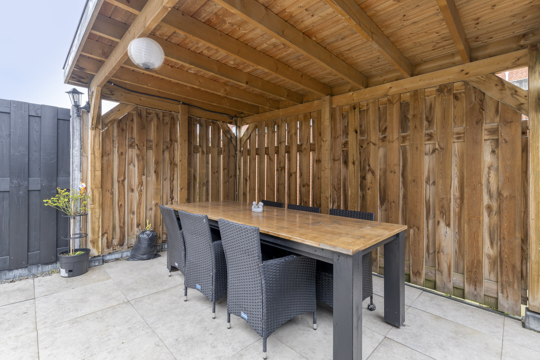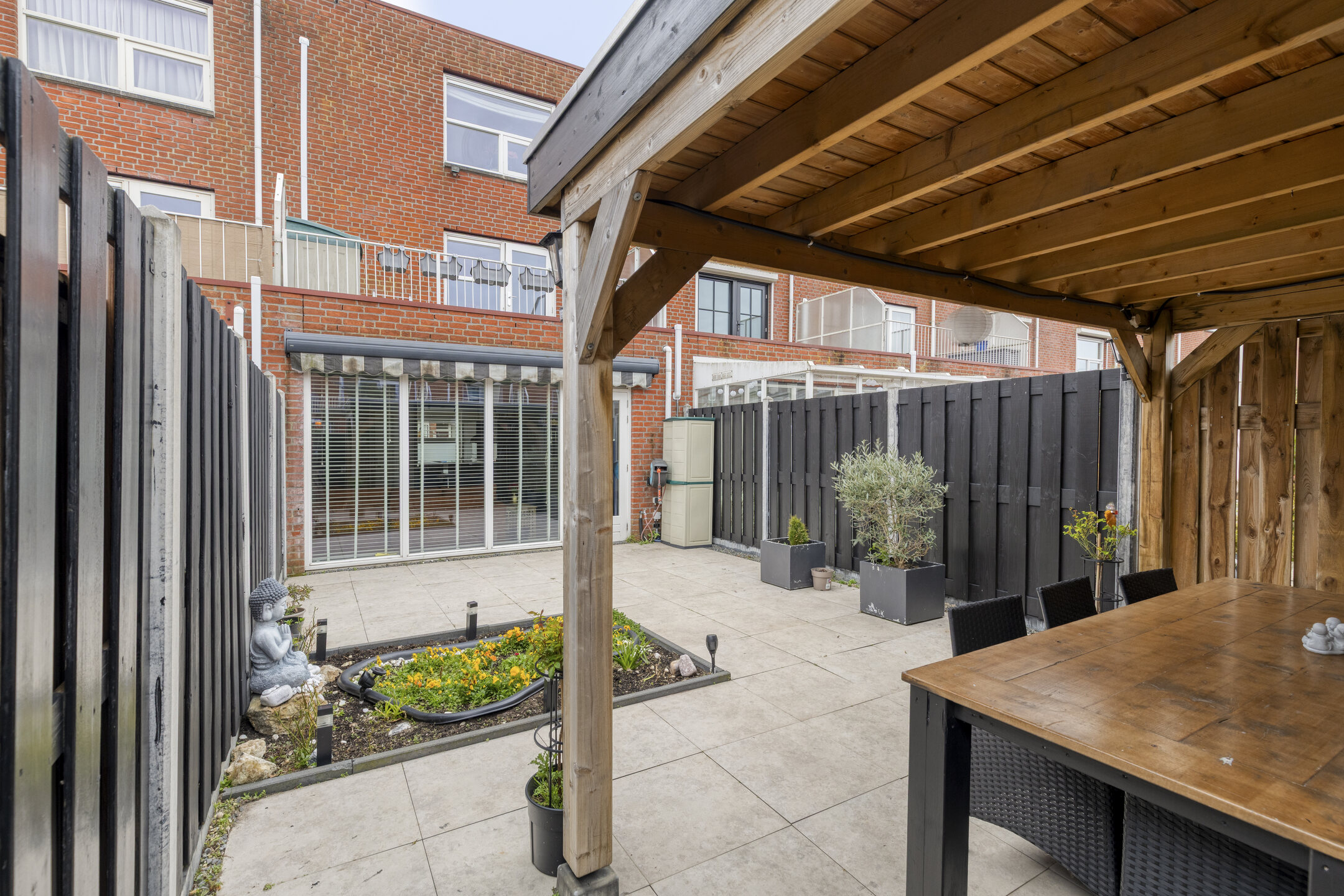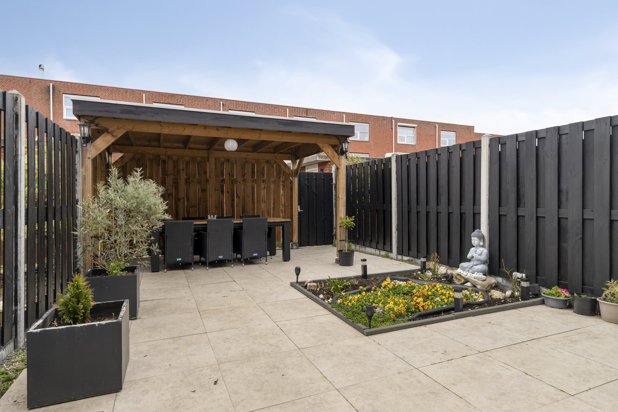 De achtertuin biedt veel privacy en is onderhoudsvriendelijk aangelegd met bestrating en een overkapping. Deze buitenruimte is ideaal ingericht voor gezellige (zomer)barbecues en biedt voldoende ruimte voor een volwaardige eettafel. Dankzij de gunstige ligging geniet u hier in de zomer van meer dan 10 uur zon per dag. Daarnaast is de buitenruimte voorzien van een elektrisch zonnescherm/overkapping, wat zorgt voor extra comfort en flexibiliteit.
