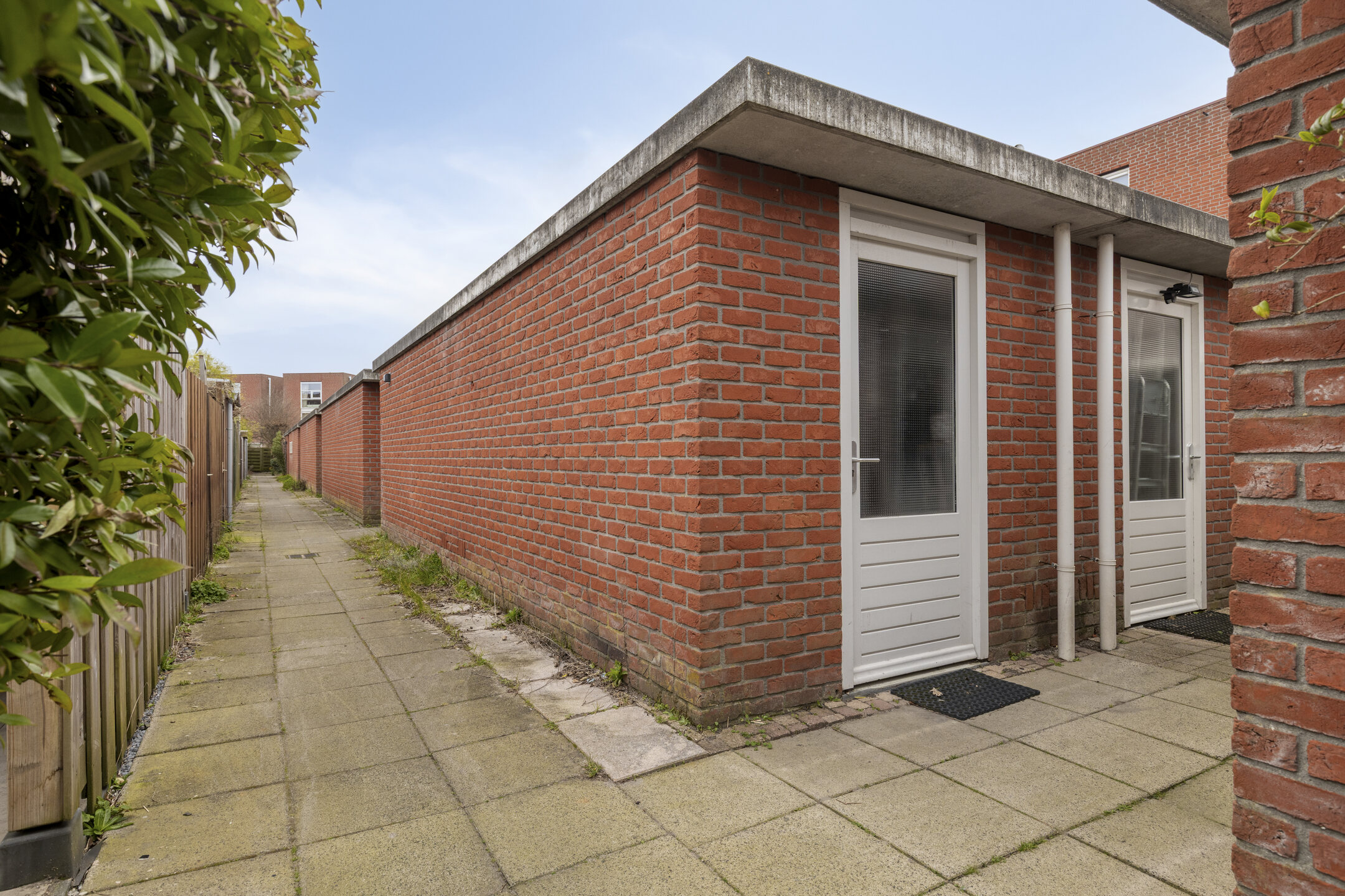 Achterin de tuin bevindt zich een ruime stenen berging en een achterom. Op het dak zijn 13 zonnepanelen geplaatst.