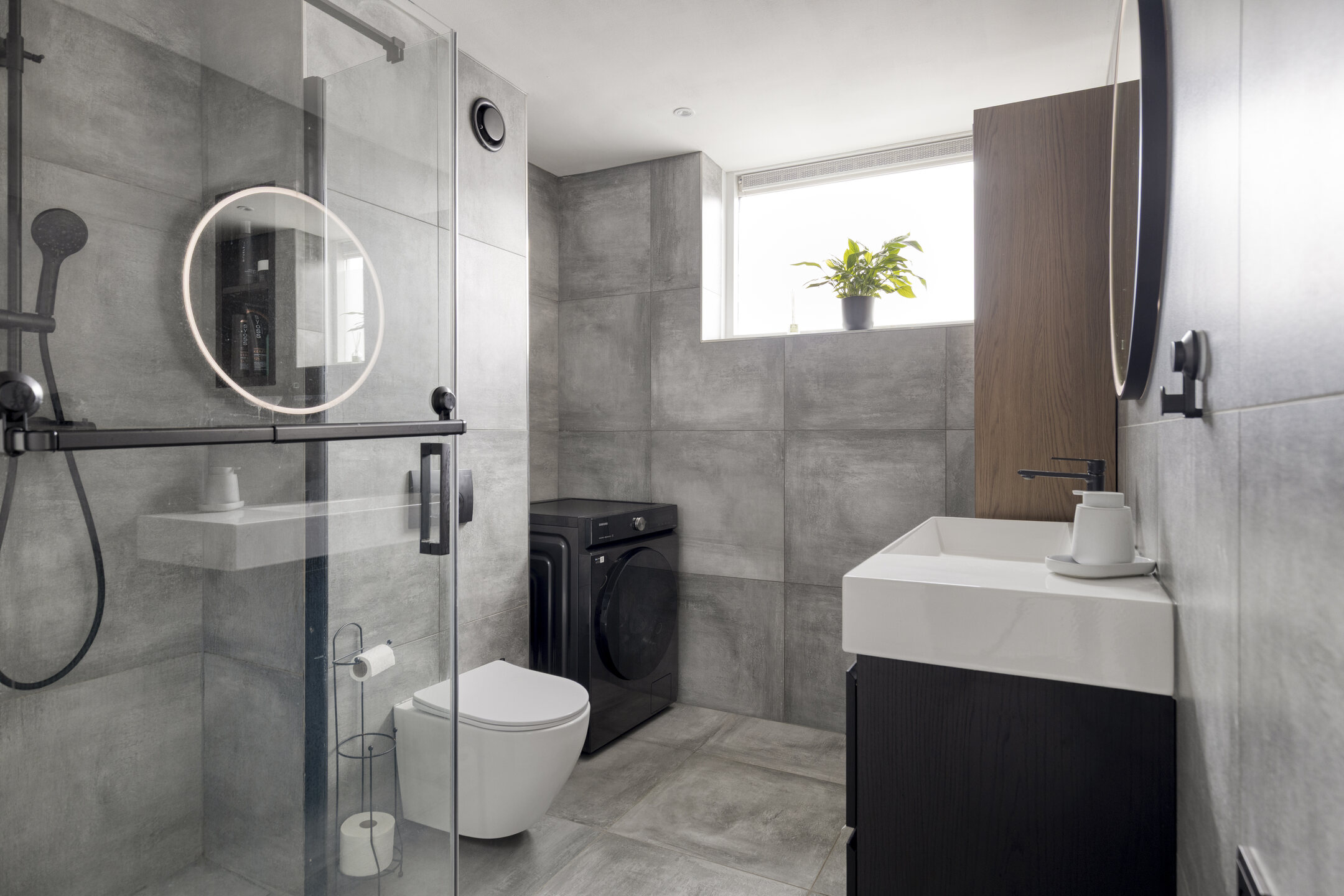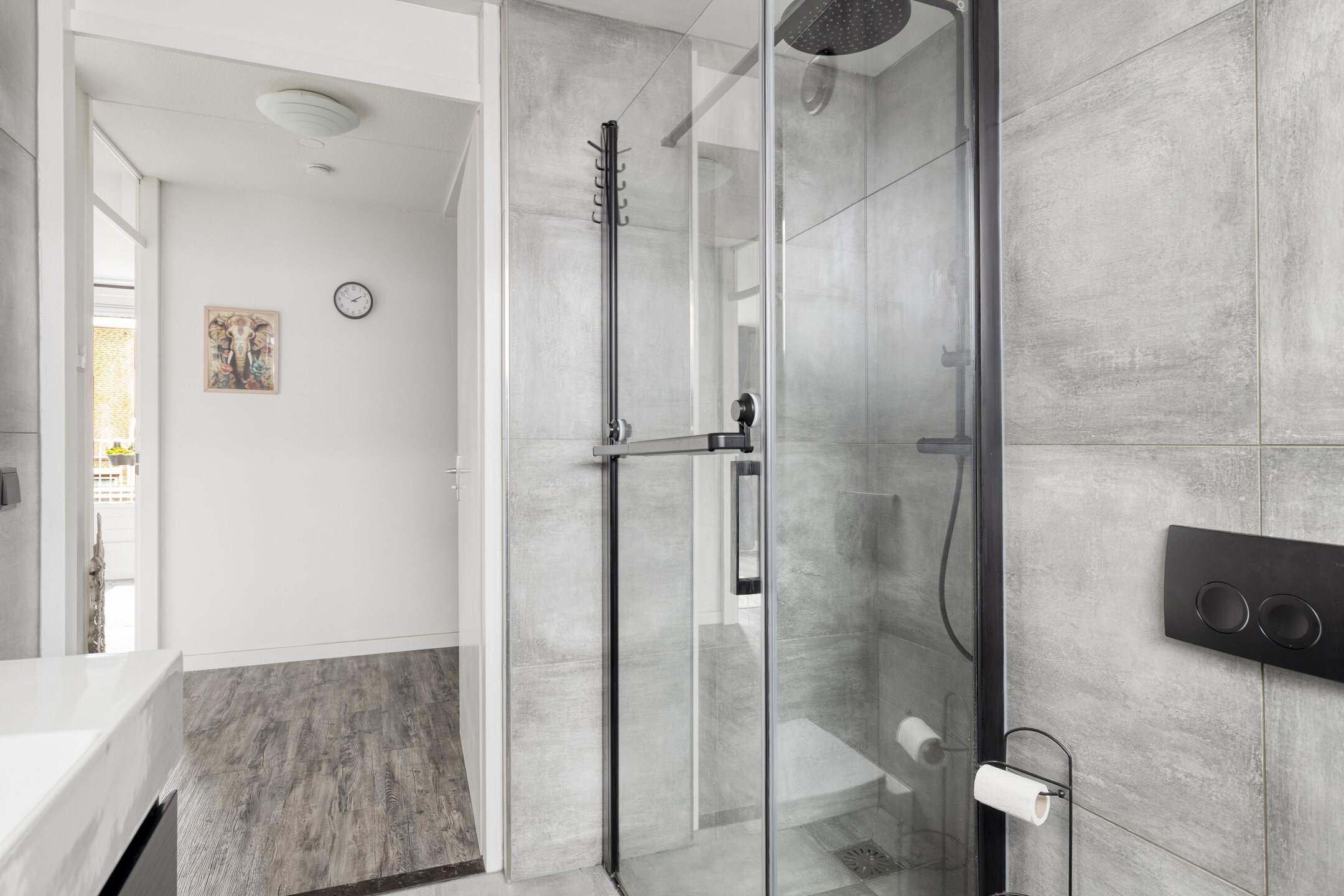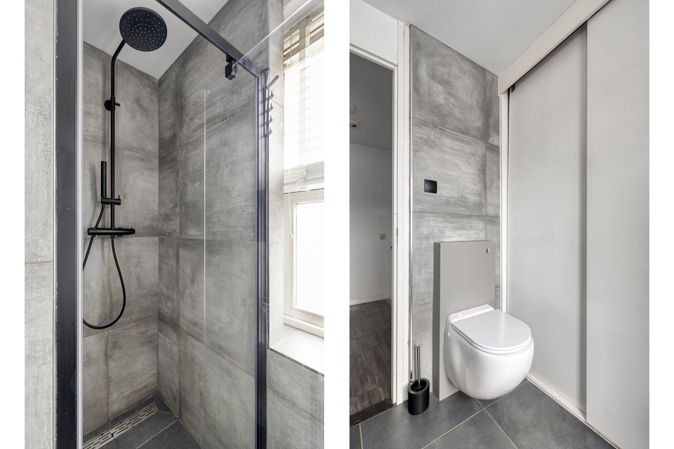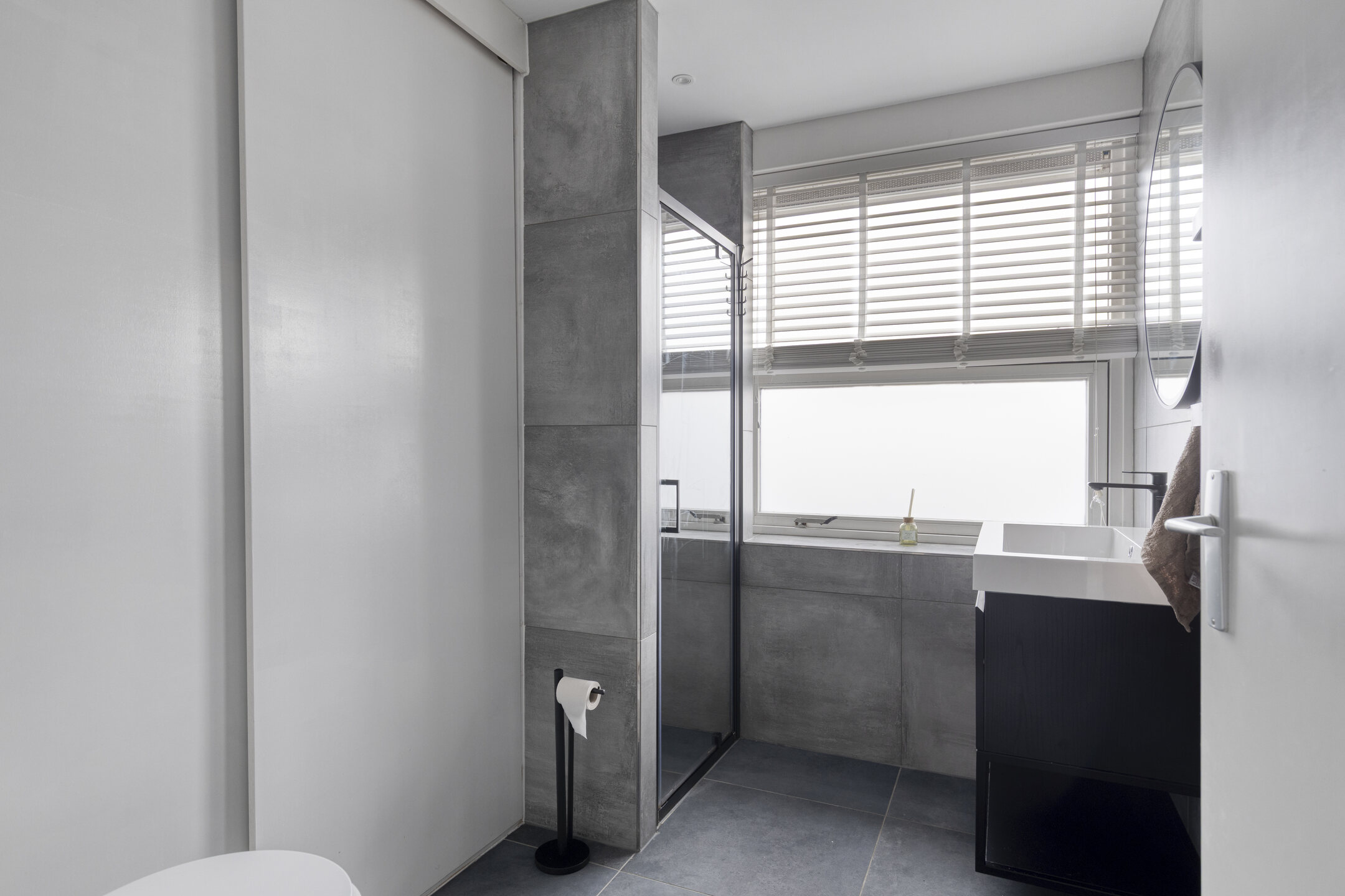 De badkamer is smaakvol afgewerkt met moderne grijstinten en voorzien van een douchecabine, zwevend toilet en een wastafelmeubel. Tevens bevinden zich hier de aansluitingen en voorzieningen voor zowel een wasmachine als een droger.