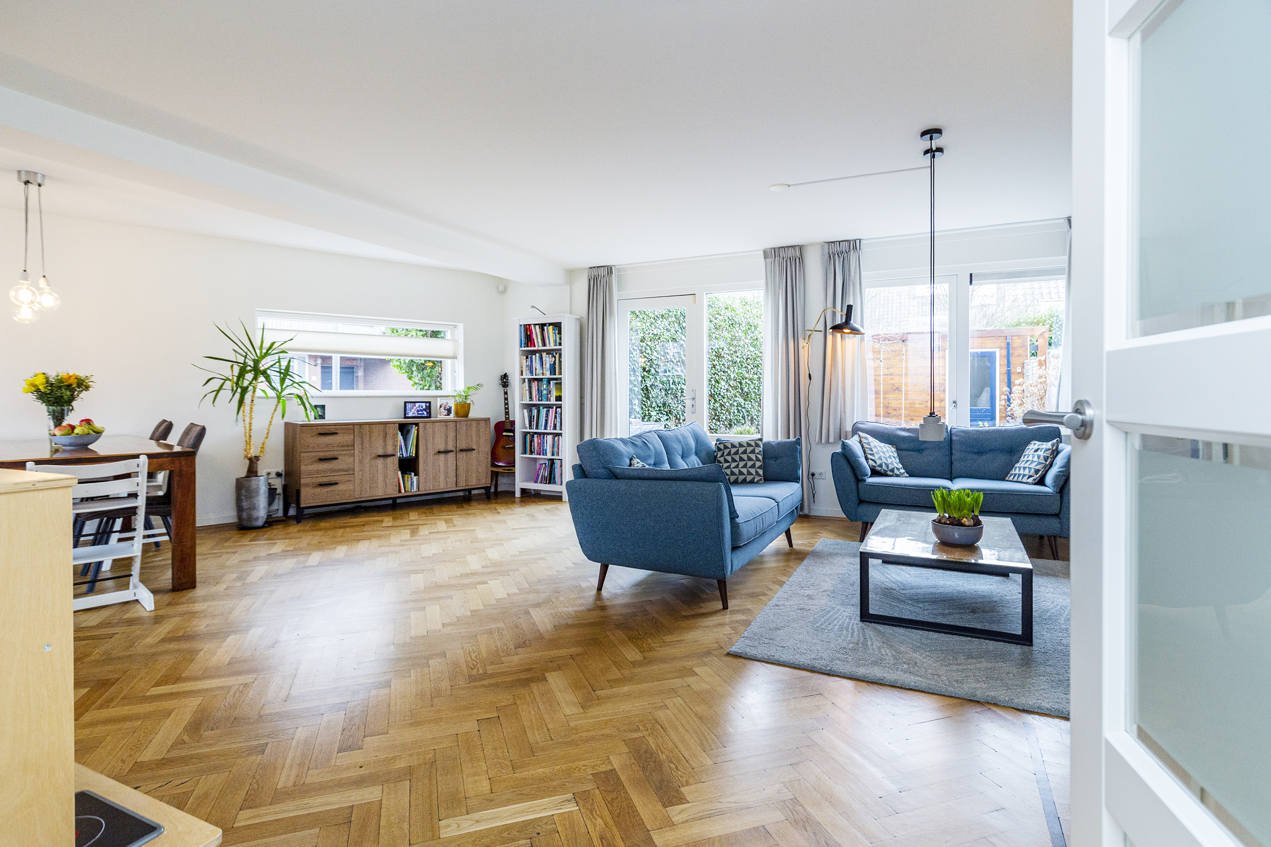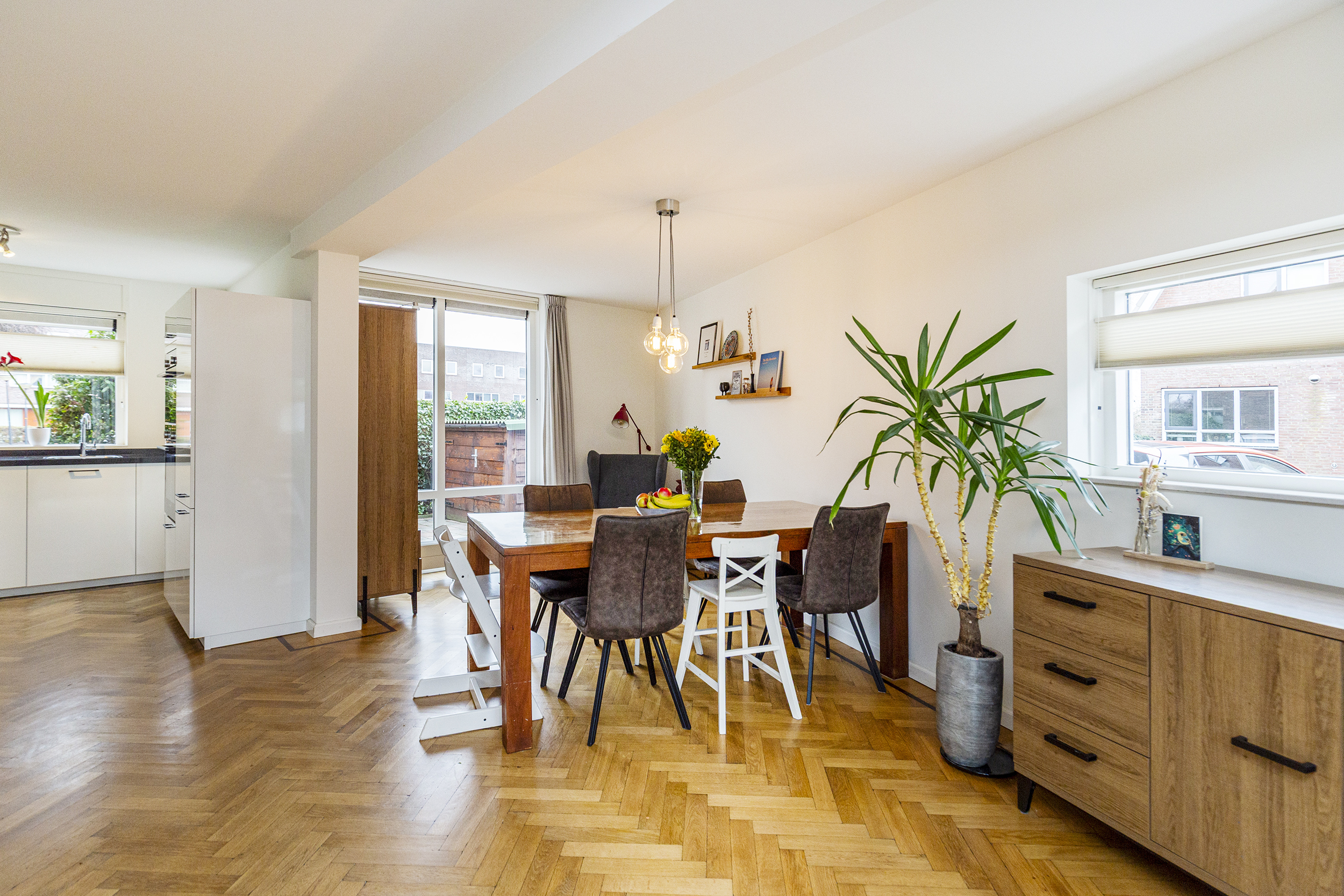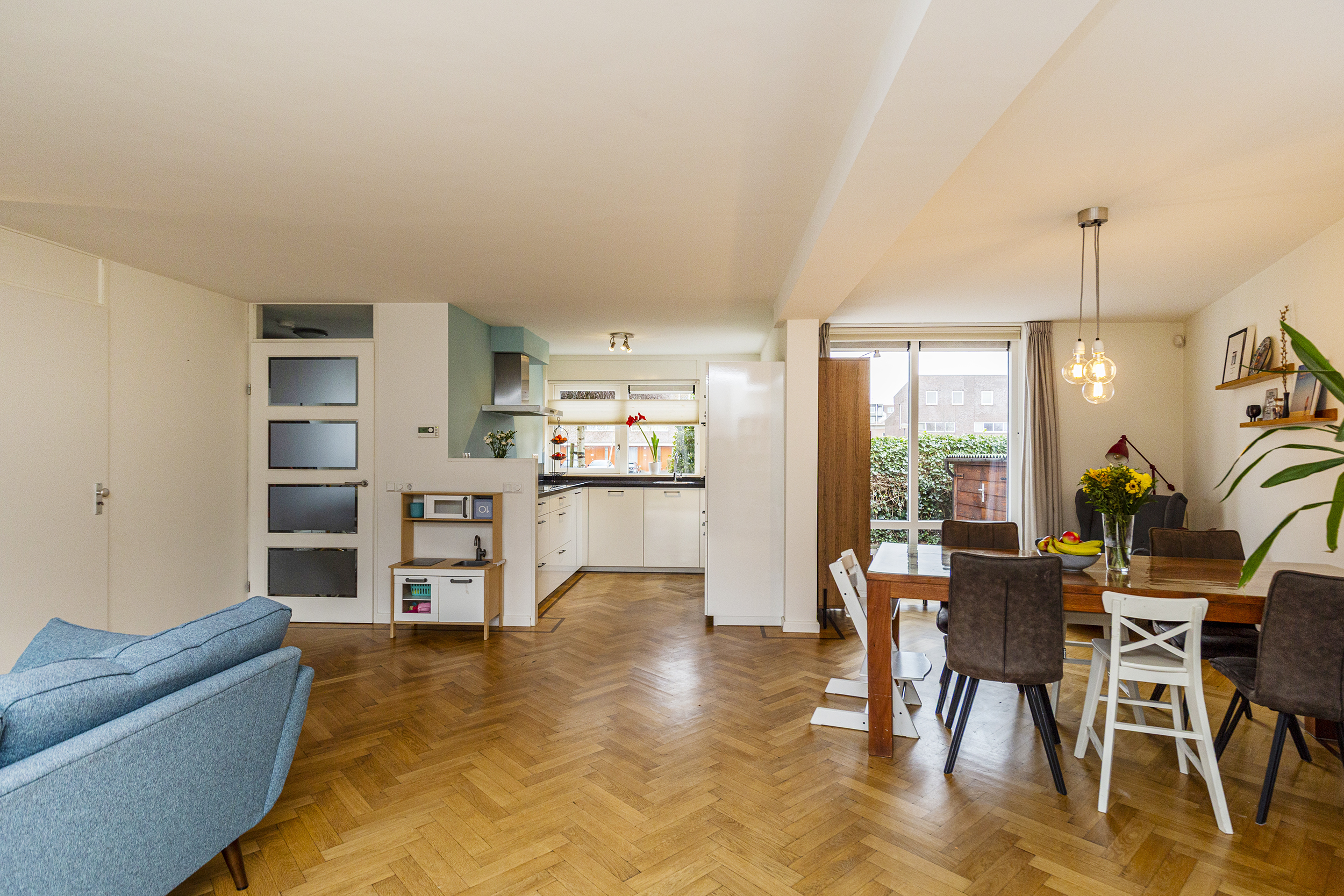 Via de entree betreedt u de hal met meterkast en een moderne toiletruimte met fonteintje. Vanuit de hal loopt u door naar de ruime en lichte woon-/eetkamer, waar grote raampartijen zorgen voor een prettige lichtinval en een fijne verbinding met zowel de voor- als achtertuin. Er is meer dan voldoende ruimte voor een royale zithoek en een grote eettafel.