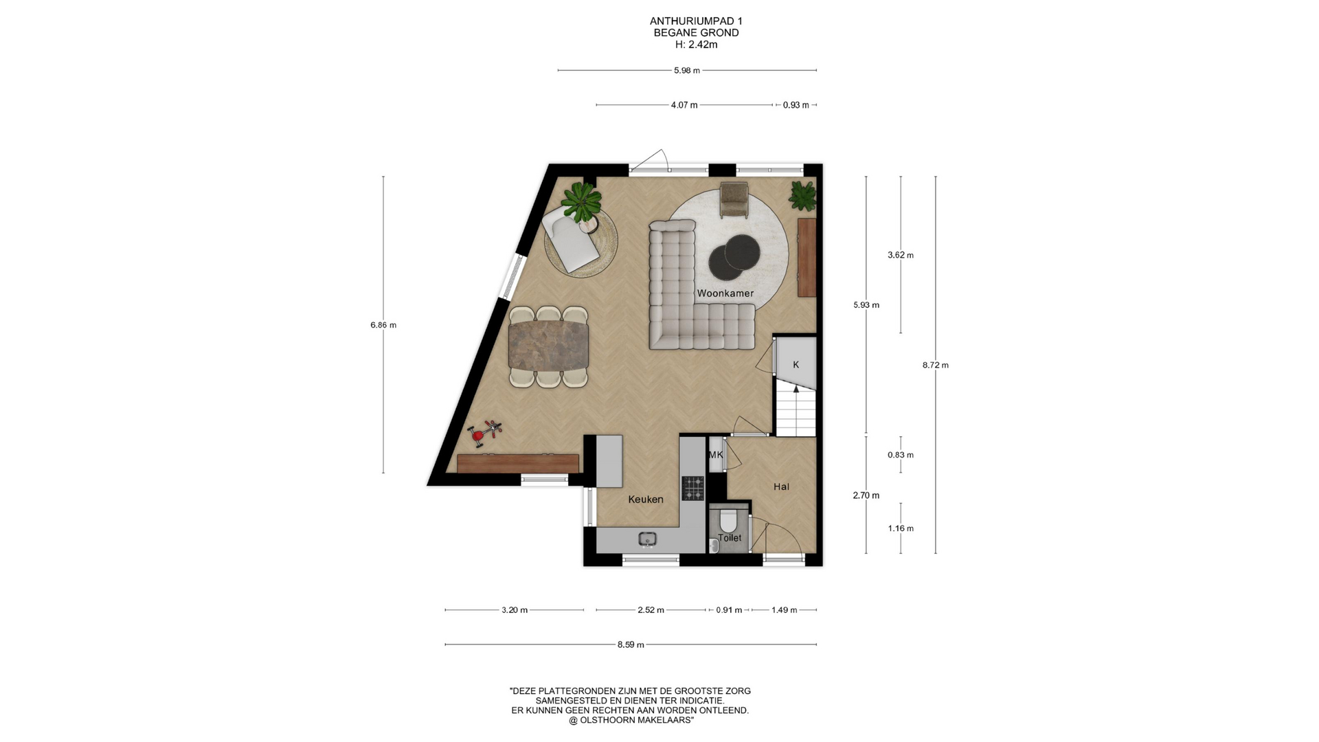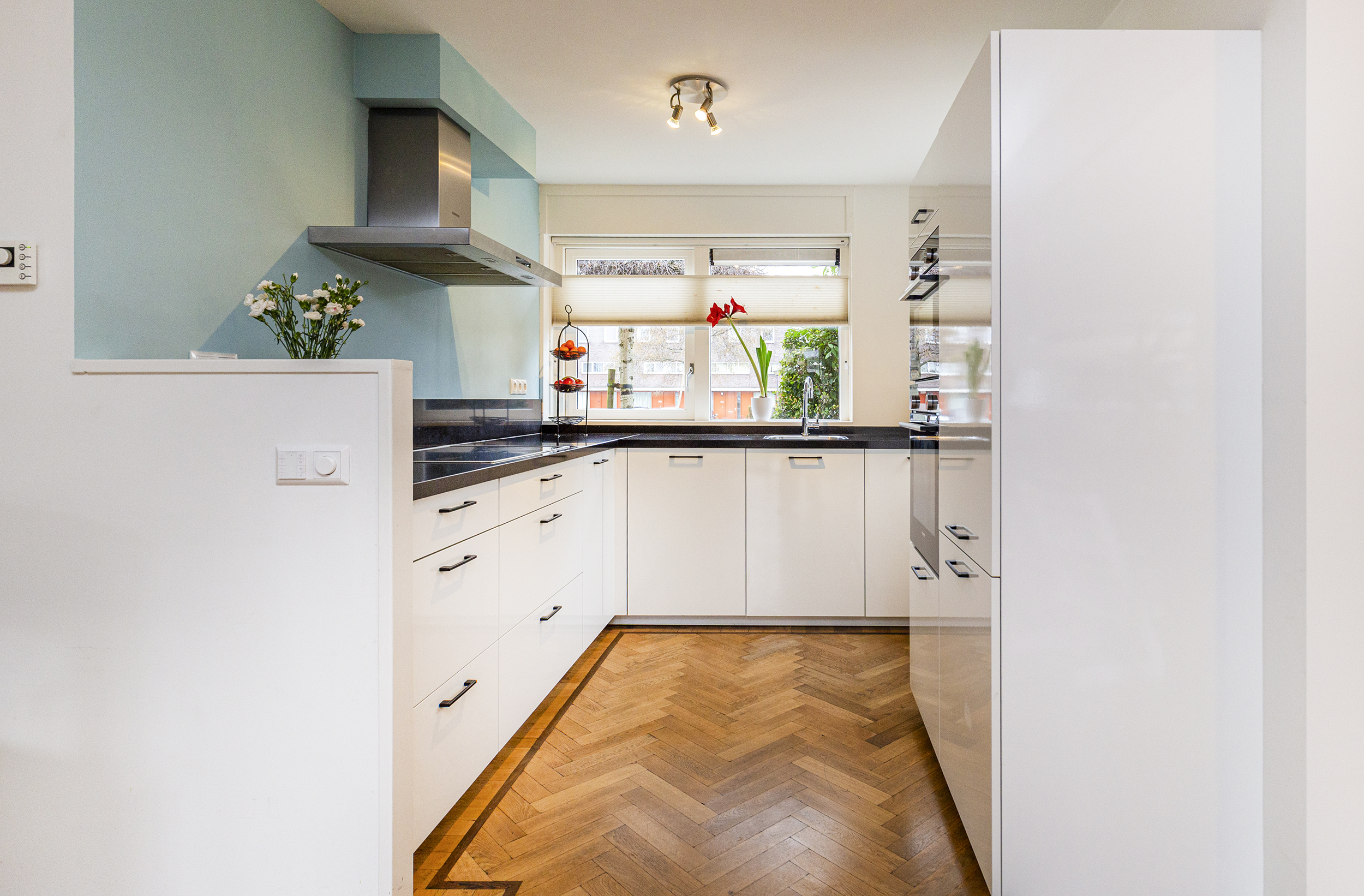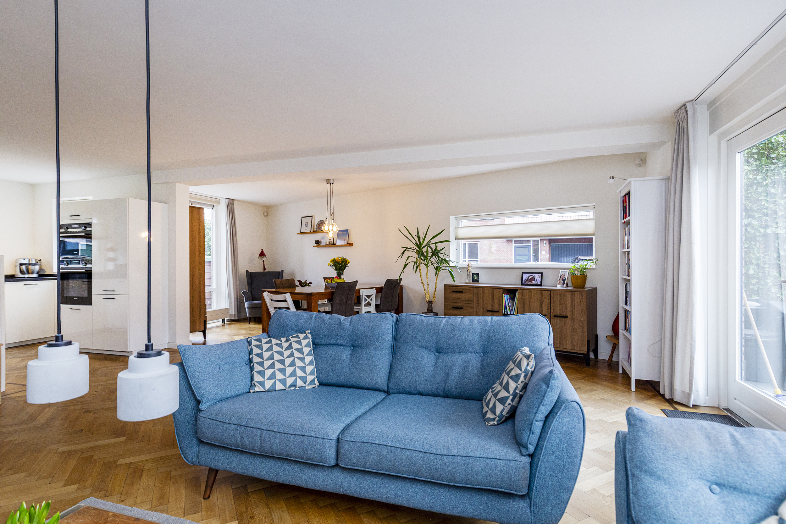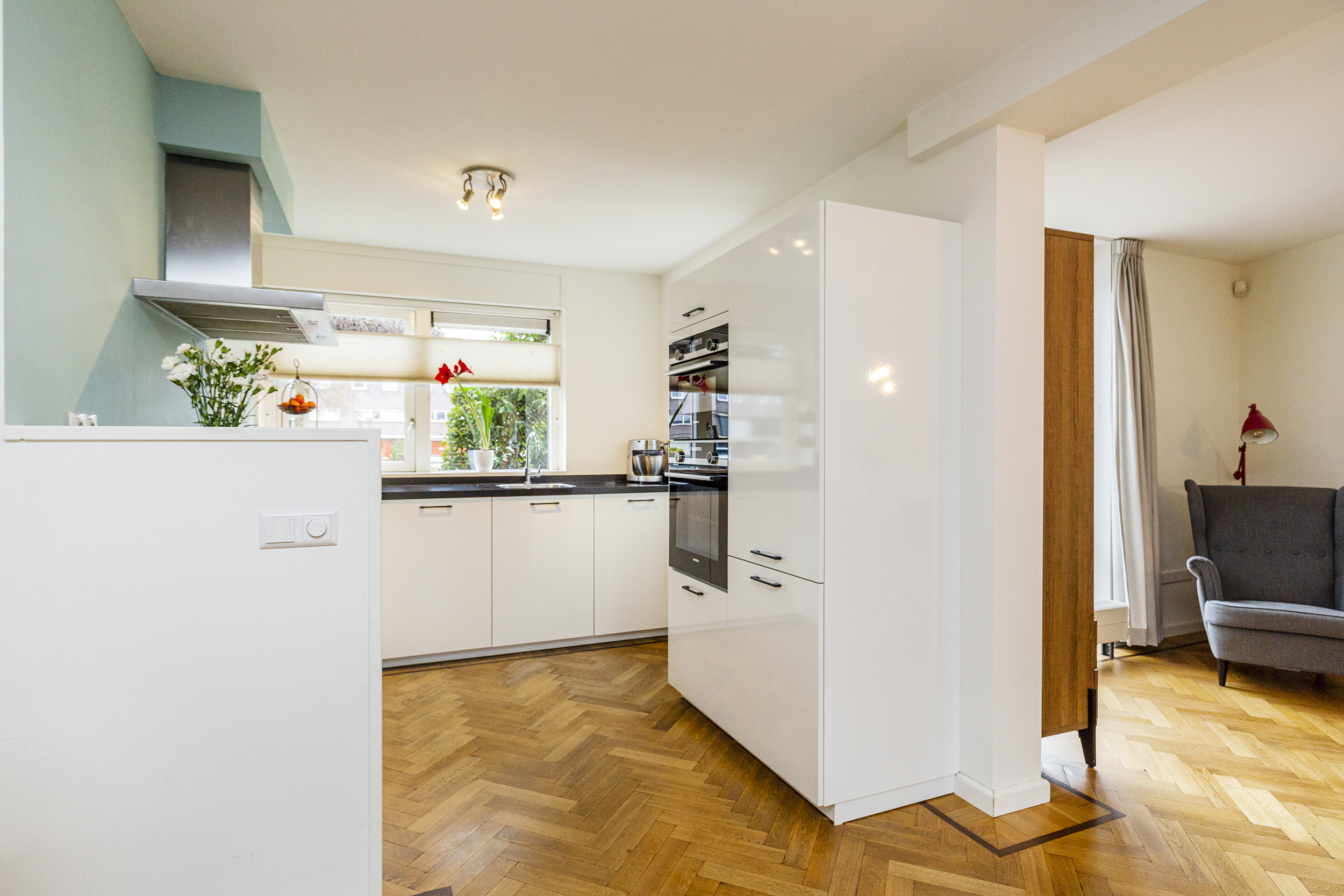 Via de entree betreedt u de hal met meterkast en een moderne toiletruimte met fonteintje. Vanuit de hal loopt u door naar de ruime en lichte woon-/eetkamer, waar grote raampartijen zorgen voor een prettige lichtinval en een fijne verbinding met zowel de voor- als achtertuin. Er is meer dan voldoende ruimte voor een royale zithoek en een grote eettafel.