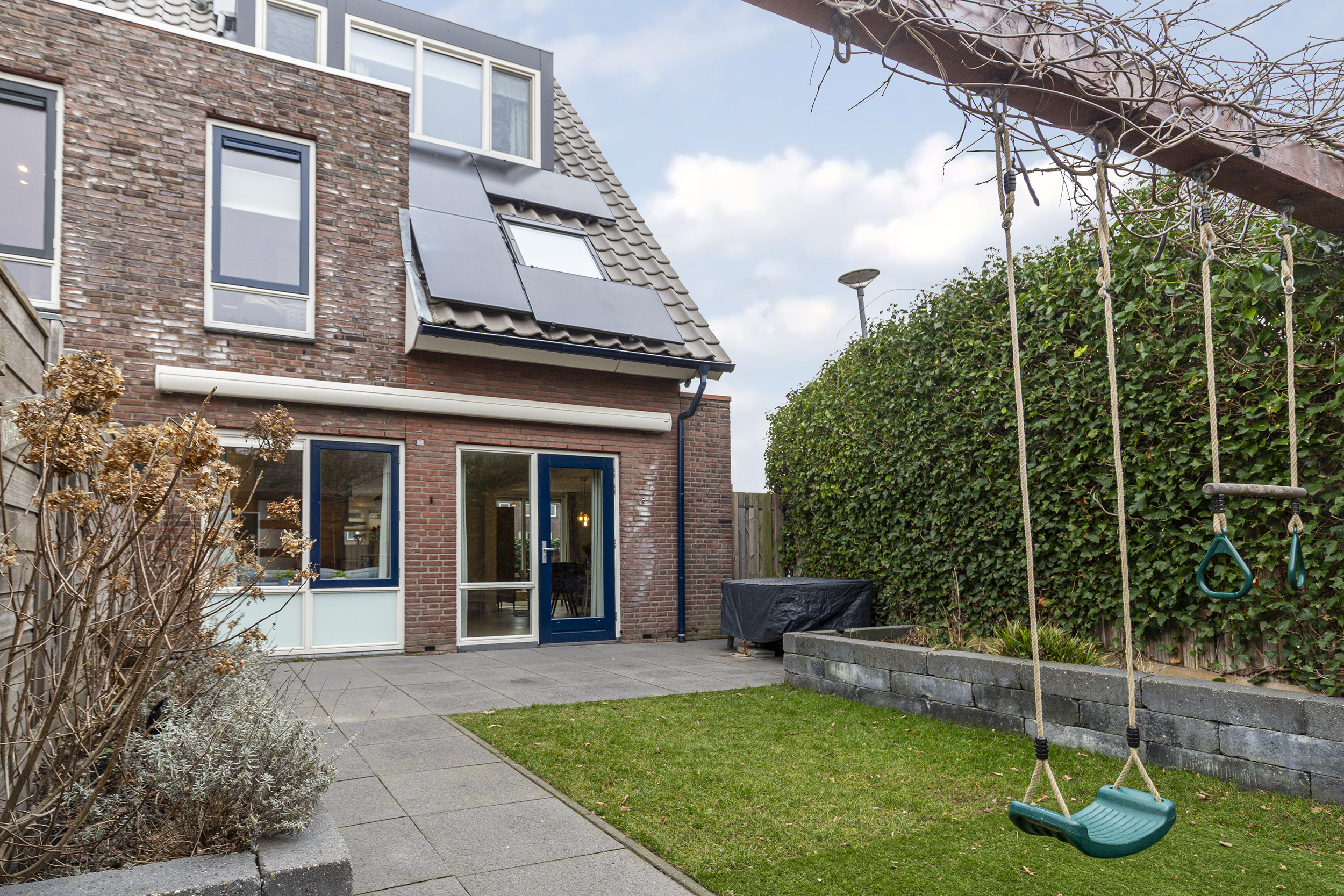 Via de woonkamer heeft u toegang tot de fraai aangelegde achtertuin, gunstig gelegen op het zuidwesten. Dankzij deze ligging geniet u hier tot in de late avonduren van de zon. Op warme dagen zorgt de elektrische zonwering voor extra comfort, zowel binnen als buiten.