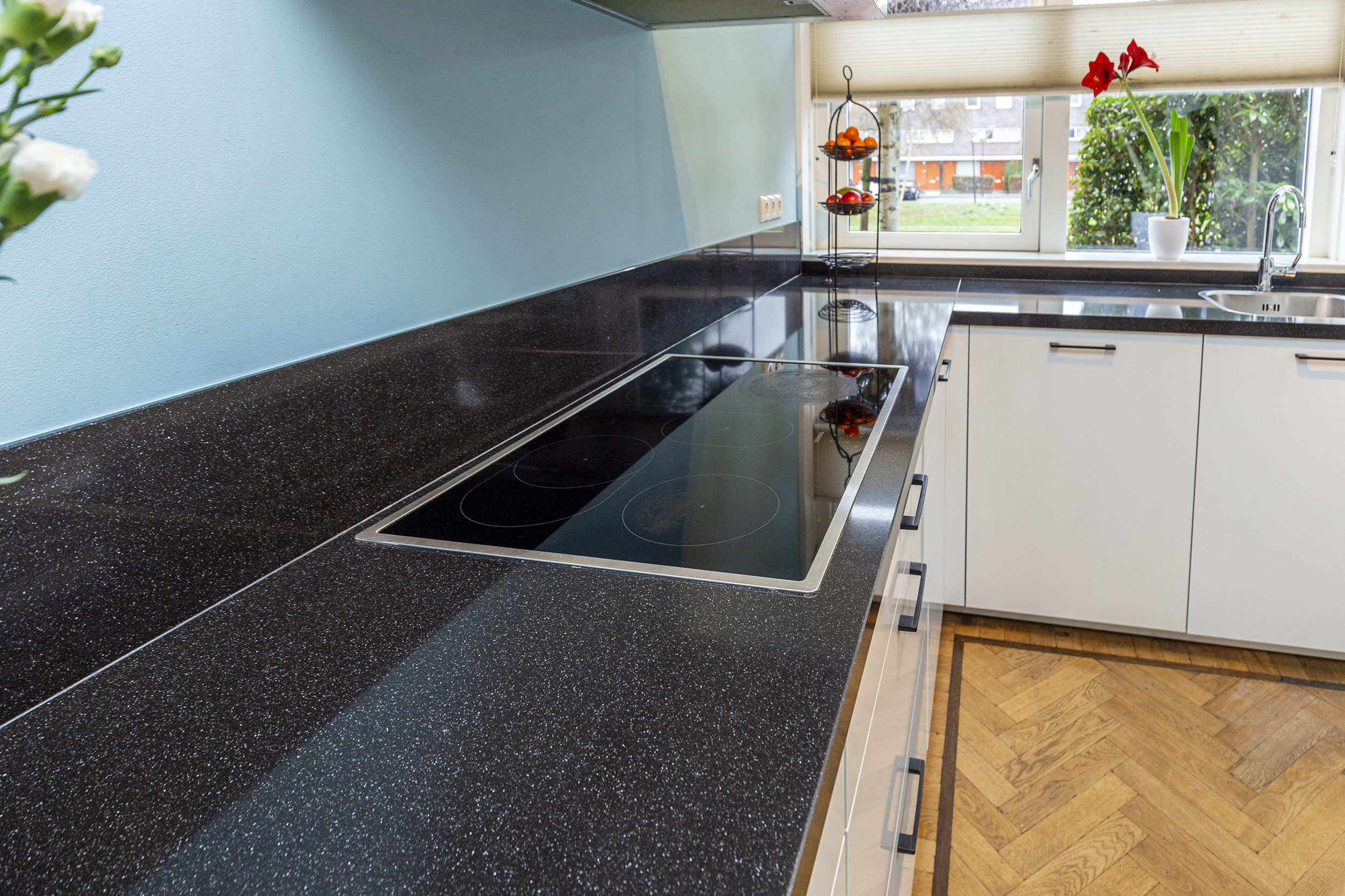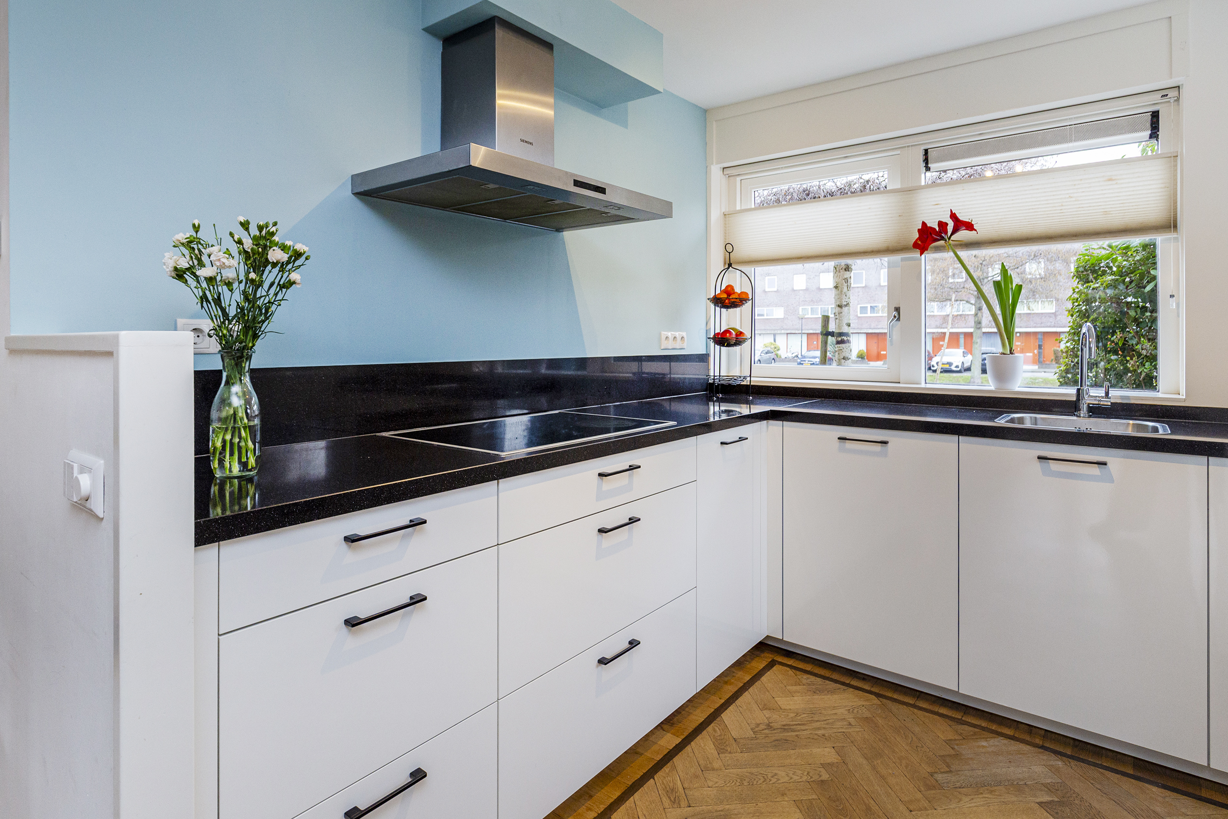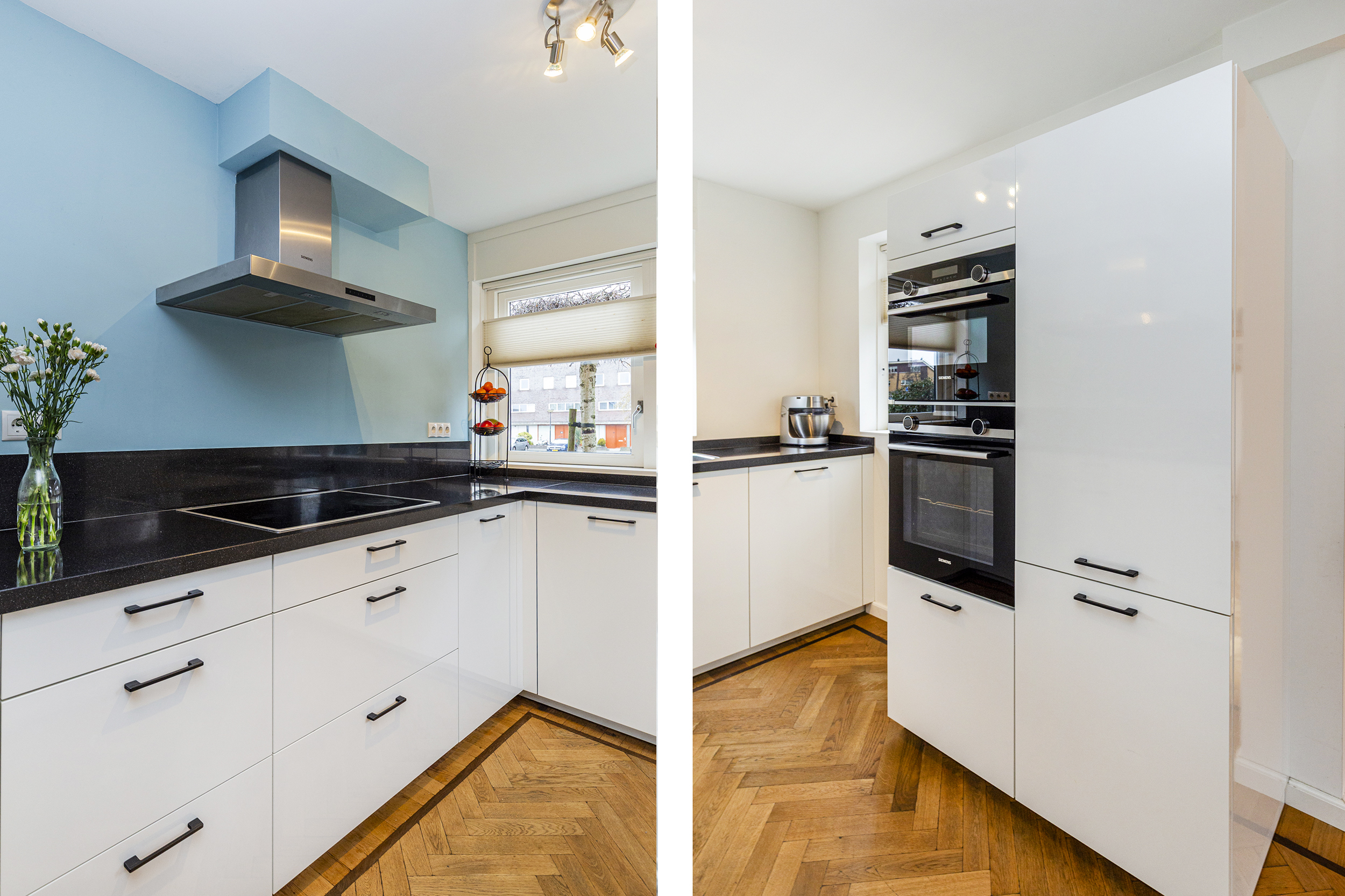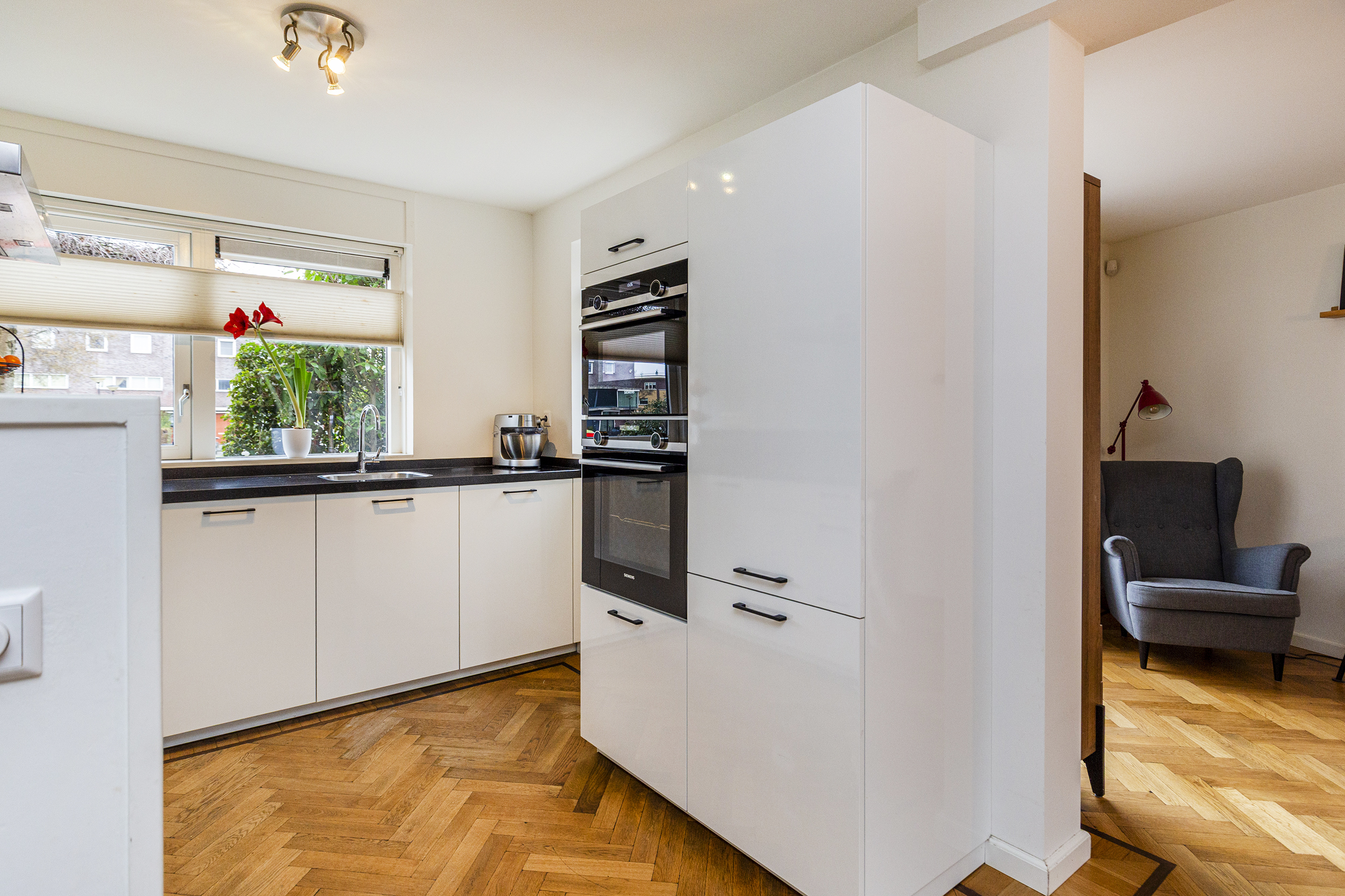 Aan de voorzijde van de woning bevindt zich een moderne keuken, geplaatst in 2019 en uitgevoerd in een praktische opstelling. Vanuit de keuken kijkt u vrij naar buiten, over een brede sloot met rietkraag. De keuken is voorzien van Siemens inbouwapparatuur, waaronder een inductiekookplaat met afzuigkap, combi-oven, oven, vaatwasser en een koel-vriescombinatie.