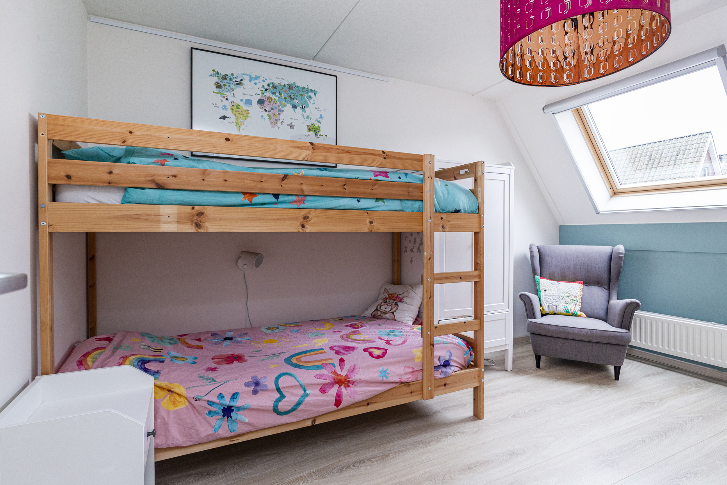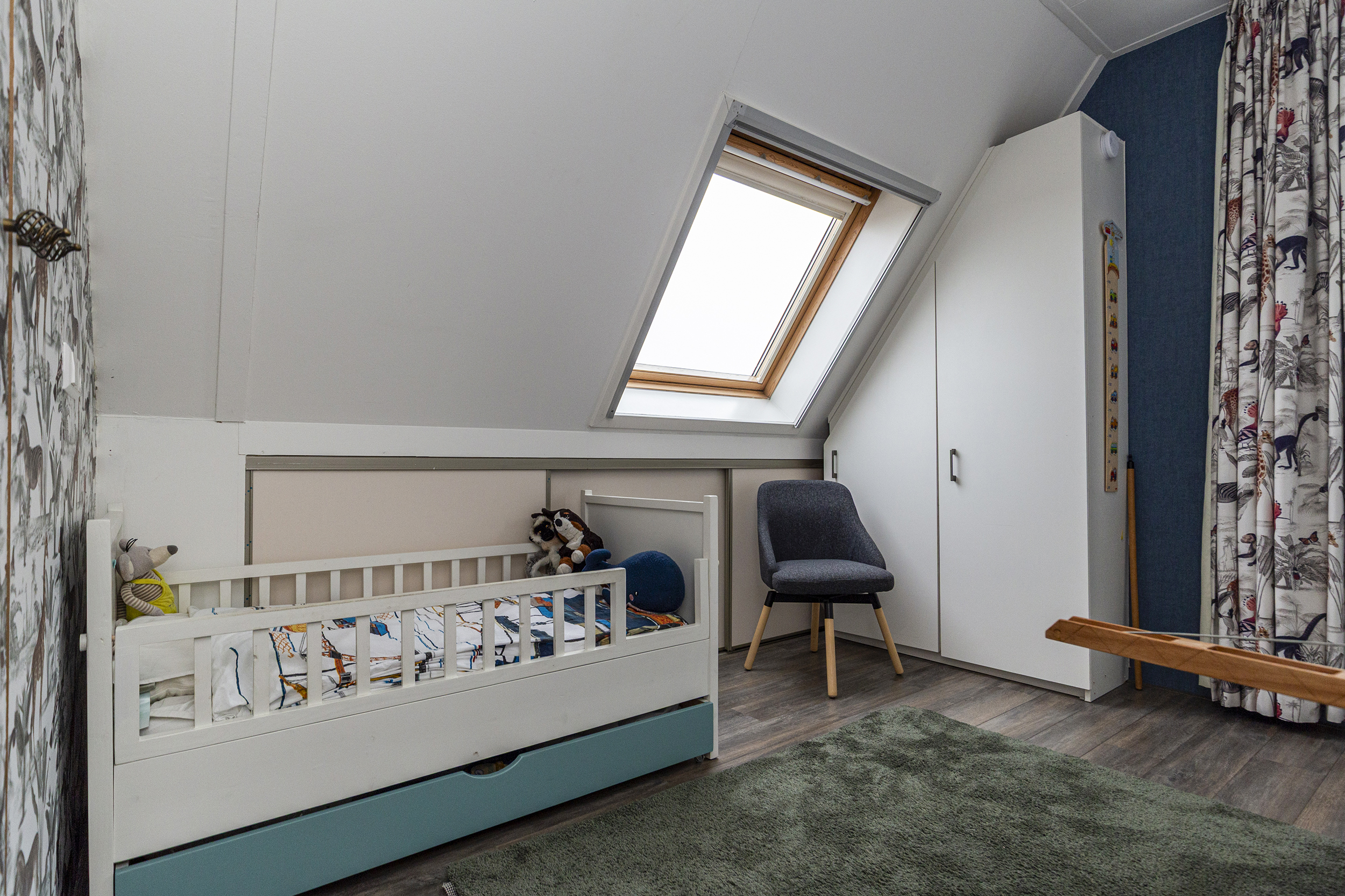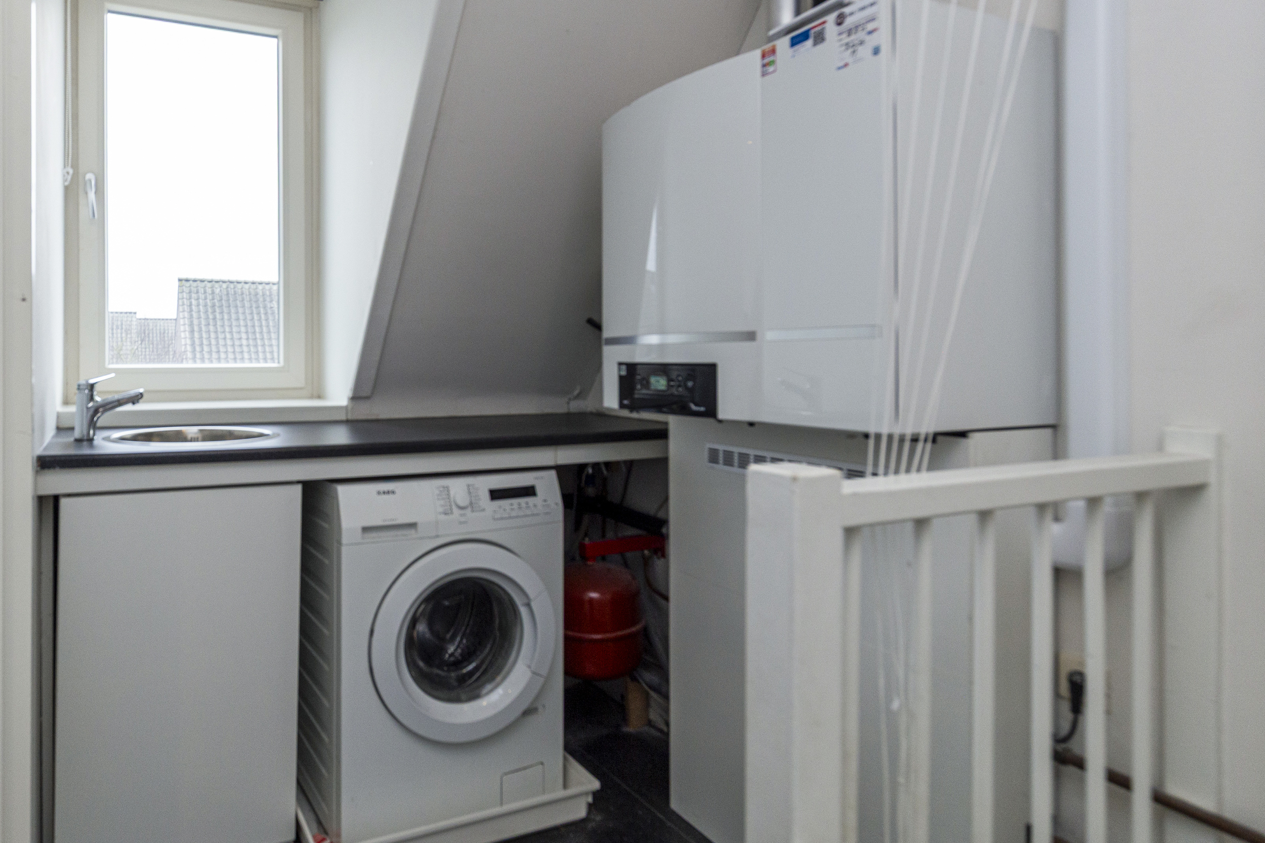 De vliering strekt zich uit over het volledige plafondoppervlak van de tweede verdieping en biedt volop extra opslagmogelijkheden. Op de overloop bevinden zich een wastafel, de aansluiting voor de wasmachine, de cv-combiketel, een airco-unit en de omvormer van de zonnepanelen. Op het dak liggen in totaal 10 zonnepanelen.