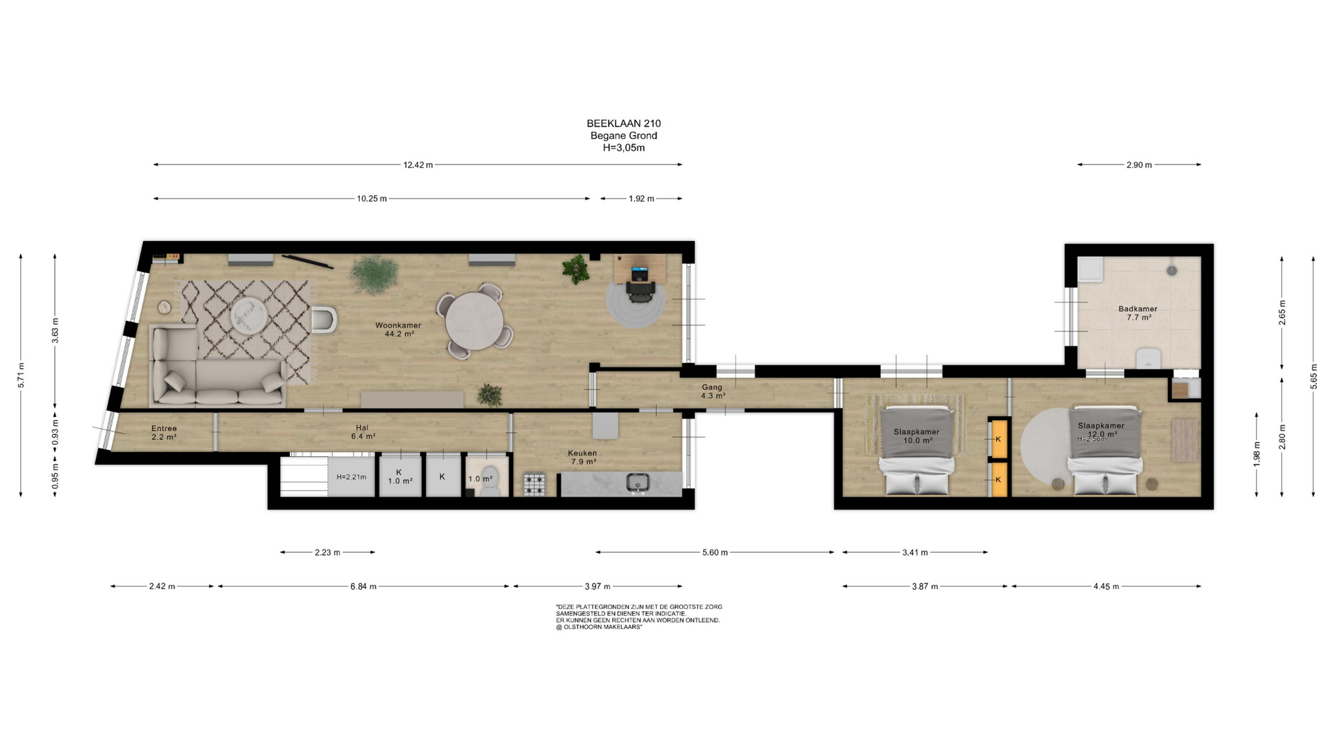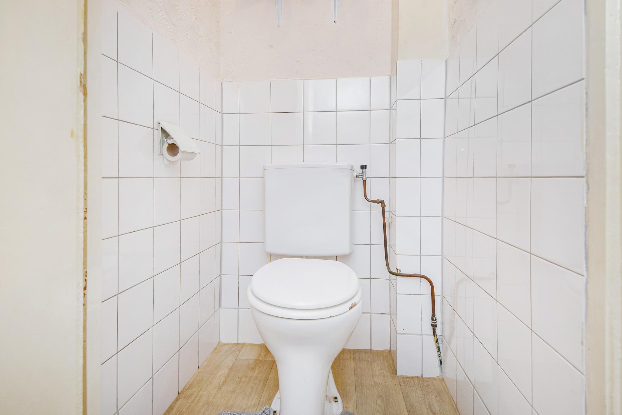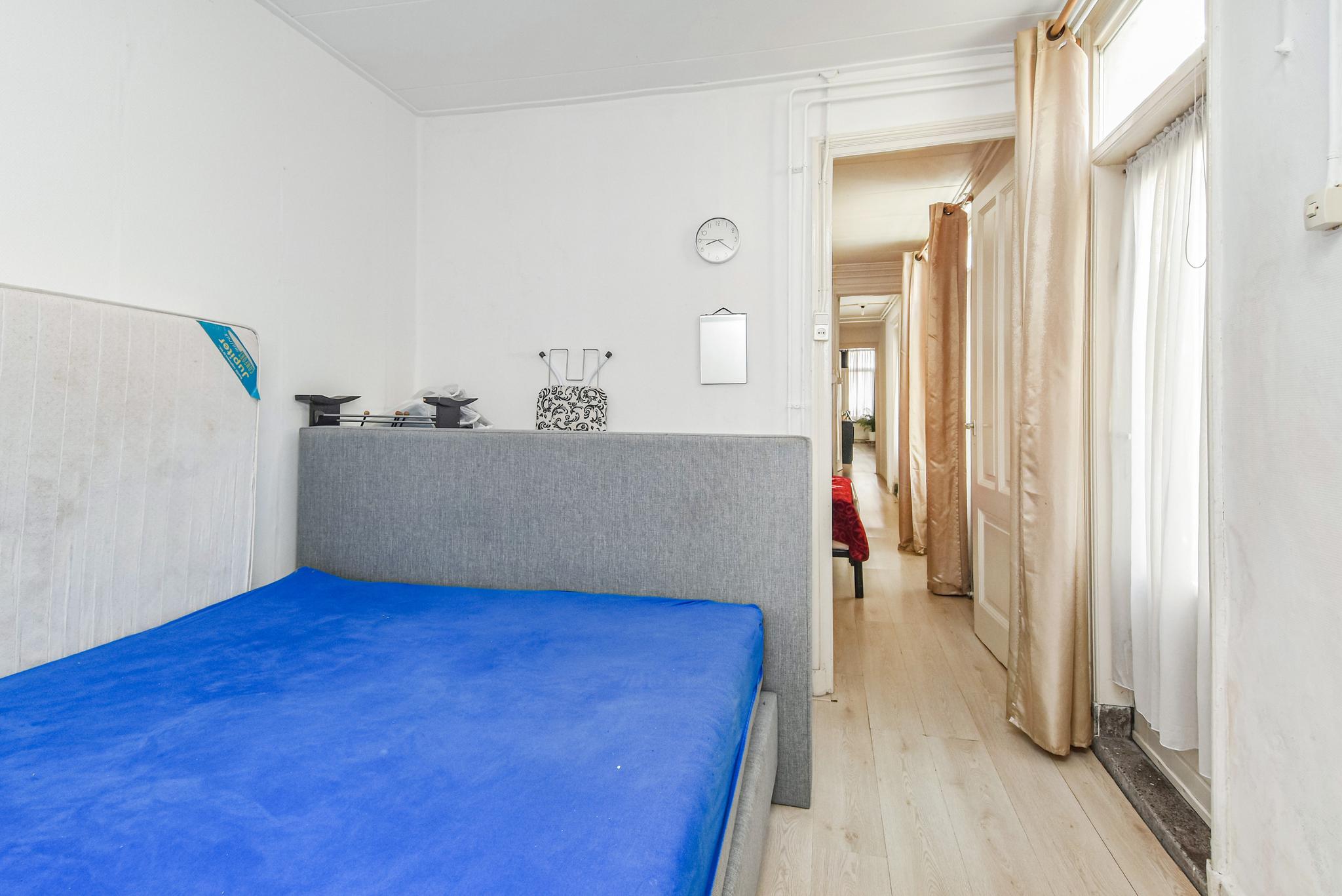 Achterin de woning leidt een gang naar de twee slaapkamers. De eerste slaapkamer is 10 m² groot beschikt over vaste kasten en de tweede, ruimere kamer van 12 m² en biedt direct toegang tot de badkamer. Deze badkamer is royaal van formaat en vormt een uitstekende basis voor een moderne, luxe afwerking te creëren – bijvoorbeeld met een inloopdouche, ligbad en dubbele wastafel.