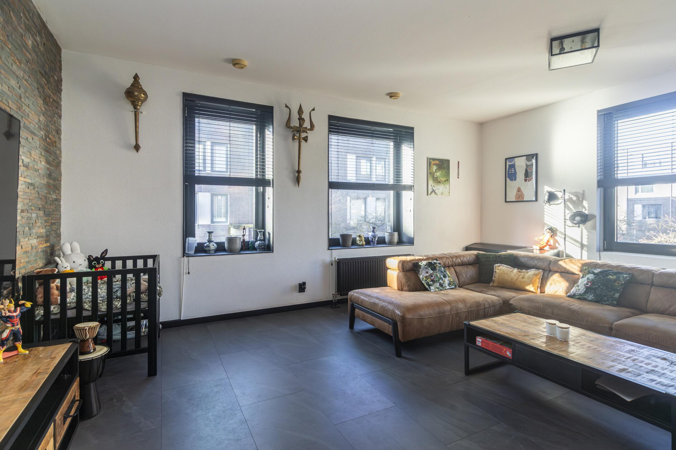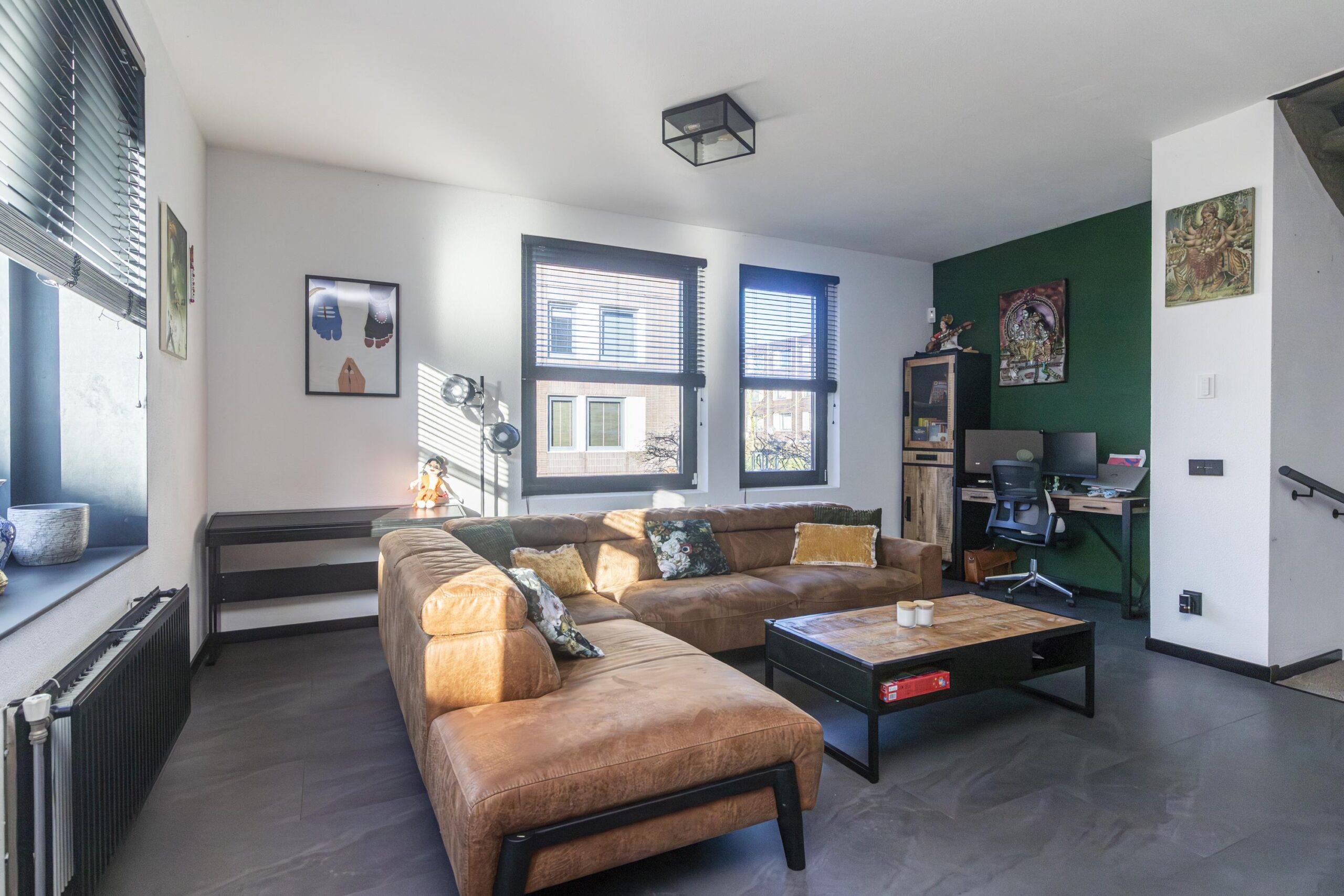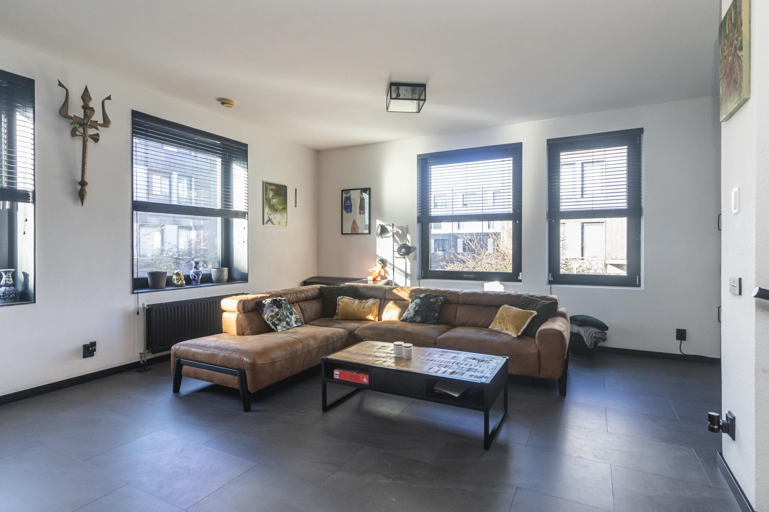 Ruime woonkamer met veel lichtinval door grote kantel/kiepramen.