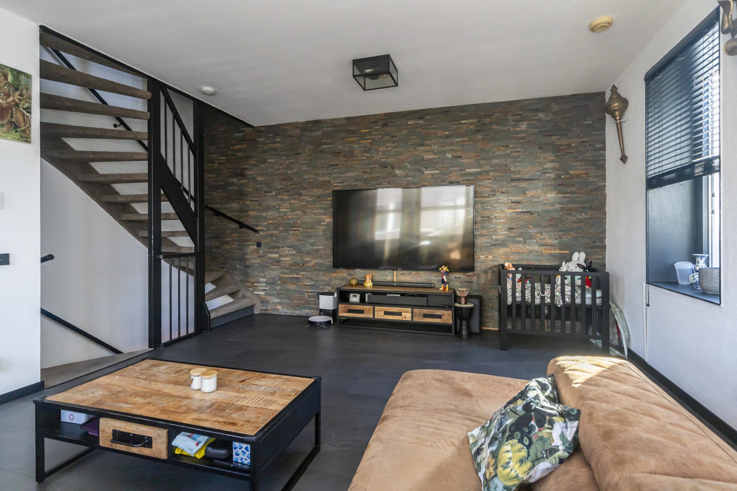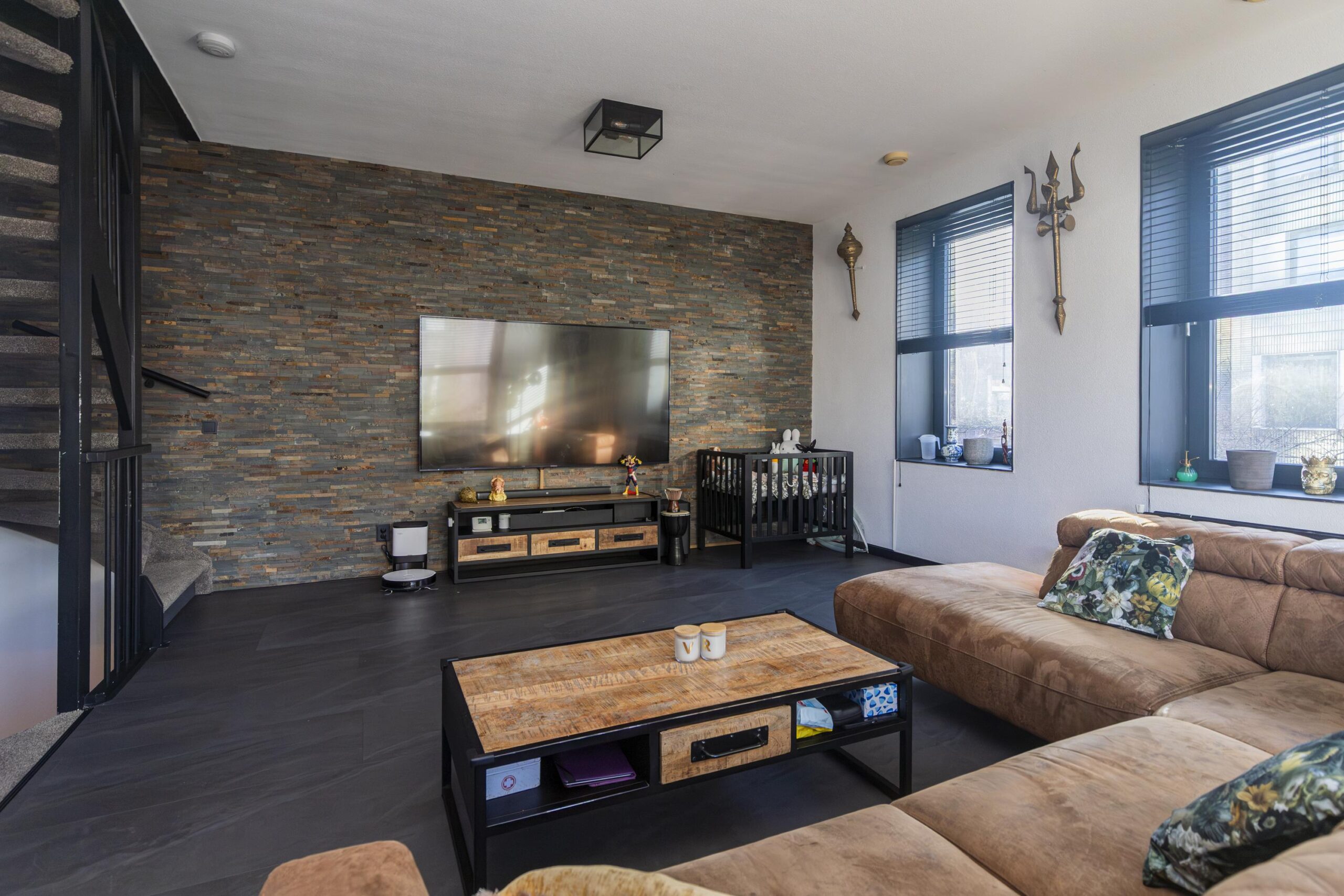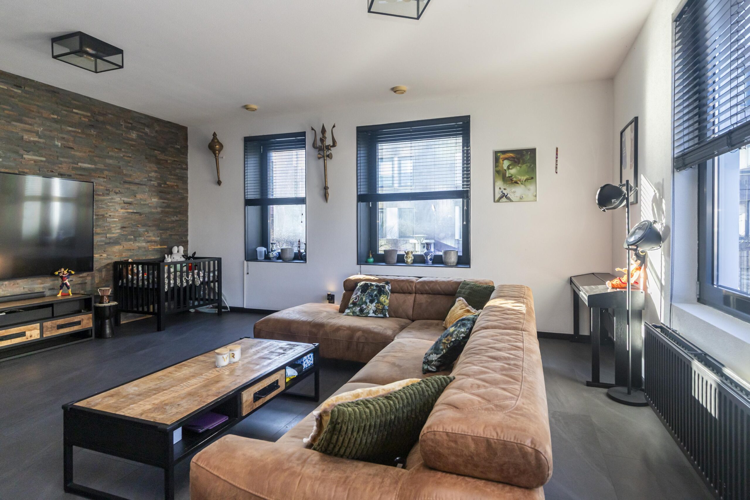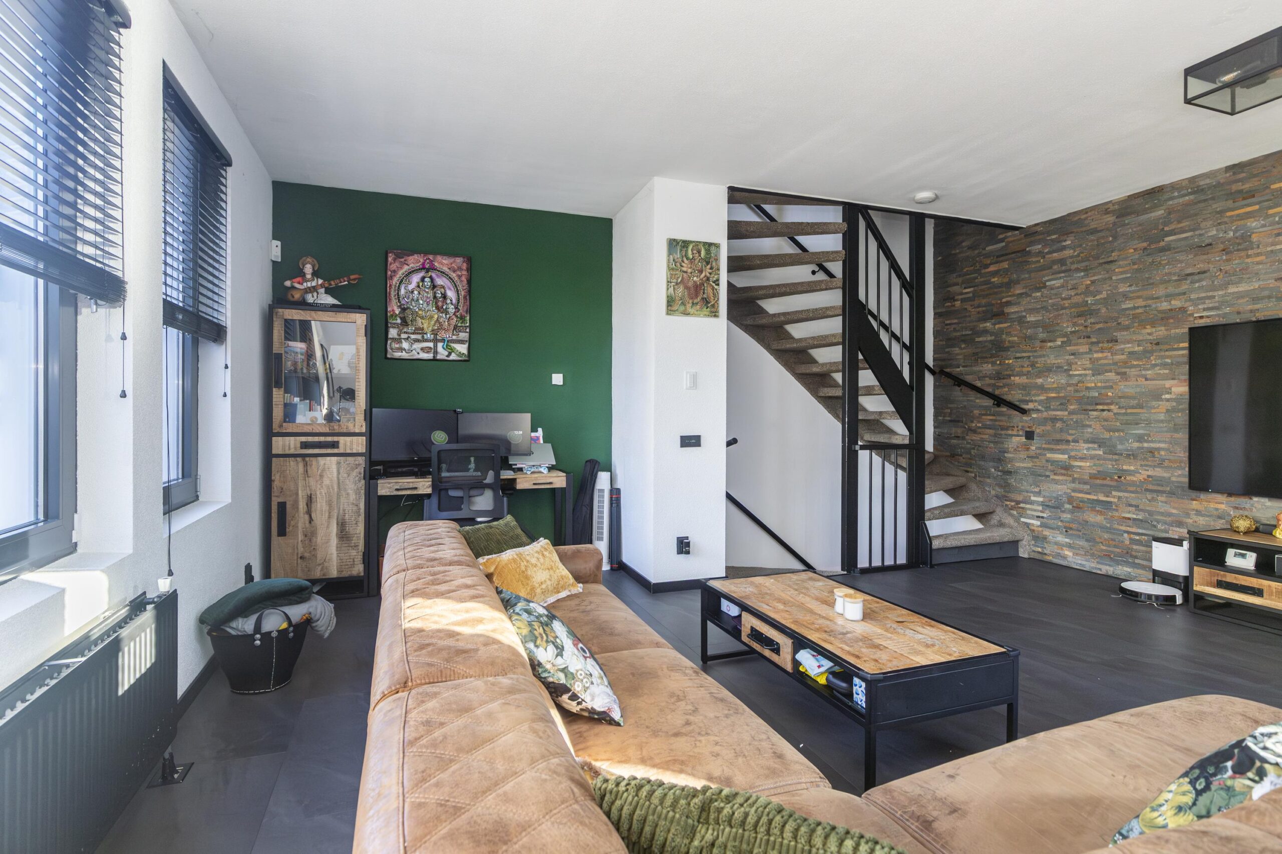 Ruime woonkamer met veel lichtinval door grote kantel/kiepramen.