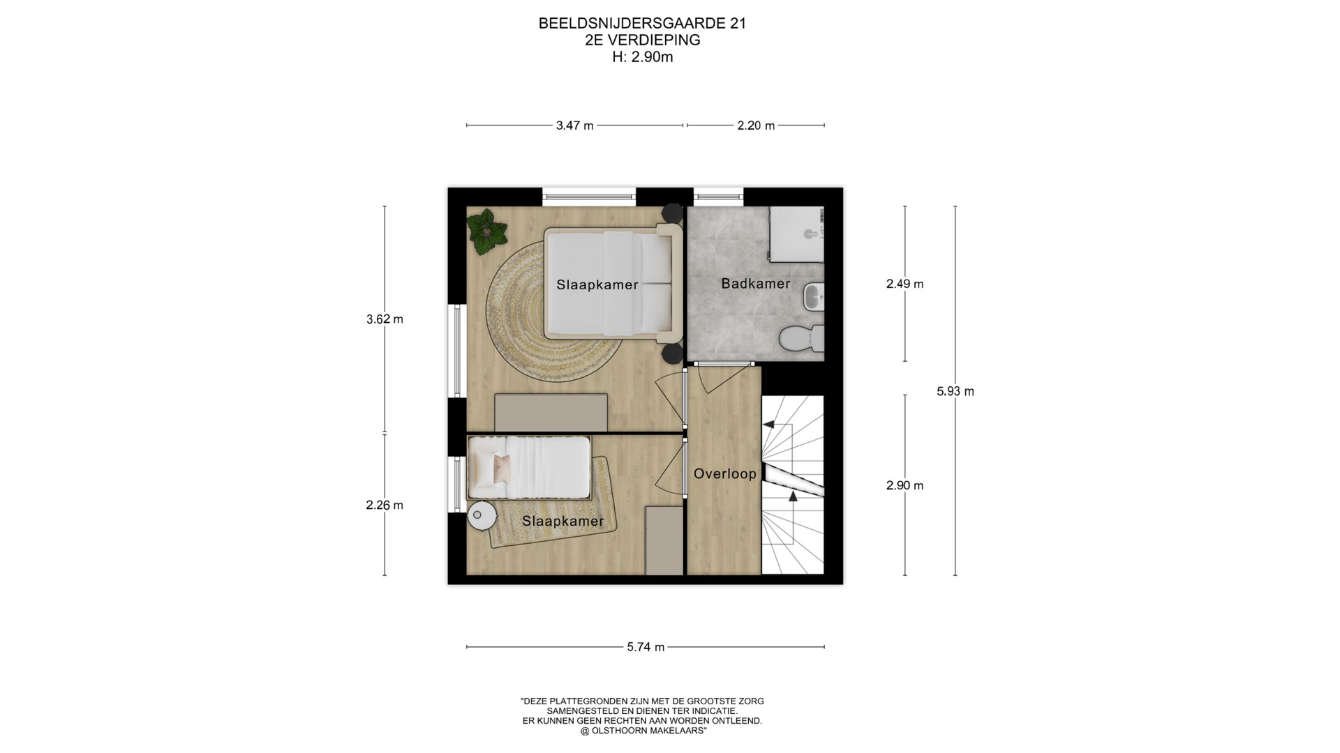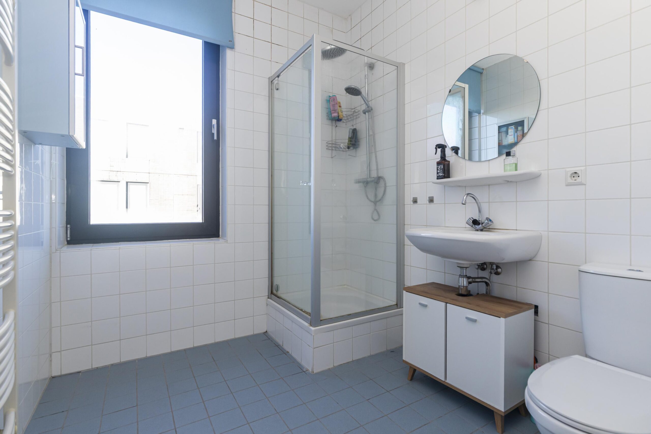 Overloop, 2 slaapkamers en badkamer met natuurlijk lichtinval en voorzien van een douchecabine, wastafel, toilet en handdoekradiator.