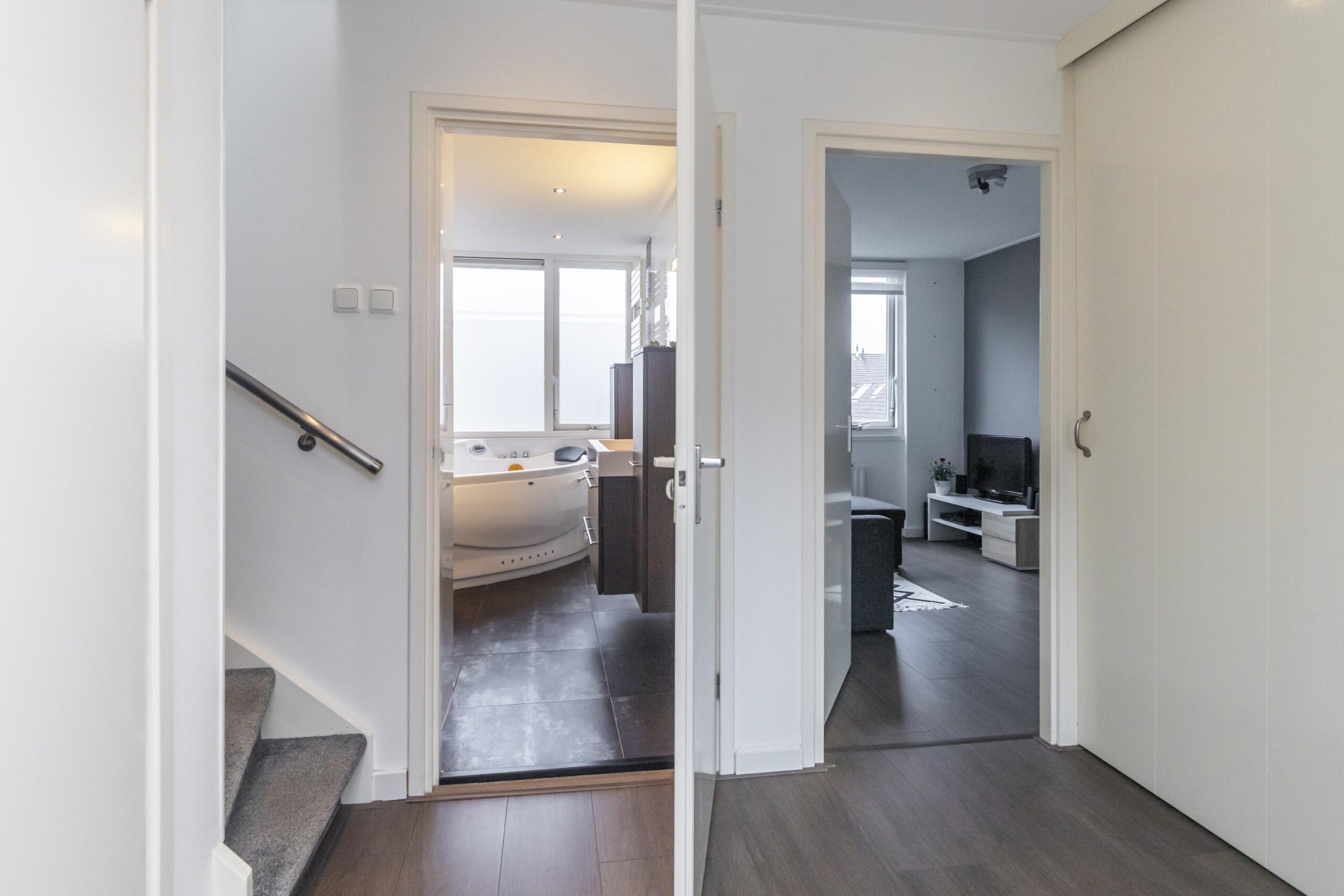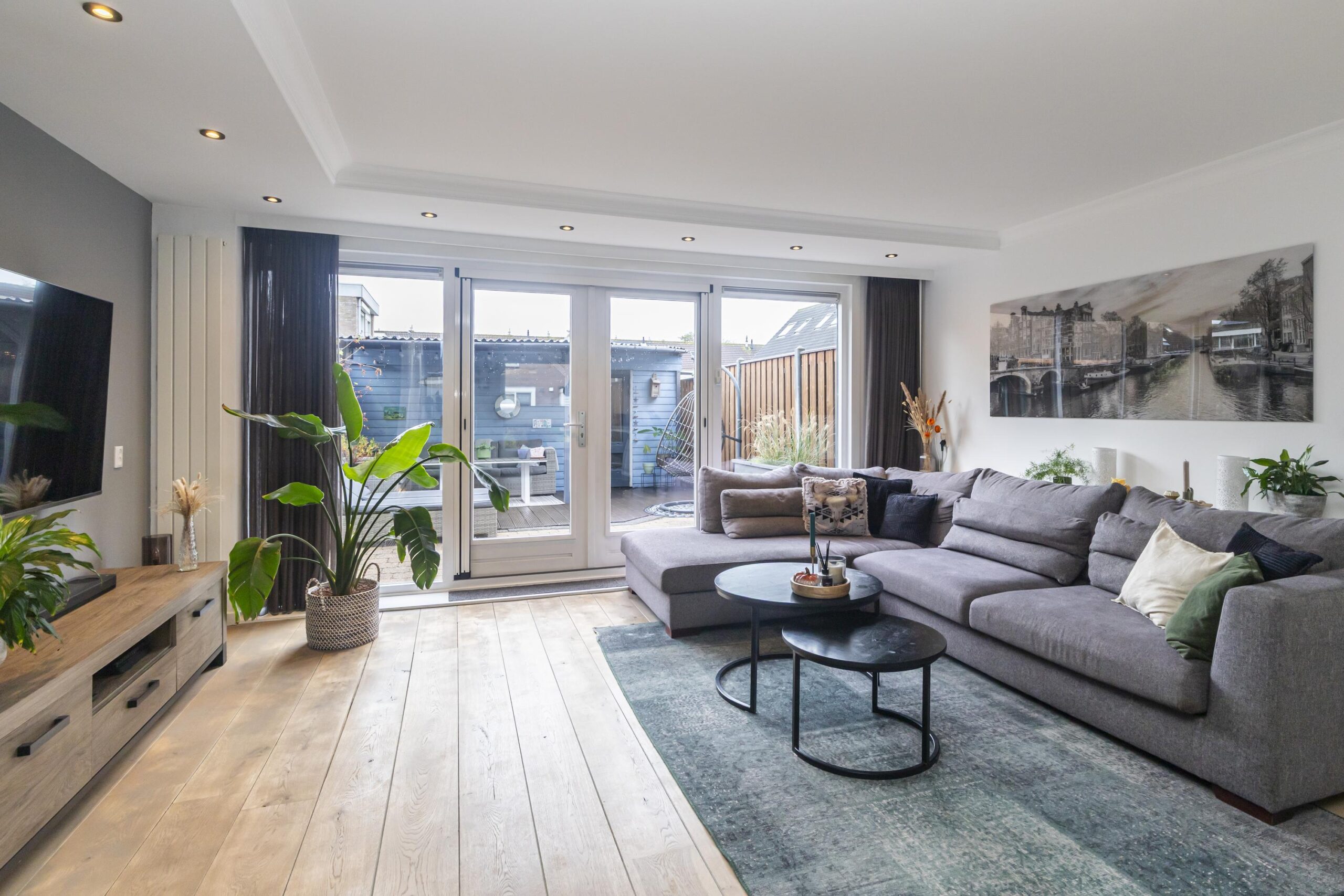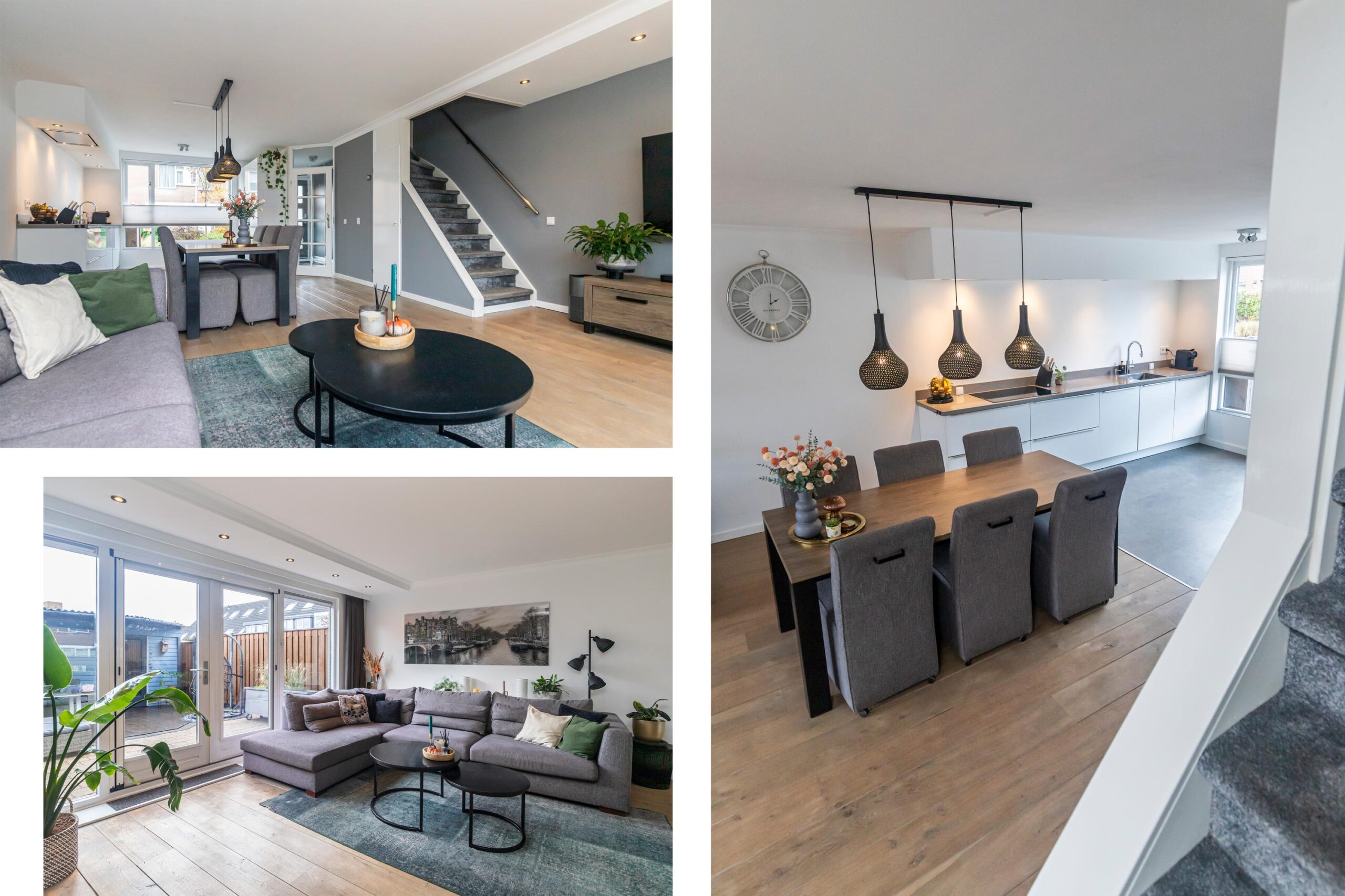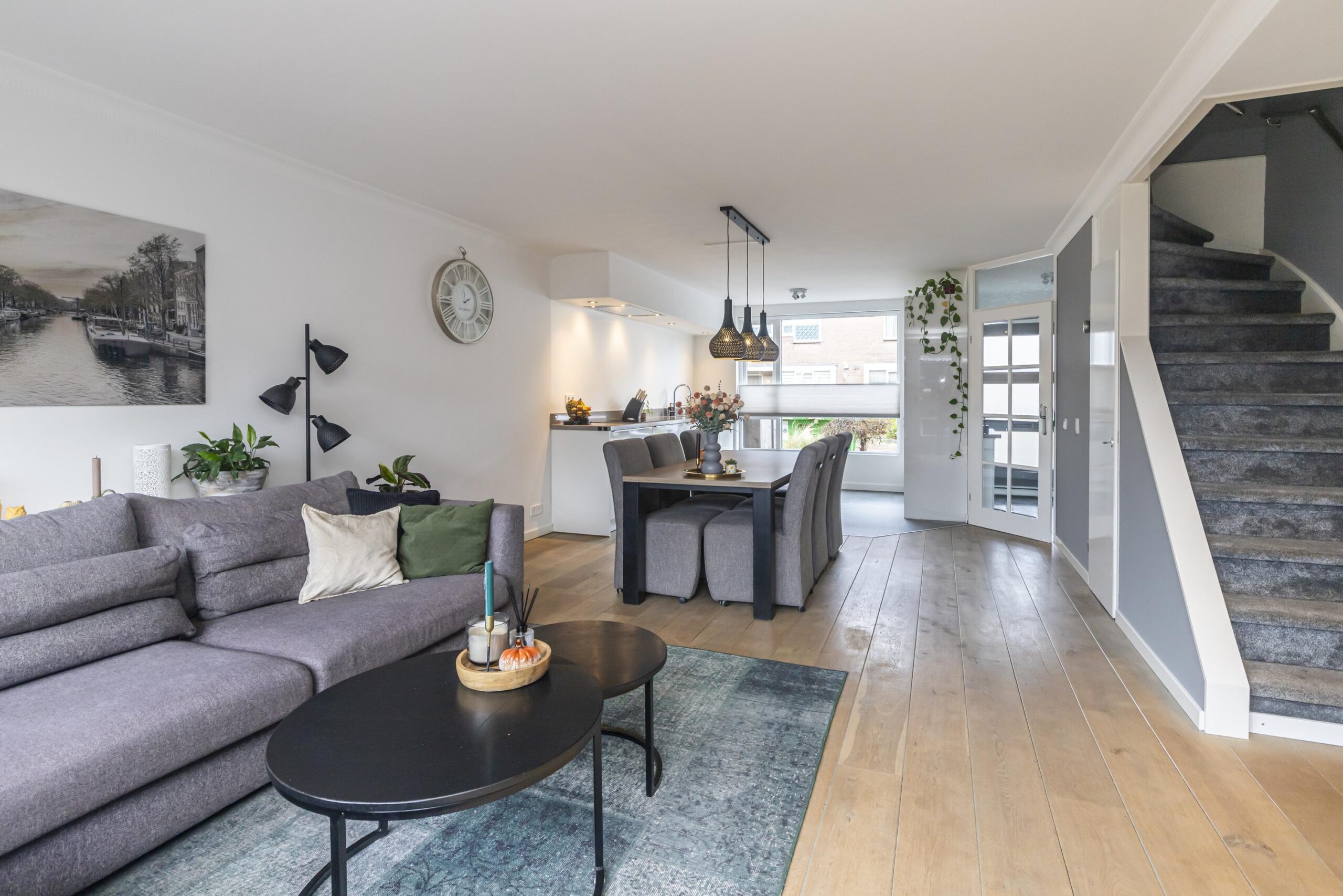 Bij binnenkomst betreedt u de lichte woonkamer met een open keuken. De keuken heeft een moderne uitstraling en beschikt over inbouwapparatuur als een koel-/ vriescombinatie, vaatwasmachine, Quooker, inductiekookplaat, afzuigkap en een stenen werkblad. De begane grond is deels voorzien van een luxe lamel parket vloer en deels van een pvc vloer. De openslaande deuren naar de ruime achtertuin bieden een fijn uitzicht en veel daglicht. De tuin is ideaal voor het ontvangen van vrienden en familie of om lekker te ontspannen na een lange werkdag.
