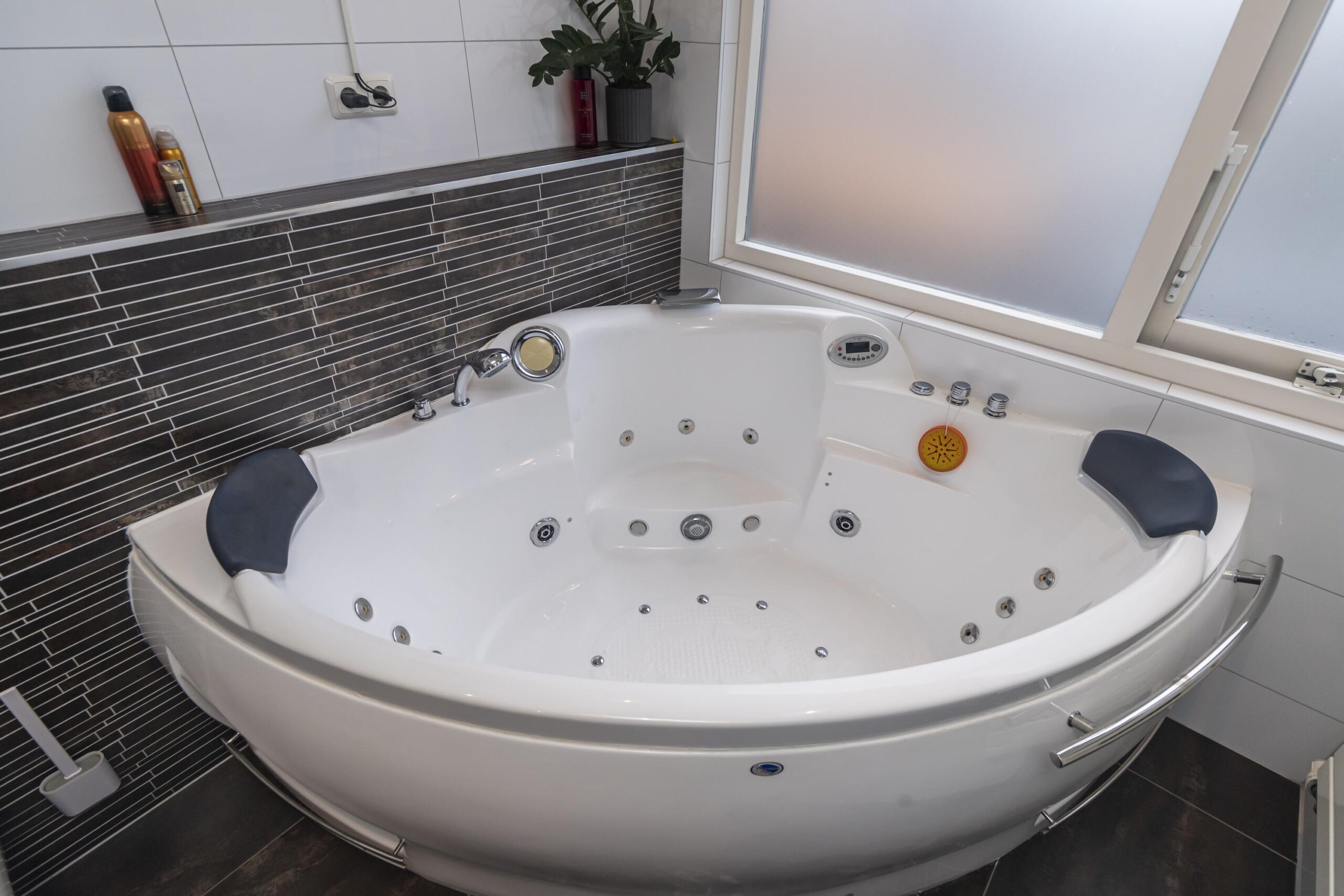 - Badkamervoorzieningen Ligbad, toilet, douche, dubbele wastafel, wastafelmeubel