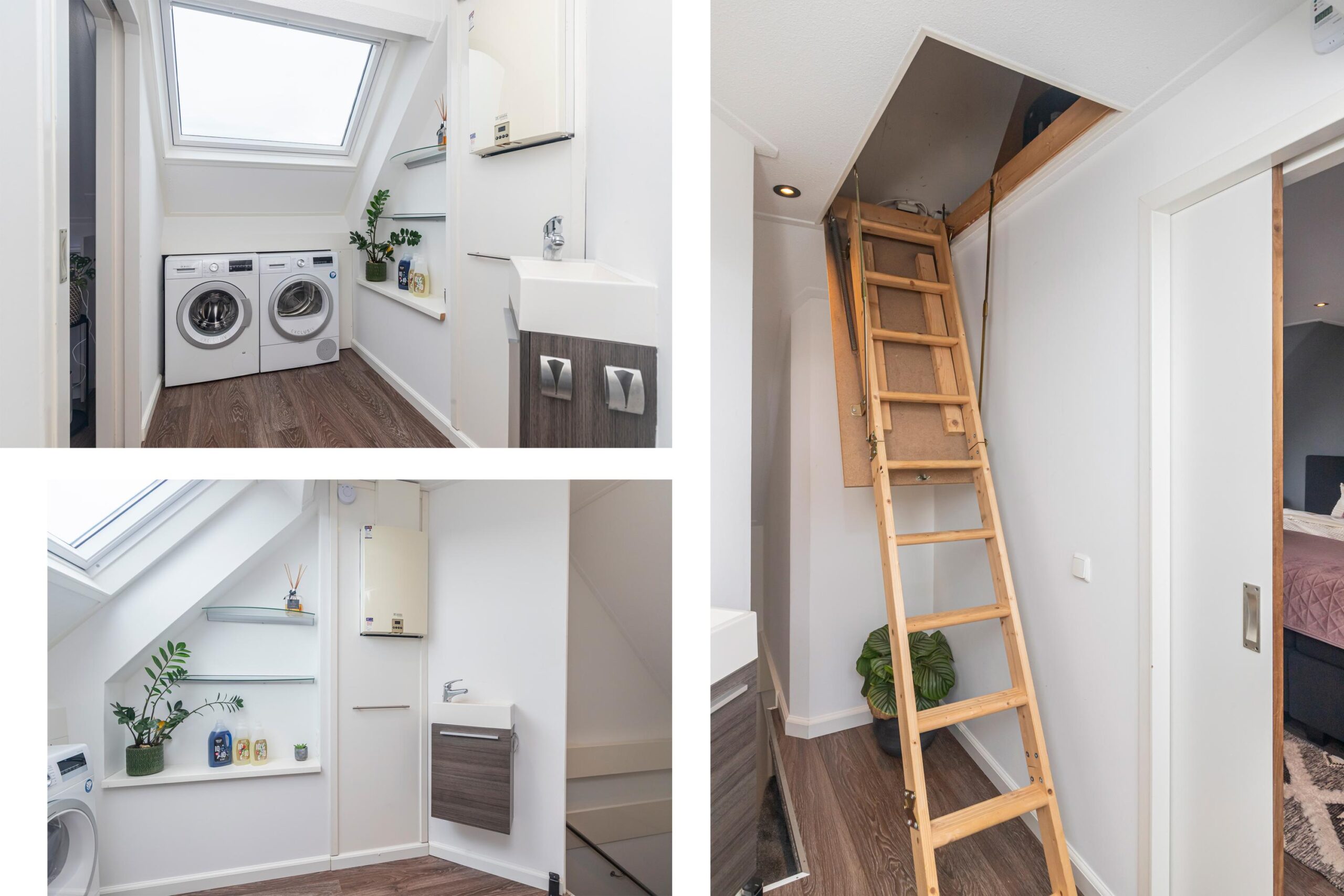 Op de tweede verdieping, vindt u een vierde slaapkamer, perfect voor een tiener, logeerkamer of een thuiswerkplek. Op de overloop is er aan de voorzijde ruimte met aansluitingen voor de wasmachine, droger en CV-ketel. De bergvliering is bereikbaar vanaf de overloop middels een vlizo trap.