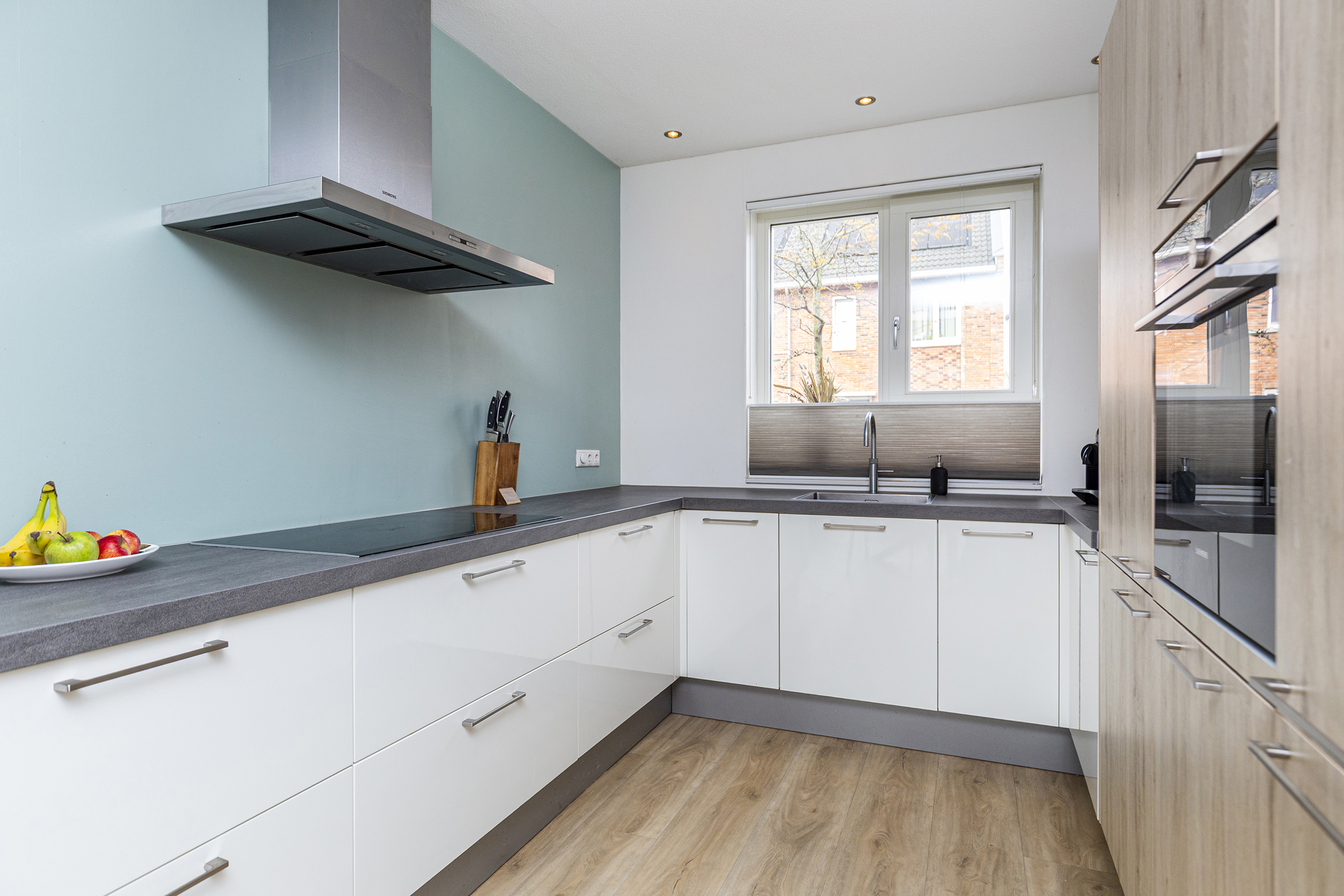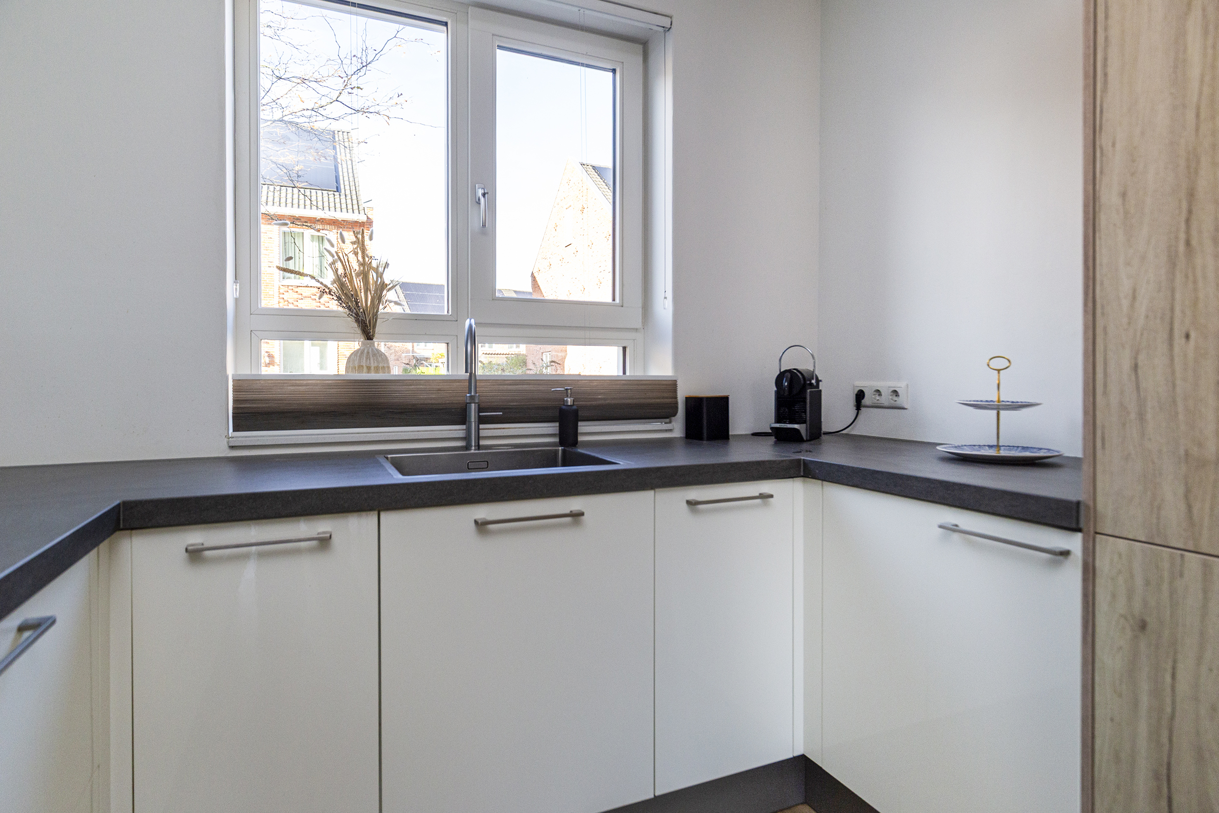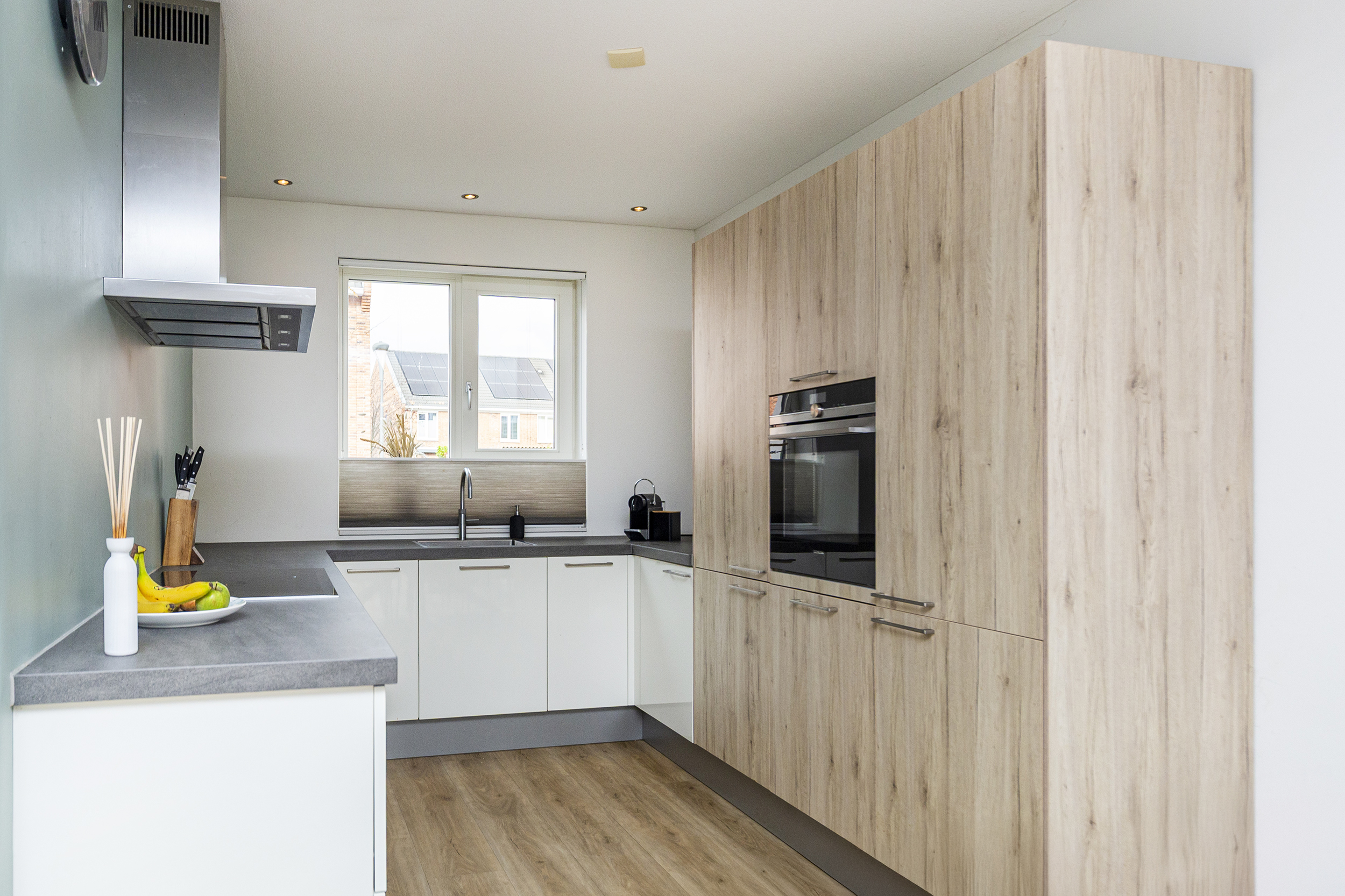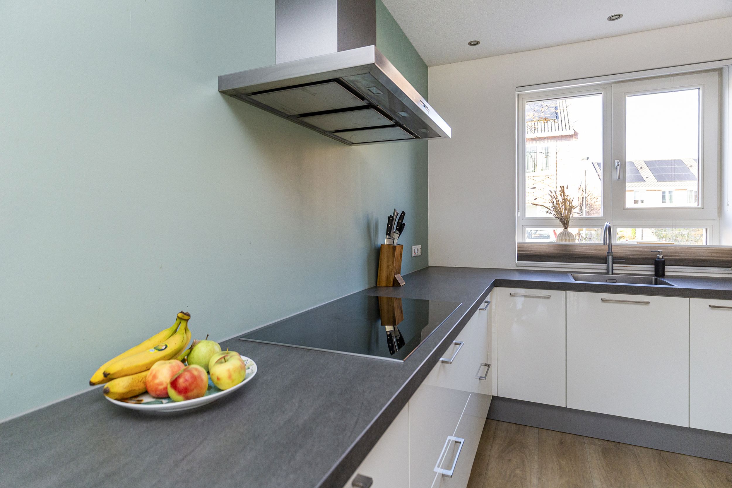 In de hal vinden wij de meterkast, modern toilet met fonteintje, trap naar de 1e verdieping en toegang tot de ruime en lichte woonkamer. De lichte woonkamer is voorzien van een prachtige pvc-vloer met vloerverwarming en koeling. Via de schuifpui komen we in de fraai aangelegde achtertuin gelegen op het zuidoosten met genoeg ruimte voor een eettafel en heerlijke loungehoek. Daarachter is er een houten berging met elektra en achterom en parkeerplaats. Daar bevindt zich ook de aansluiting voor een elektrische laadpaal. Aan de voorzijde van de woning bevindt zich de zeer luxe open keuken. De smaakvolle keuken is voorzien van alle luxe te weten; kookwaterkraan (Quooker), inductie kookplaat met recirculatiekap, vaatwasser, combi-oven met hete lucht functie en koel-vriescombinatie