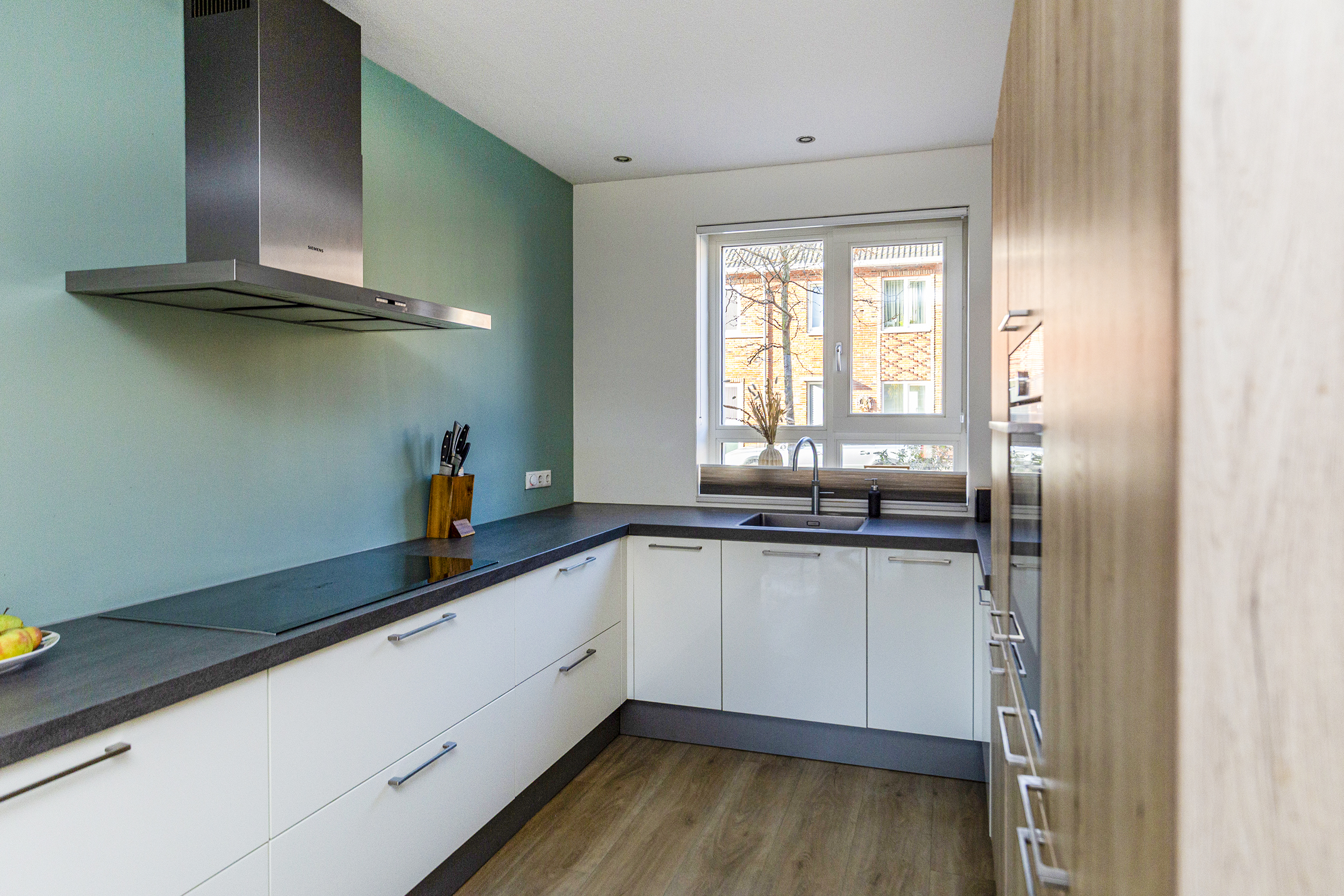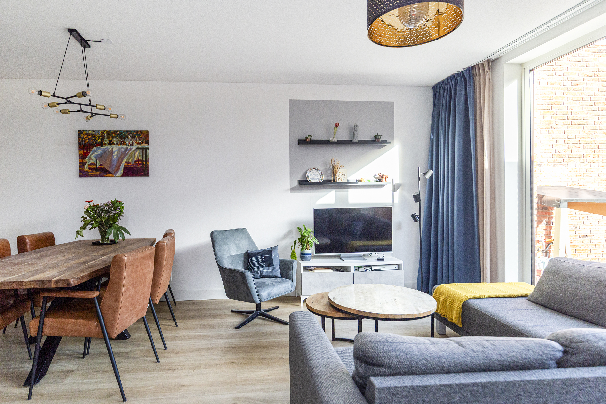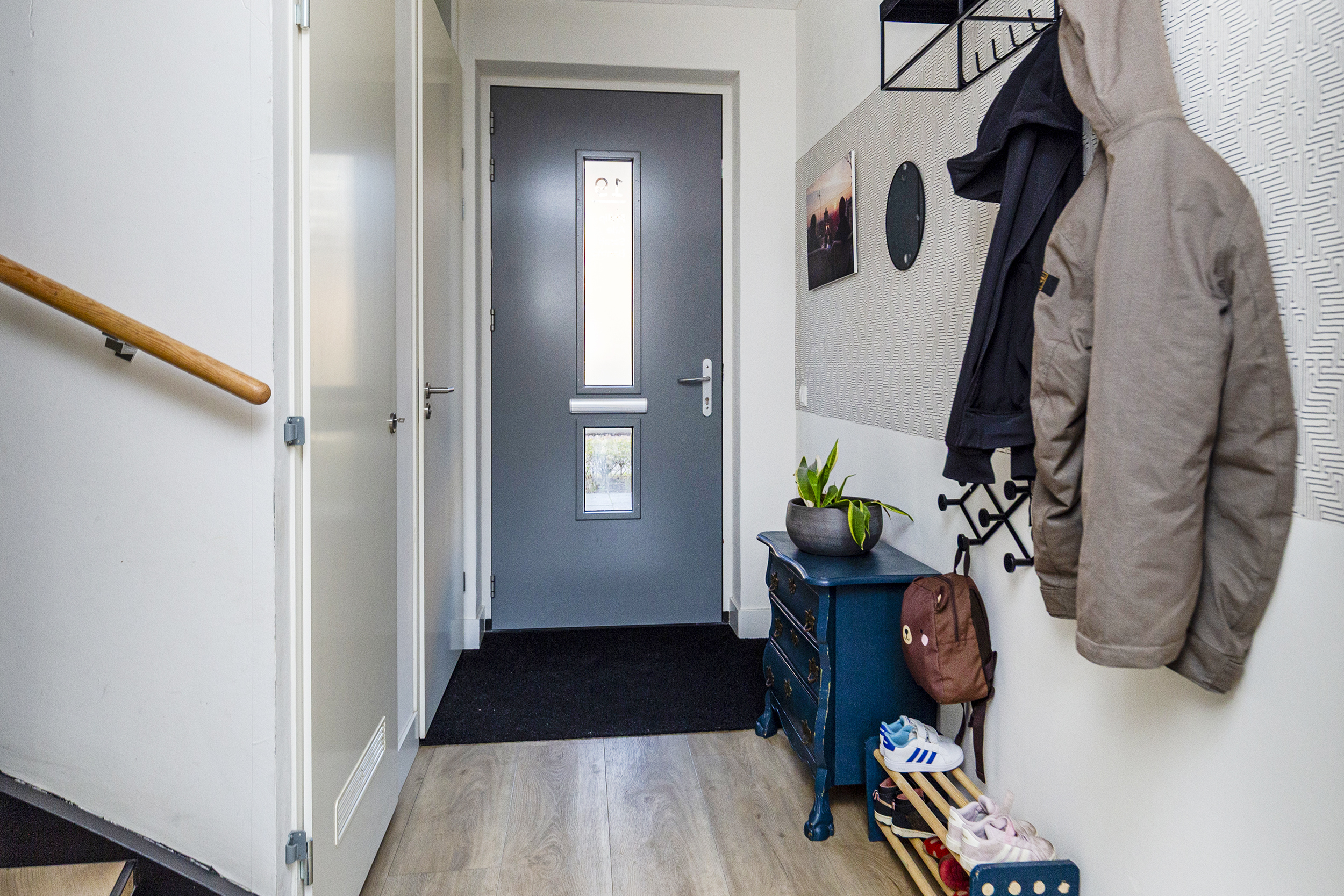 In de hal vinden wij de meterkast, modern toilet met fonteintje, trap naar de 1e verdieping en toegang tot de ruime en lichte woonkamer. De lichte woonkamer is voorzien van een prachtige pvc-vloer met vloerverwarming en koeling. Via de schuifpui komen we in de fraai aangelegde achtertuin gelegen op het zuidoosten met genoeg ruimte voor een eettafel en heerlijke loungehoek. Daarachter is er een houten berging met elektra en achterom en parkeerplaats. Daar bevindt zich ook de aansluiting voor een elektrische laadpaal. Aan de voorzijde van de woning bevindt zich de zeer luxe open keuken. De smaakvolle keuken is voorzien van alle luxe te weten; kookwaterkraan (Quooker), inductie kookplaat met recirculatiekap, vaatwasser, combi-oven met hete lucht functie en koel-vriescombinatie
