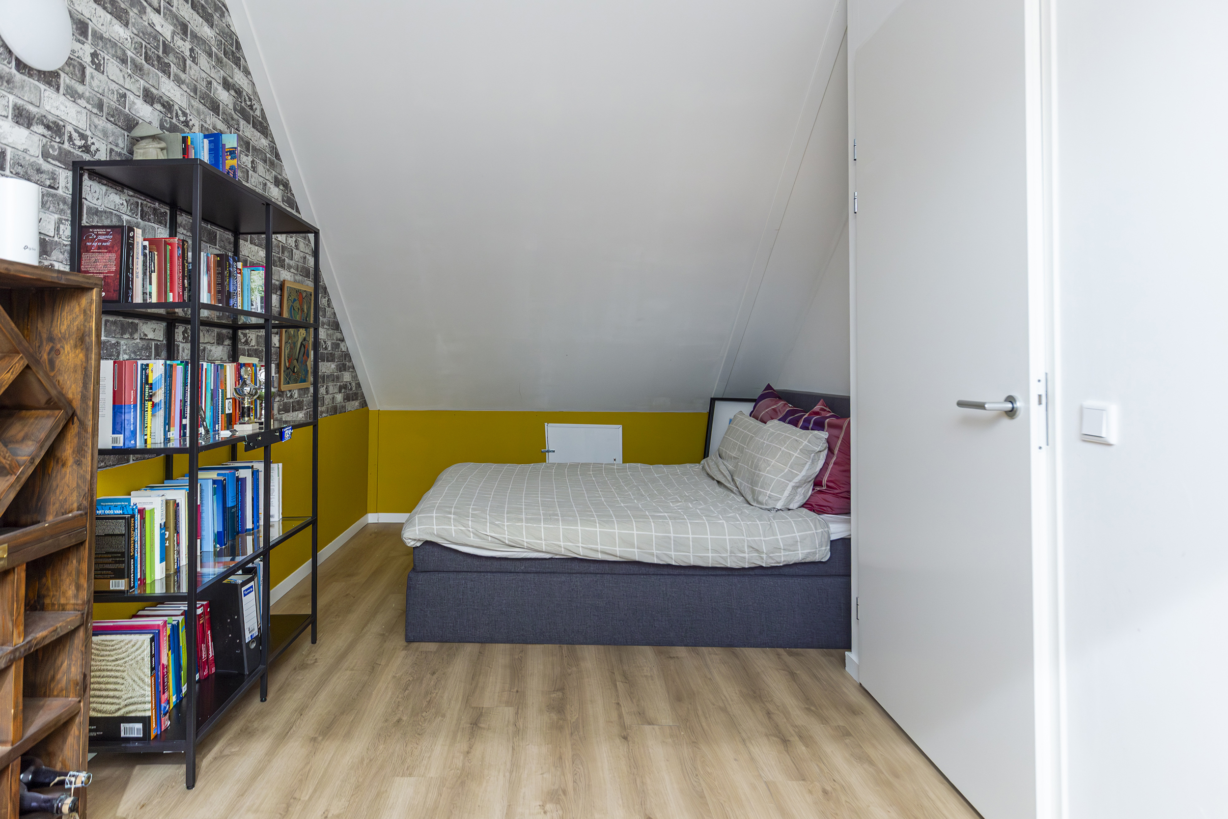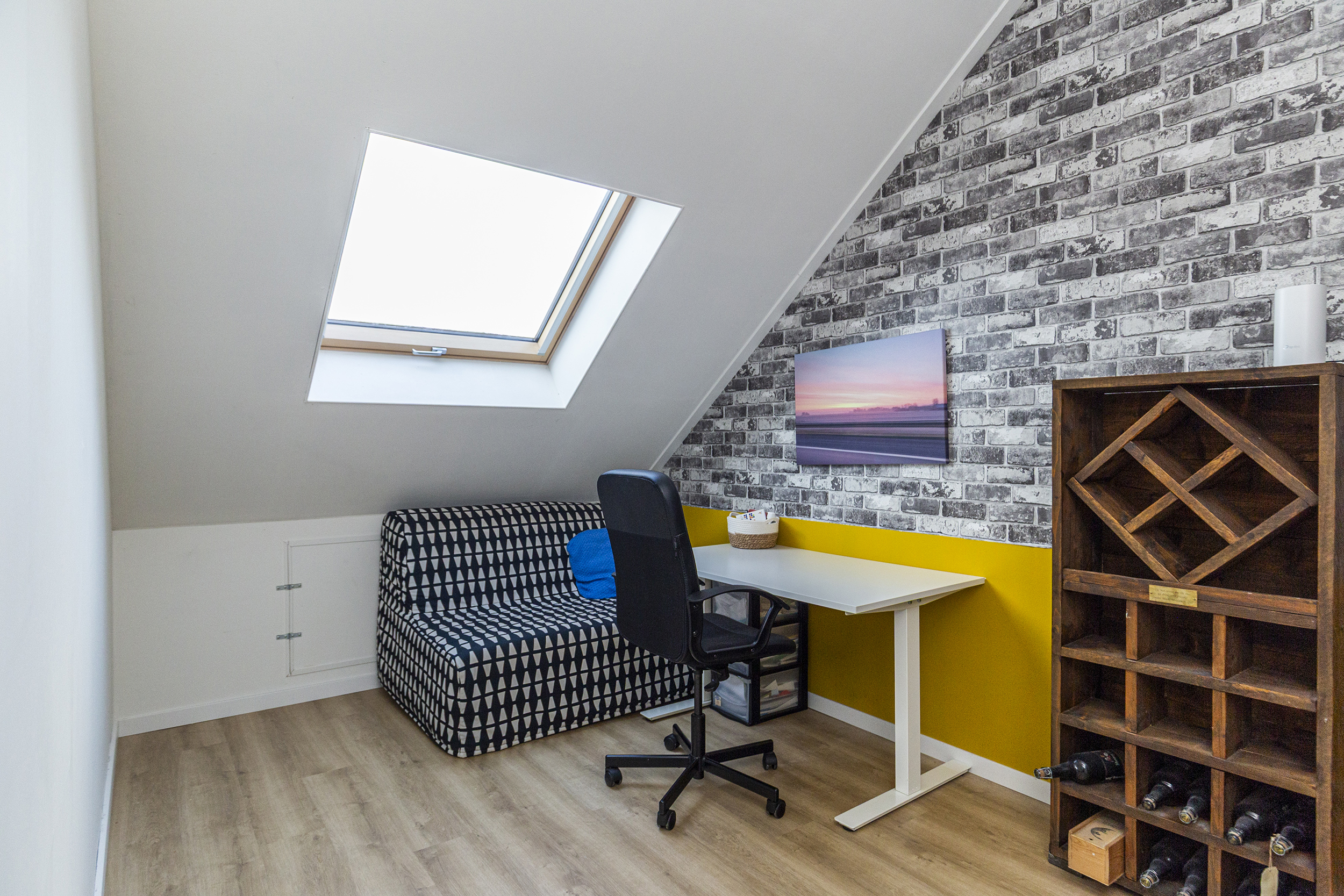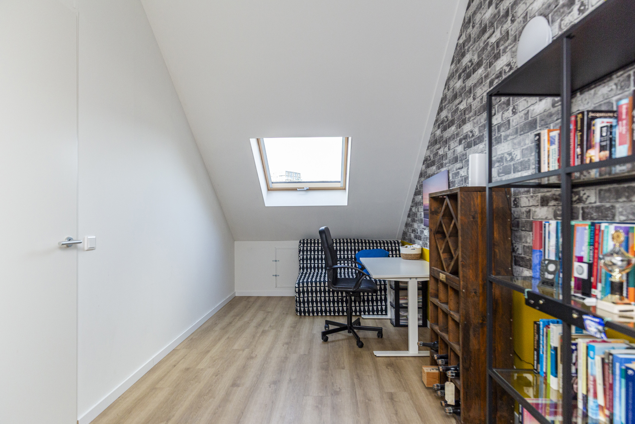 Via de overloop bereiken we de grote ingedeelde zolder etage. Vanuit de overloop bereik je eveneens een afgesloten technische ruimte, met wasmachine en drogeraansluiting, omvormer voor de zonnepanelen en WTW-unit. Ook deze verdieping heeft een pvc houtlook vloerafwerking en toegang tot de afgesloten vierde slaapkamer.