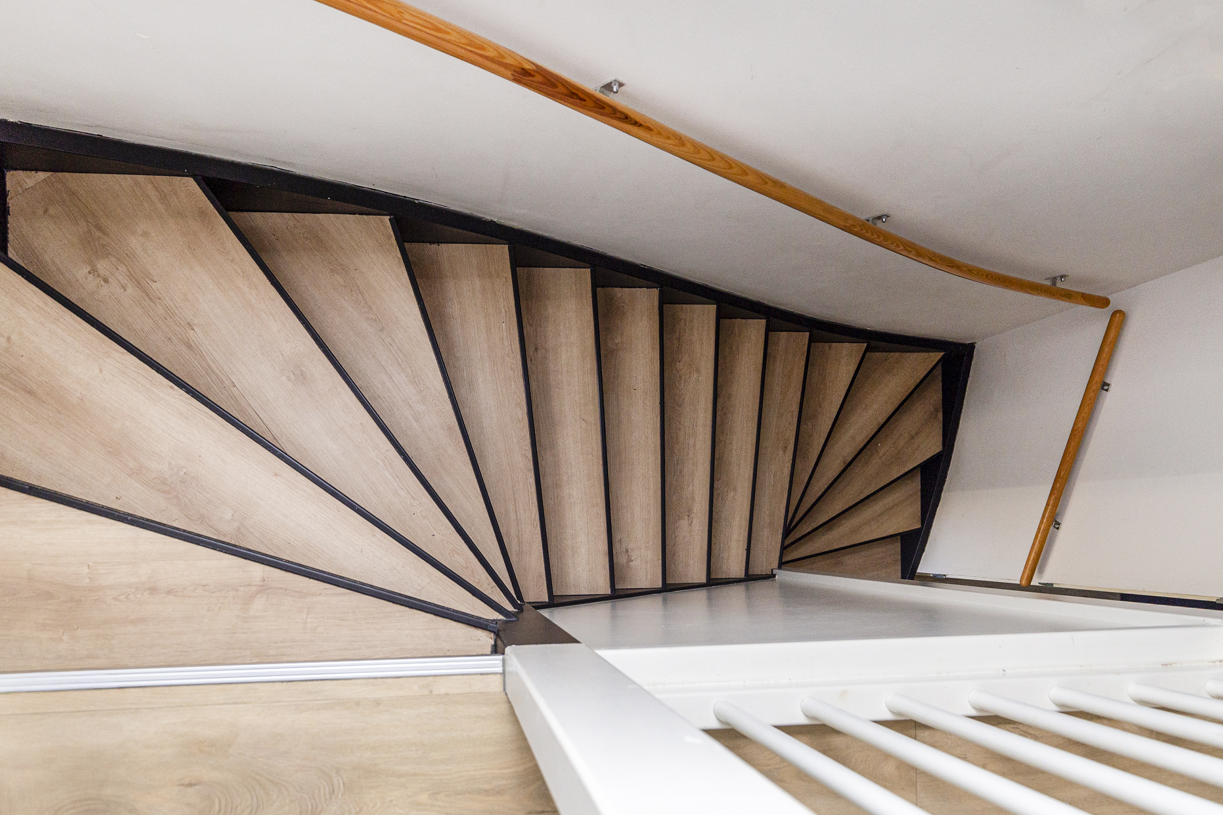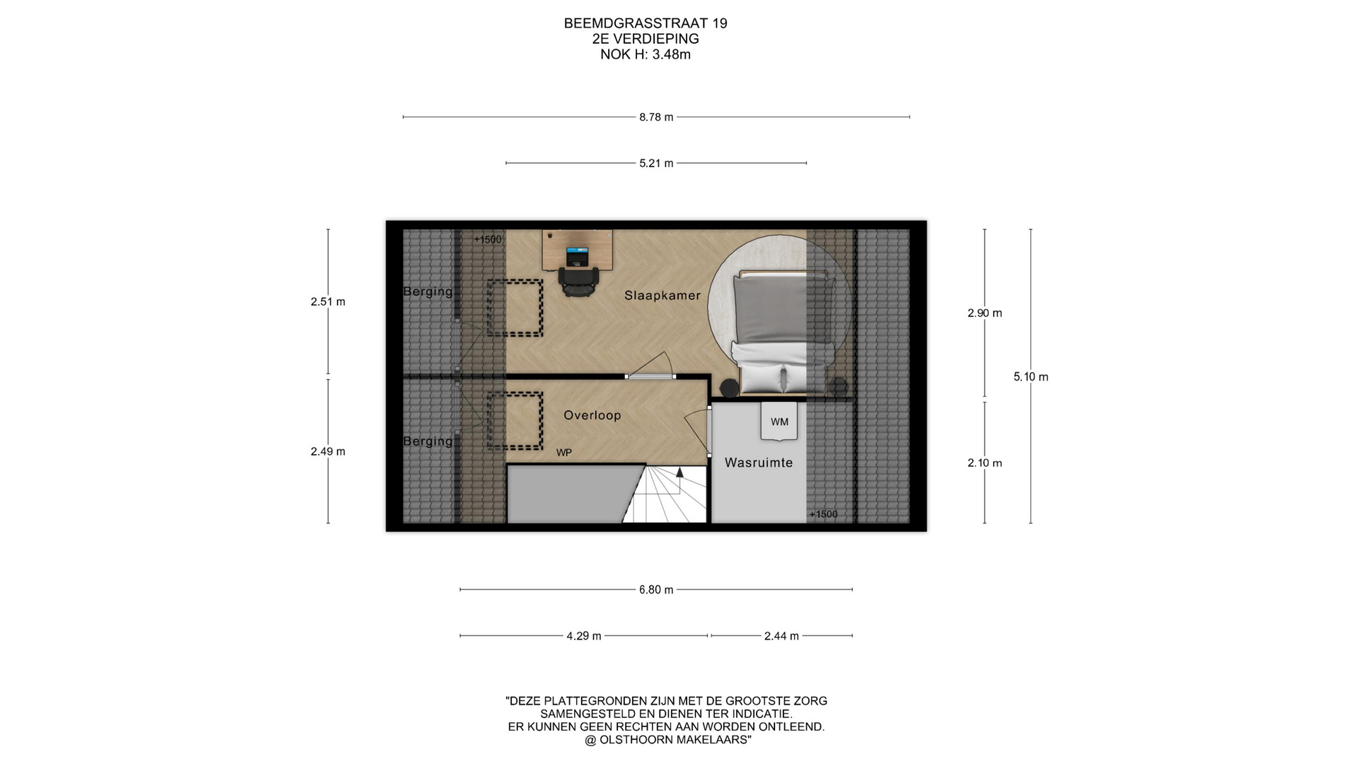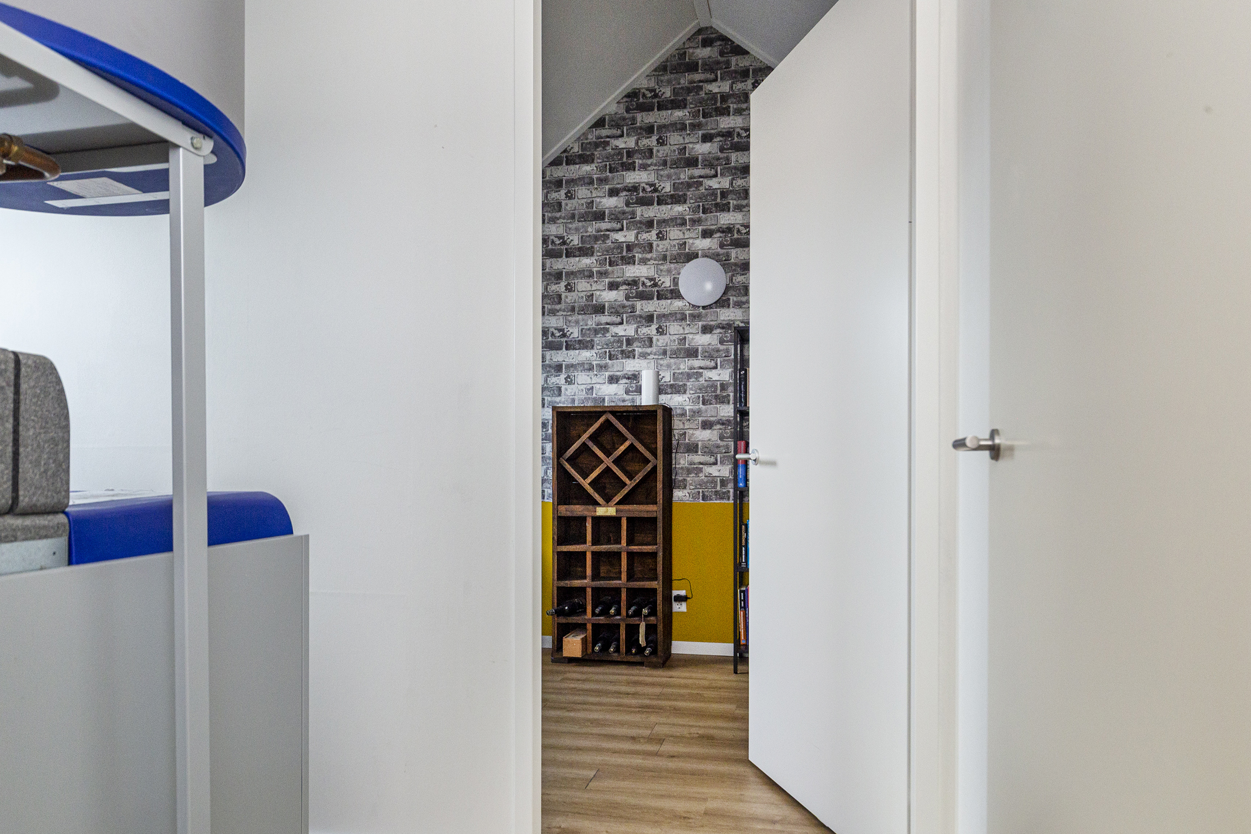 Via de overloop bereiken we de grote ingedeelde zolder etage. Vanuit de overloop bereik je eveneens een afgesloten technische ruimte, met wasmachine en drogeraansluiting, omvormer voor de zonnepanelen en WTW-unit. Ook deze verdieping heeft een pvc houtlook vloerafwerking en toegang tot de afgesloten vierde slaapkamer.