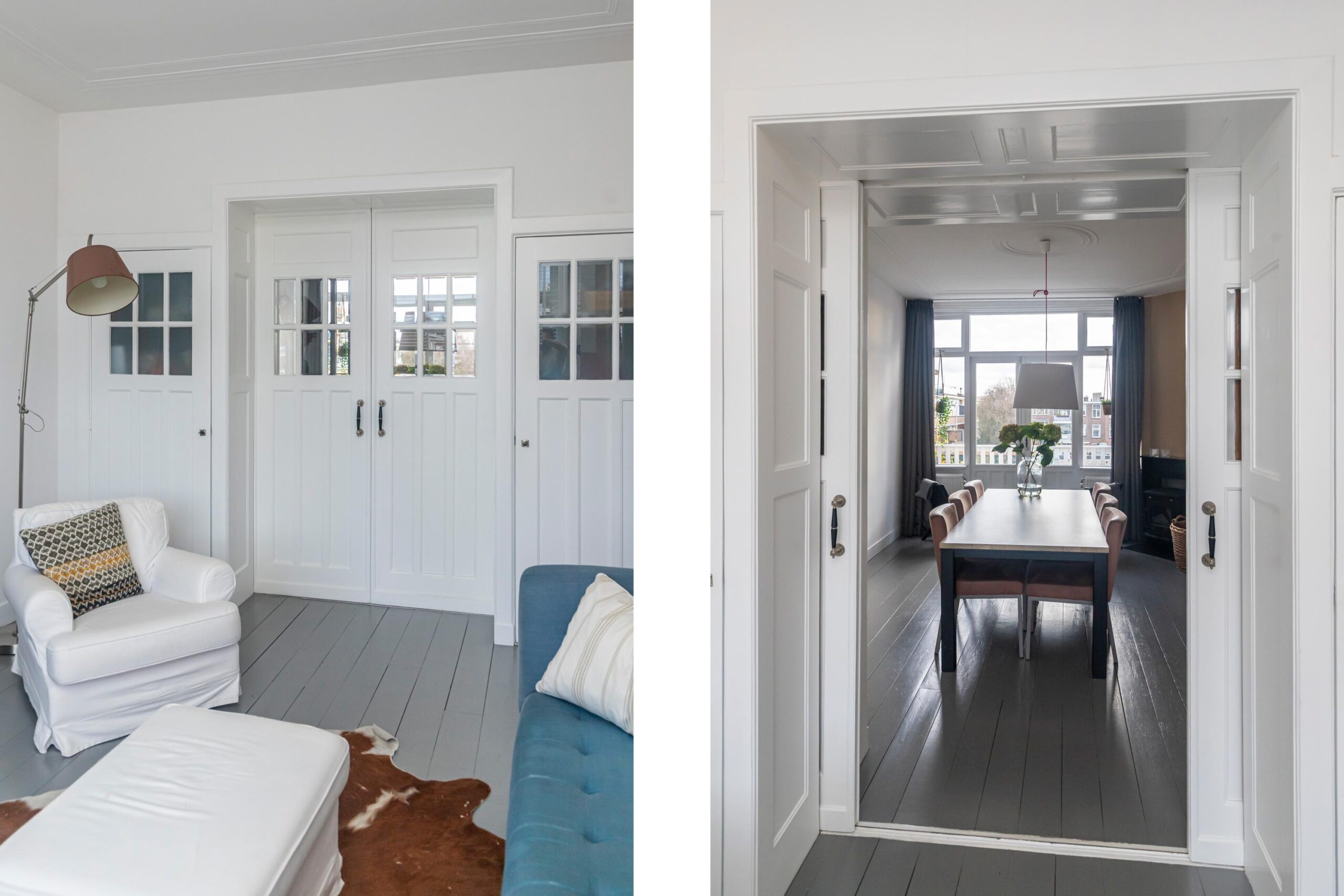 De royale woonkamer-en-suite met twee originele schouwen, schuifseparatie met facetglas, hoge plafonds en vier vaste kasten is een heerlijke plek om te ontspannen of te ontvangen. De grote ramen zorgen voor veel daglicht en een open gevoel. Vanuit de woonkamer stap je direct het balkon op, gelegen op het noordoosten – ideaal voor een kop koffie in de ochtendzon.