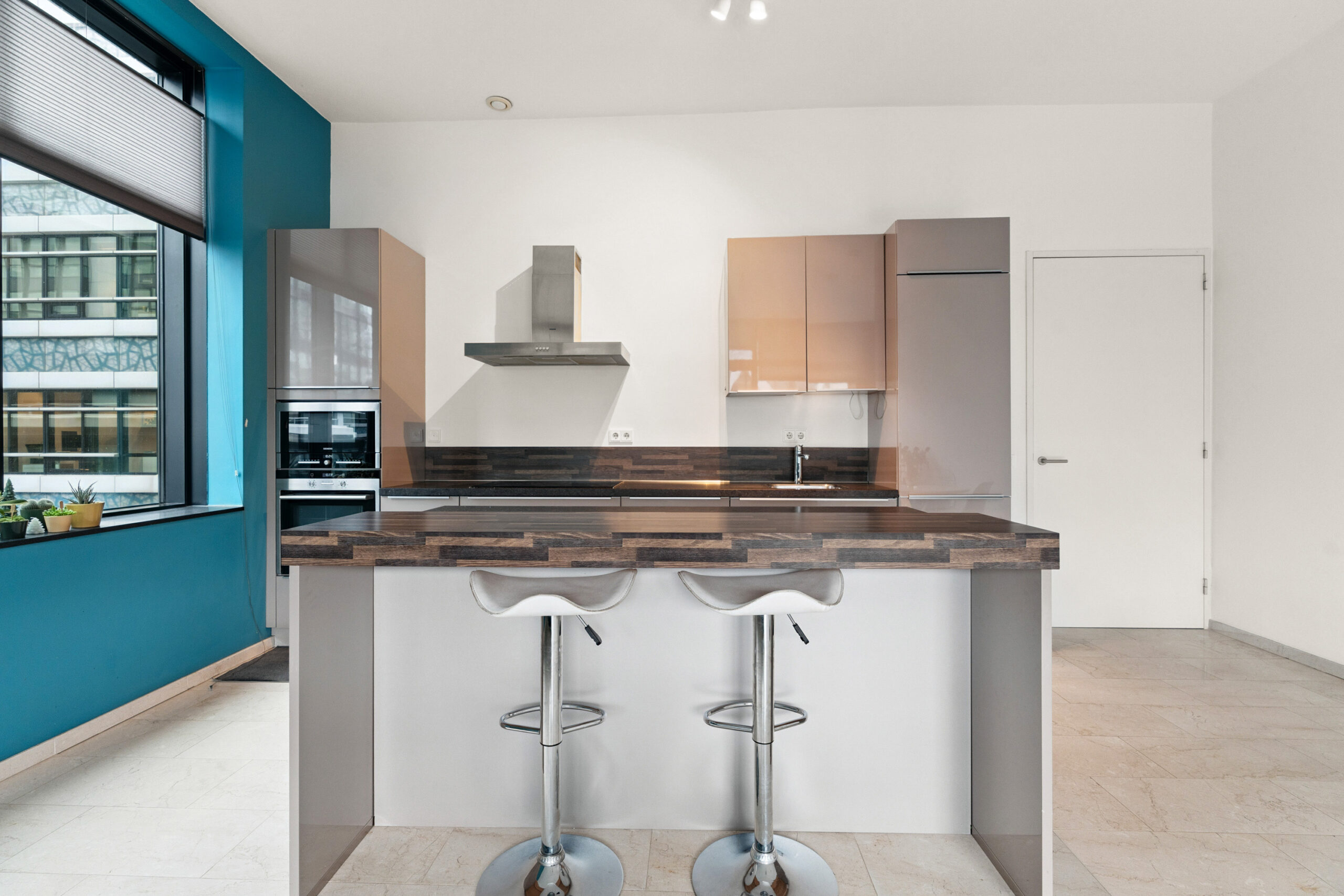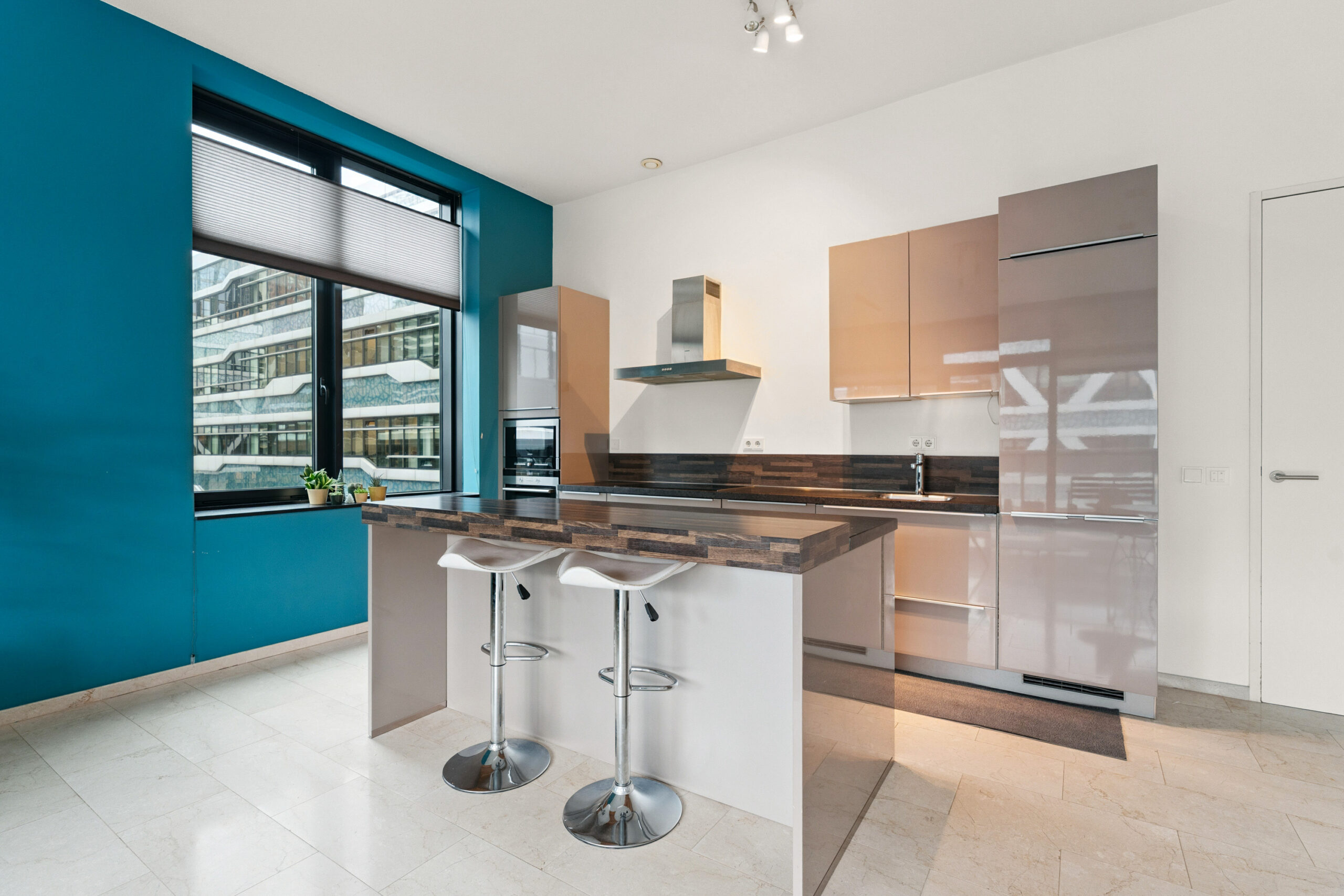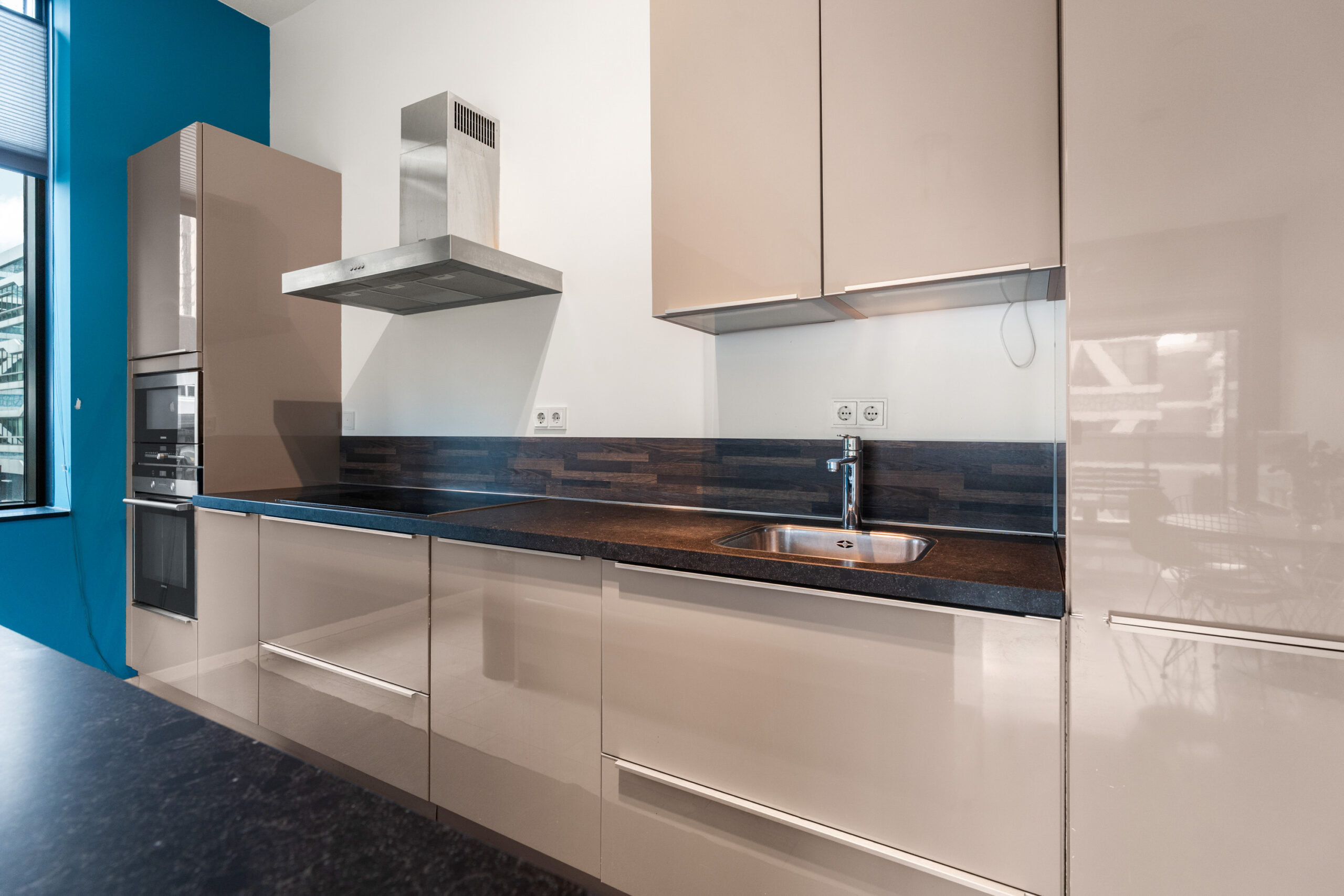 Vanuit de hal stap je de lichte woonkamer binnen: een royale leefruimte met grote ramen en toegang tot het balkon op het noordwesten, waar je na het werk heerlijk kunt genieten van de avondzon en het weidse uitzicht. De open keuken is een echte blikvanger, uitgevoerd met moderne inbouwapparatuur en een strak kookeiland dat uitnodigt tot koken én gezellig samenzijn.