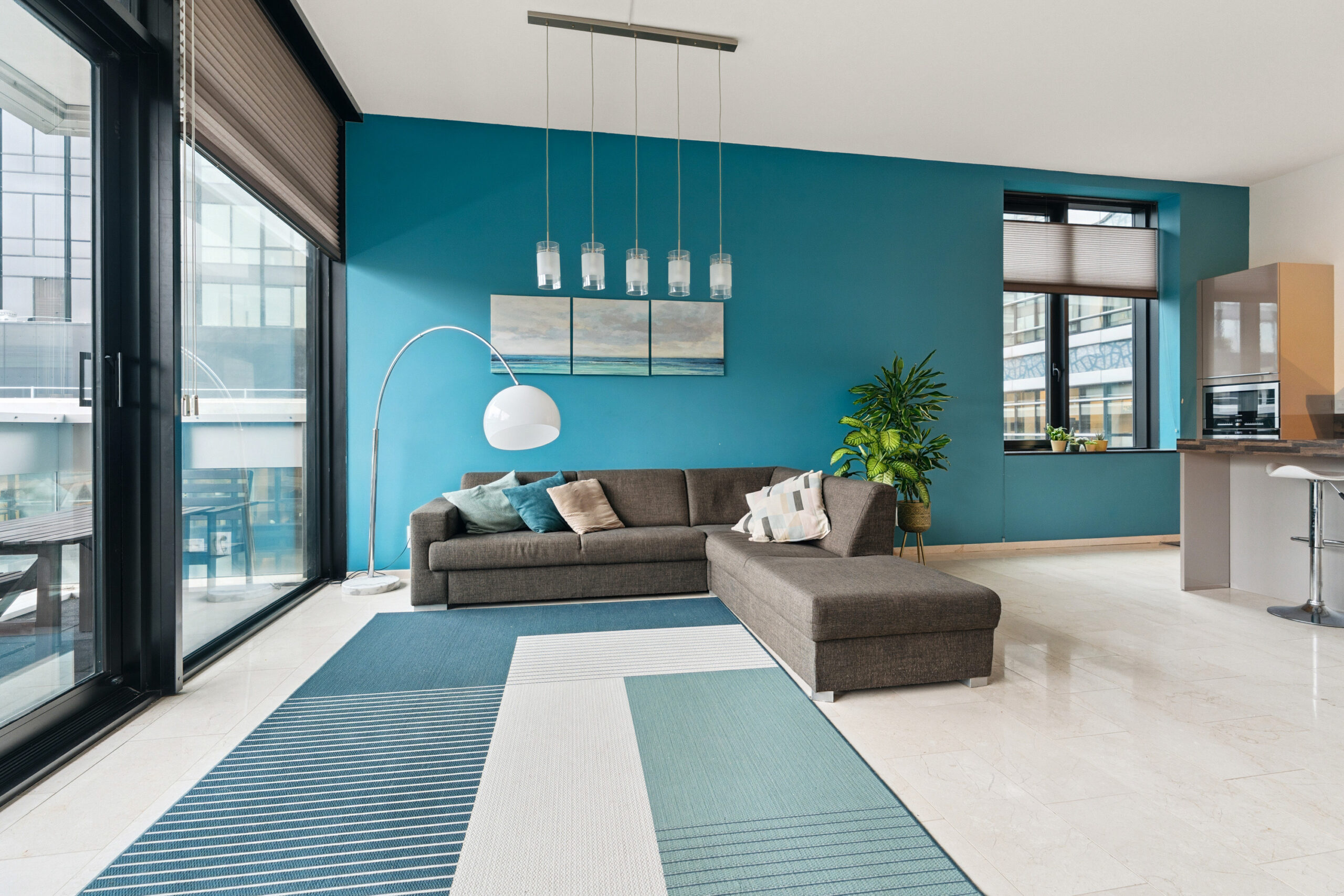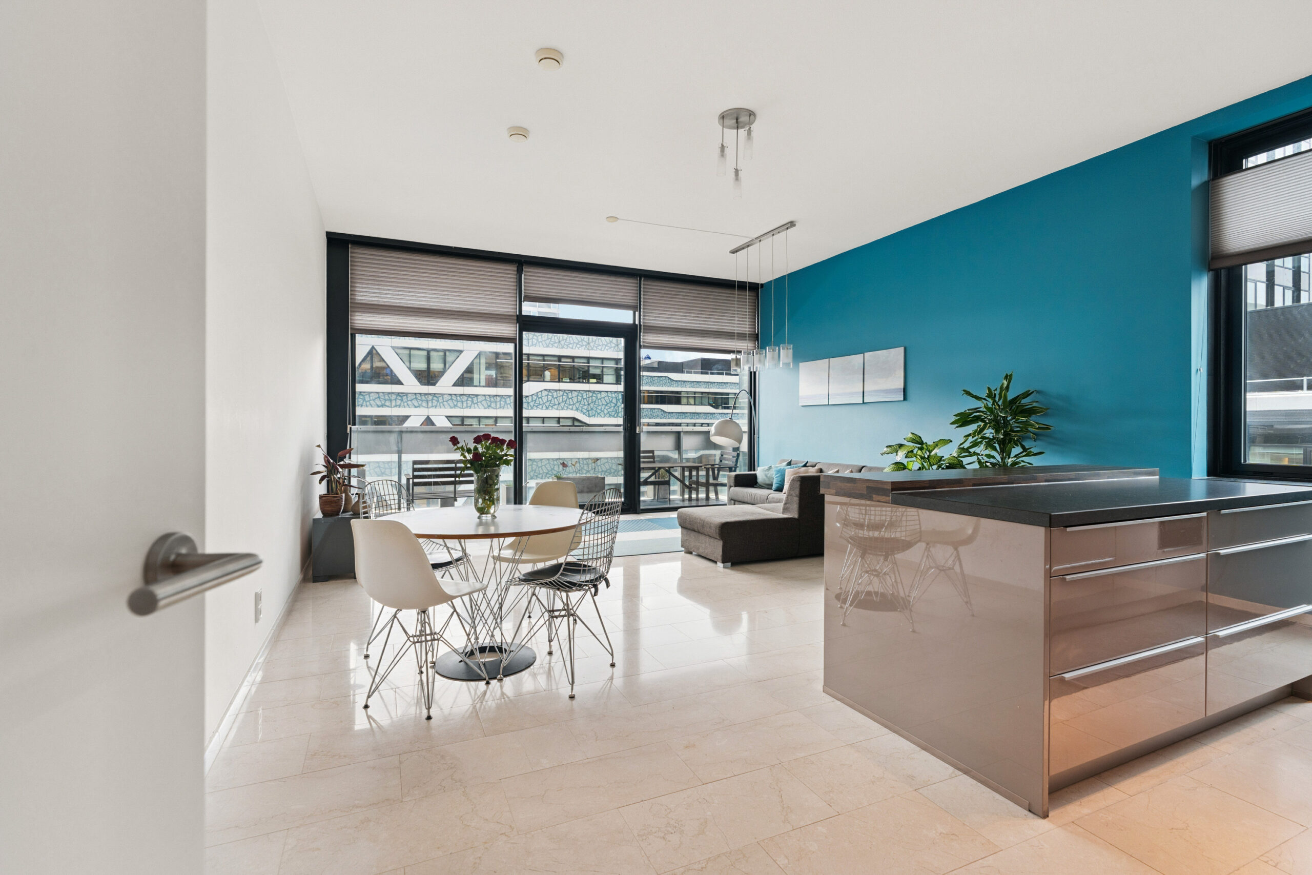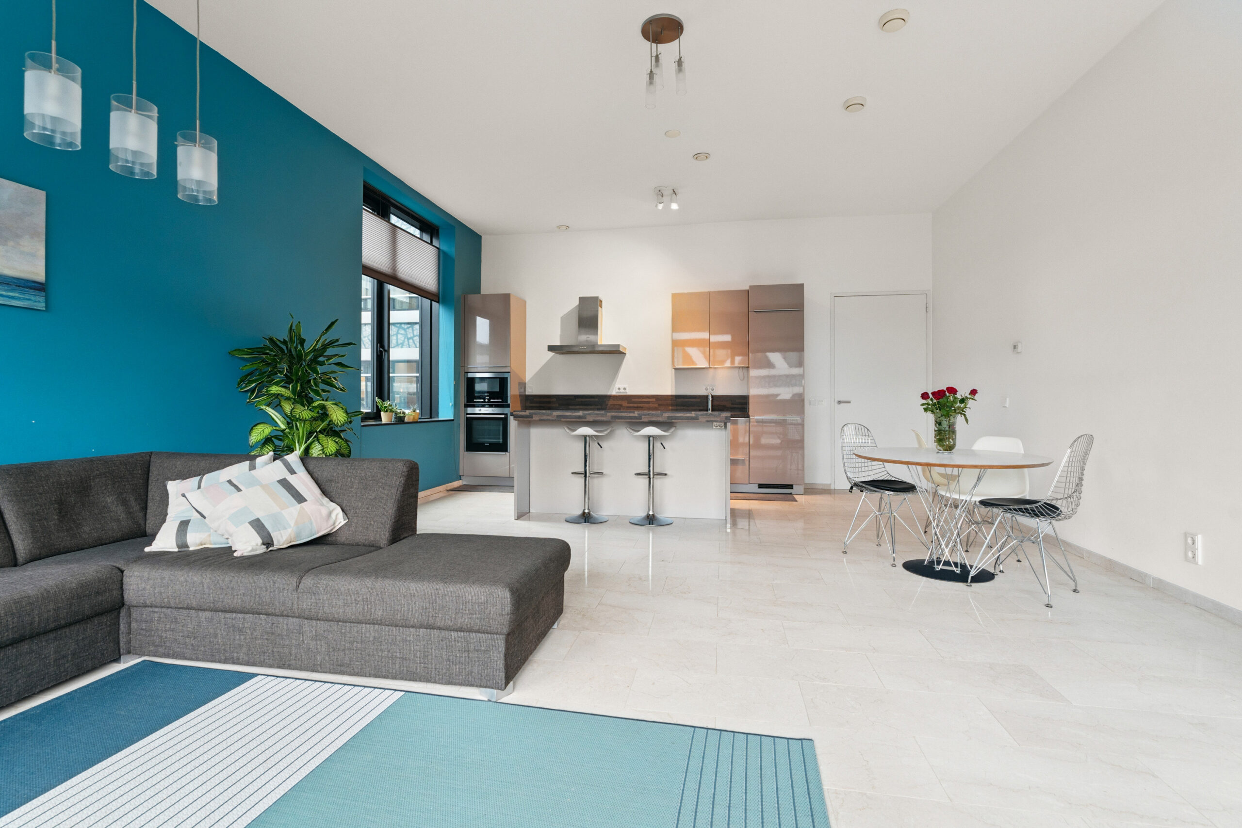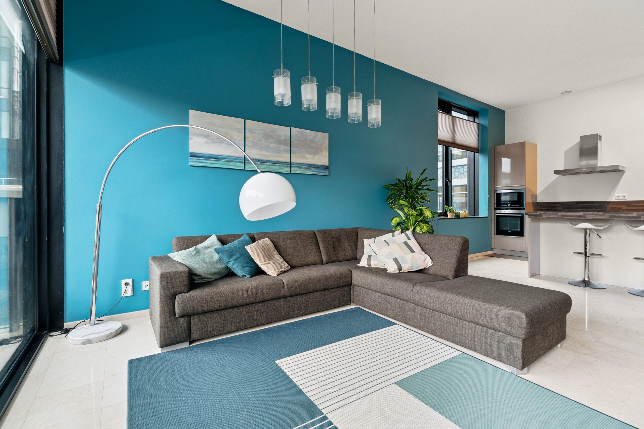 Vanuit de hal stap je de lichte woonkamer binnen: een royale leefruimte met grote ramen en toegang tot het balkon op het noordwesten, waar je na het werk heerlijk kunt genieten van de avondzon en het weidse uitzicht. De open keuken is een echte blikvanger, uitgevoerd met moderne inbouwapparatuur en een strak kookeiland dat uitnodigt tot koken én gezellig samenzijn.