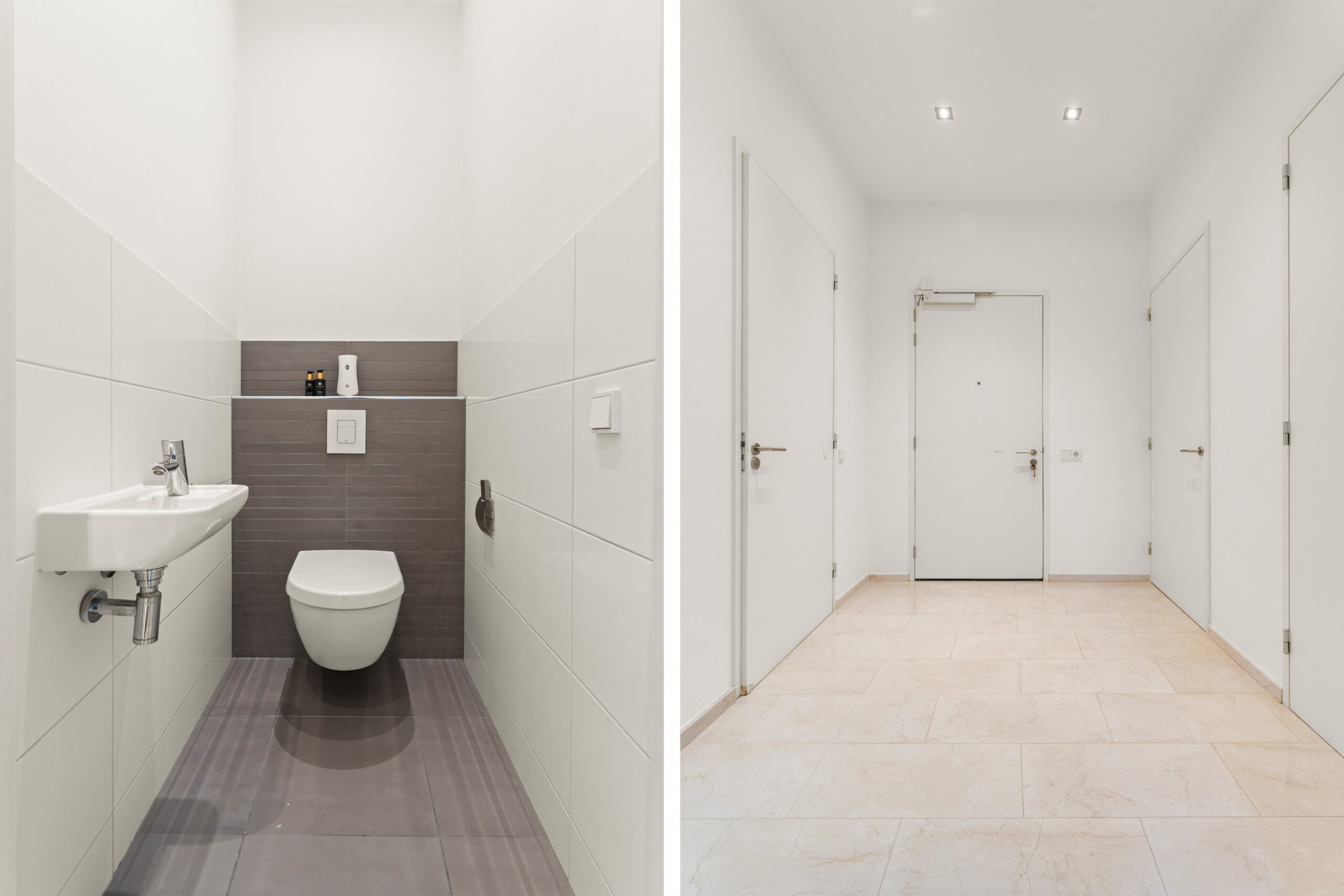 Bij binnenkomst in het gebouw word je verwelkomd door de nette entree en de aanwezigheid van een huismeester – een geruststellende luxe. De lift brengt je naar de negende verdieping, waar de woning zich opent met een ruime hal die direct toegang biedt tot de berging met aansluitingen voor wasmachine en droger. De badkamer is modern en compleet, voorzien van een ligbad, aparte douche en een dubbel wastafelmeubel. Het toilet is separaat, praktisch en stijlvol afgewerkt.