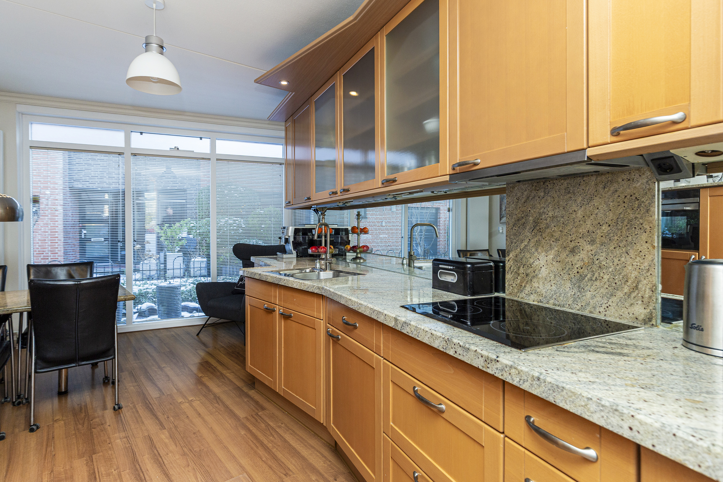 De open keuken aan de voorzijde is voorzien van een granieten werkblad, vierpits inductiekookplaat, afzuigkap, combimagnetron, vaatwasser (2021), koelkast, vriezer, spoelbak met close-in boiler en een praktische zithoek. Door de glazen pui aan de voorzijde valt hier veel daglicht naar binnen.