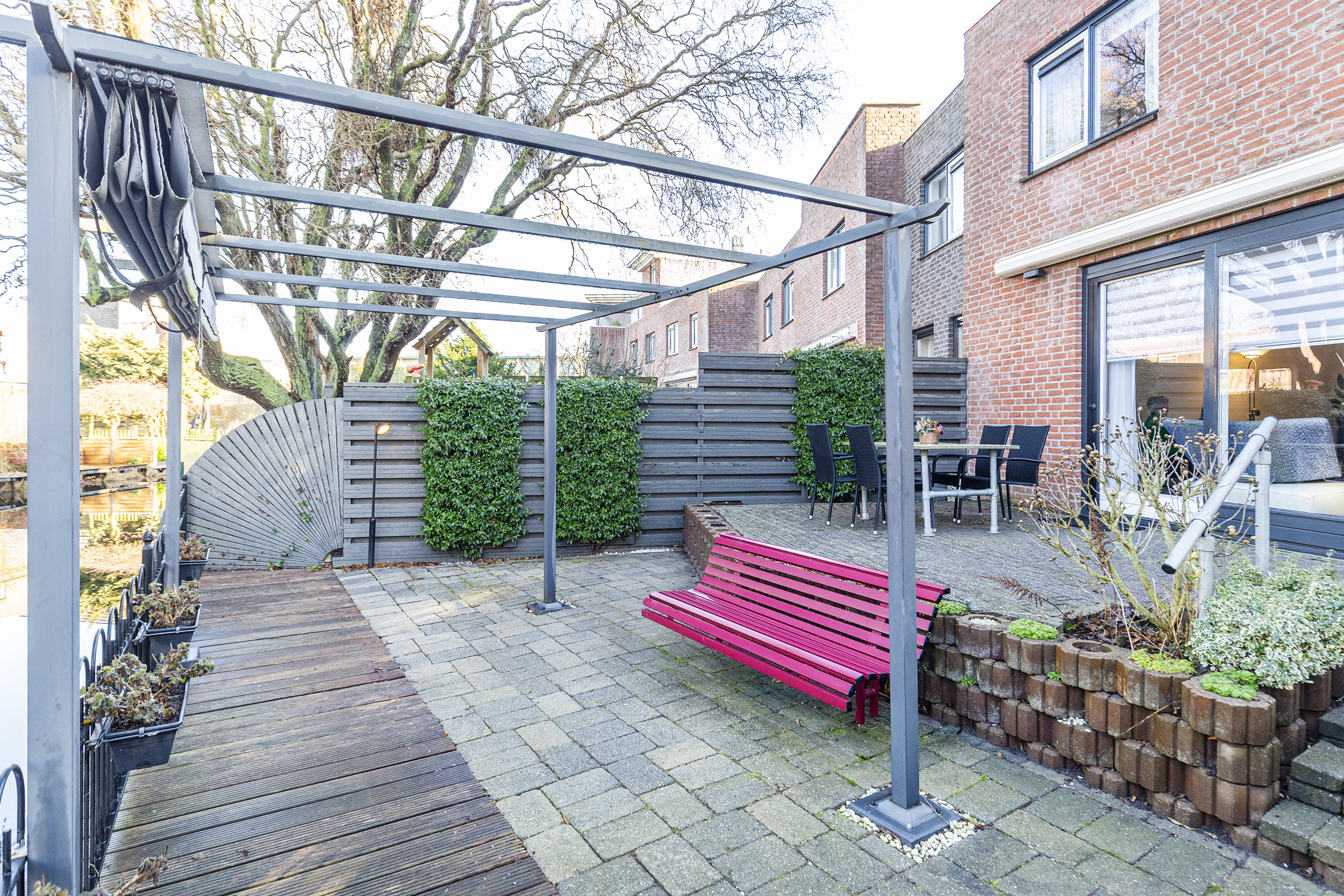 De woning beschikt over een voortuin, zijtuin én een achtertuin met meerdere zitplekken. De achtertuin grenst aan het water en is voorzien van een grote vlonder: een heerlijke plek om tot rust te komen. Achterin de tuin staat een vrijstaand houten tuinhuis met elektra. Dankzij de pergola met zonwering zit je hier ook op warme dagen prettig in de schaduw.