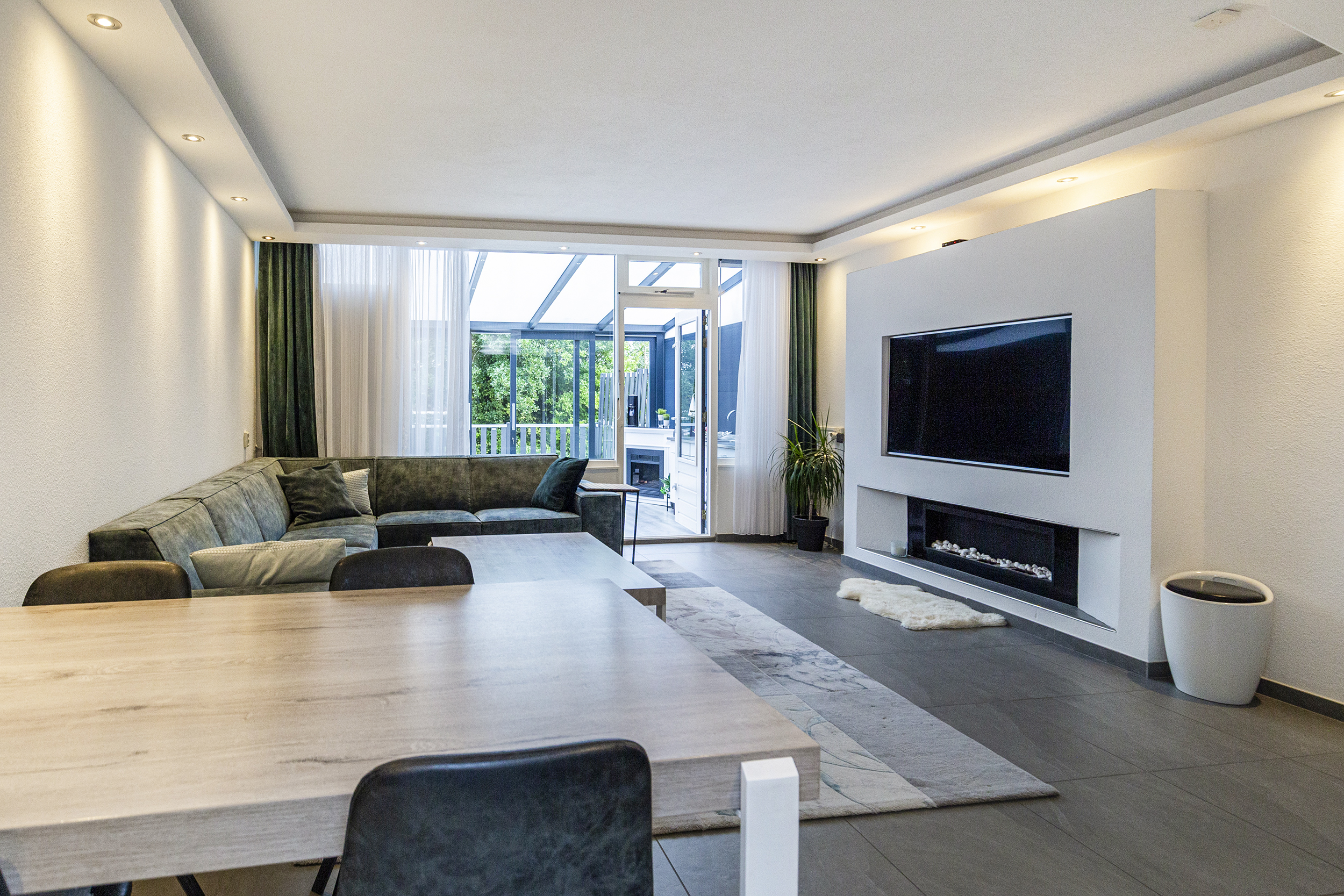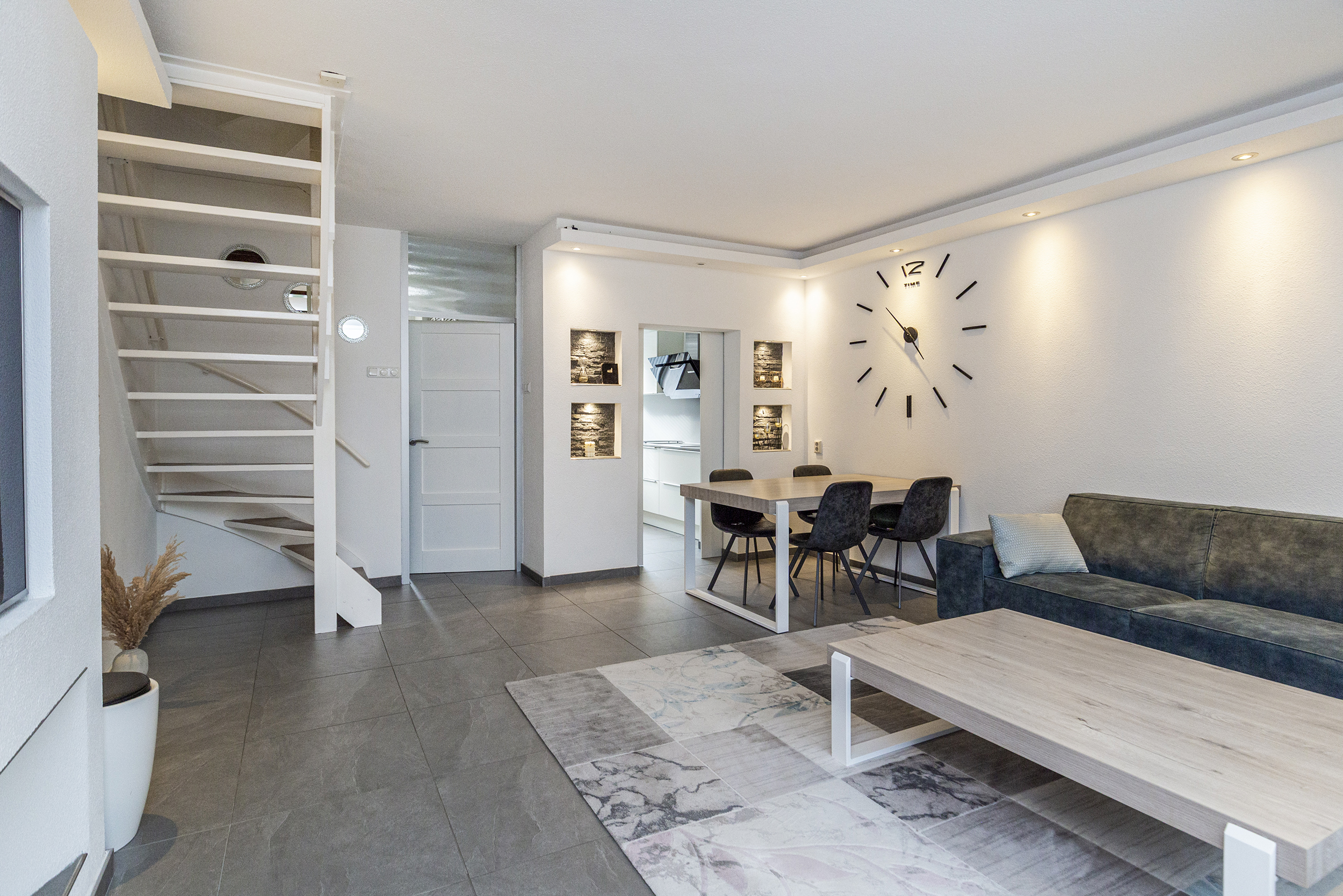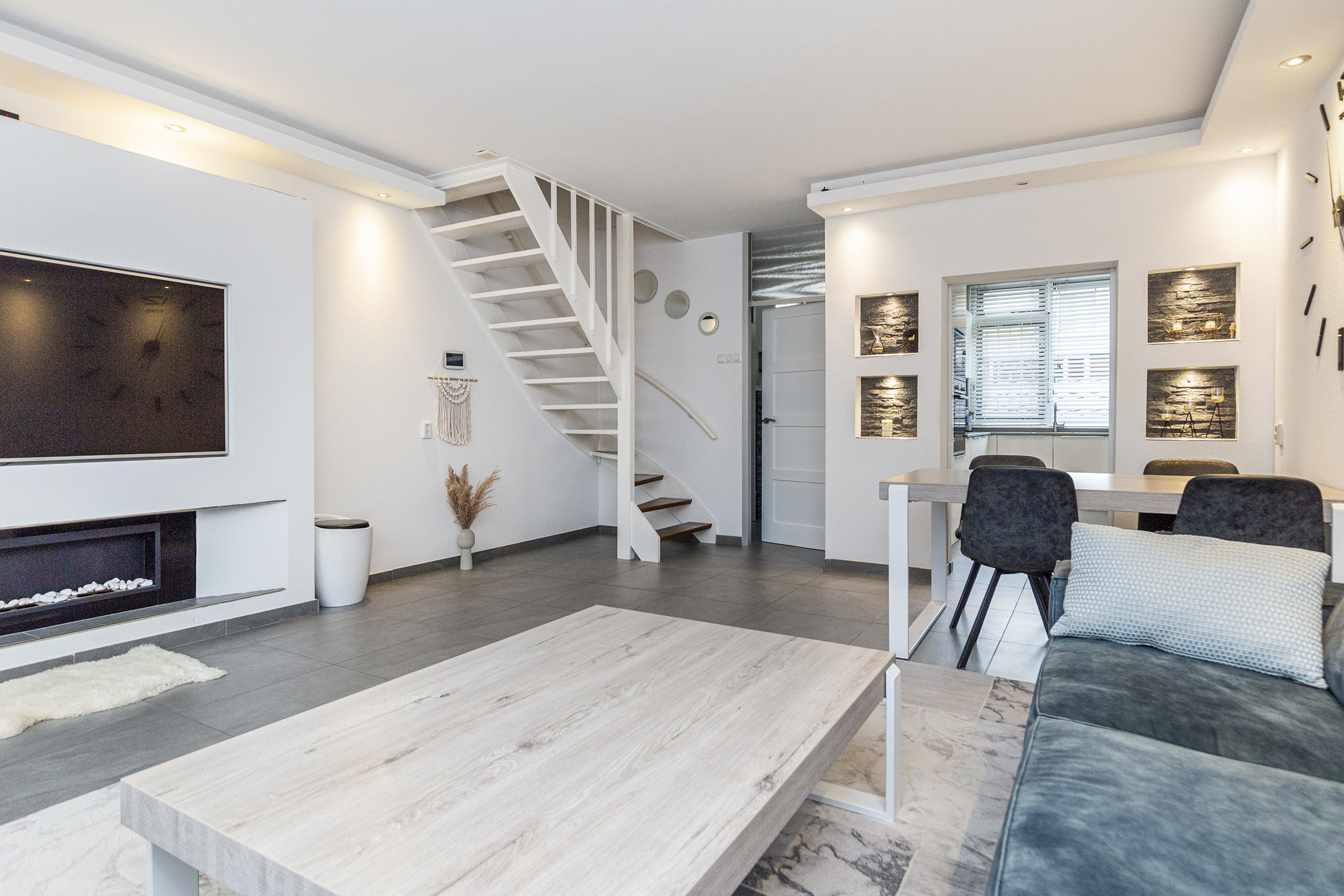 Voortuin met stenen berging welke is voorzien van elektra en een 15 zonnepanelen. Entree in de hal met meterkast en toilet met wastafel. Lichte woonkamer met open keuken aan de voorzijde van de woning. De keuken is voorzien van een vaatwasser, koelkast, combimagnetron een 4 pits inductiekookplaat met recirculatie afzuigkap. Het zitgedeelte van de woonkamer bevindt zich aan de achterzijde van de woning en is v.v. vloerverwarming een biedt toegang tot de achtertuin met ruime tuinkamer. Deze zonnige buitenruimte is gelegen aan het water.