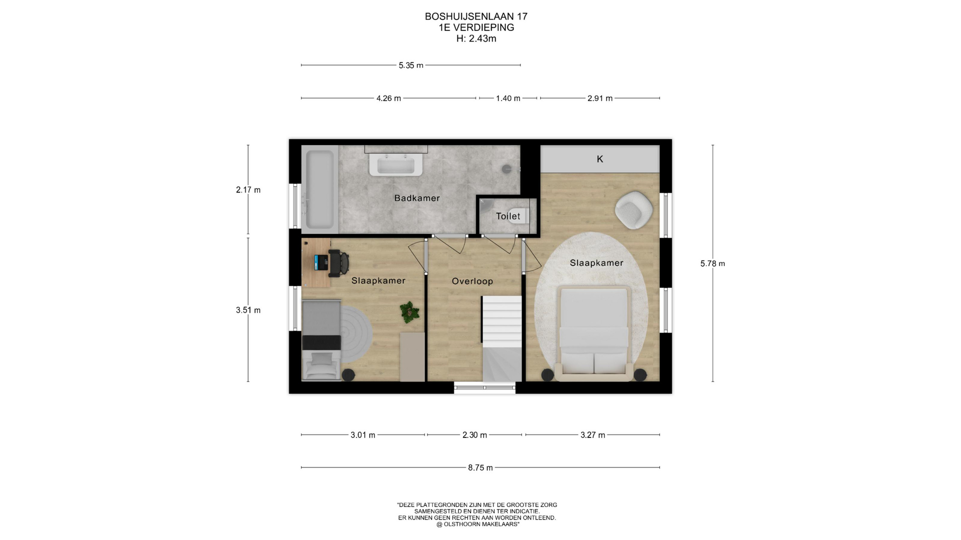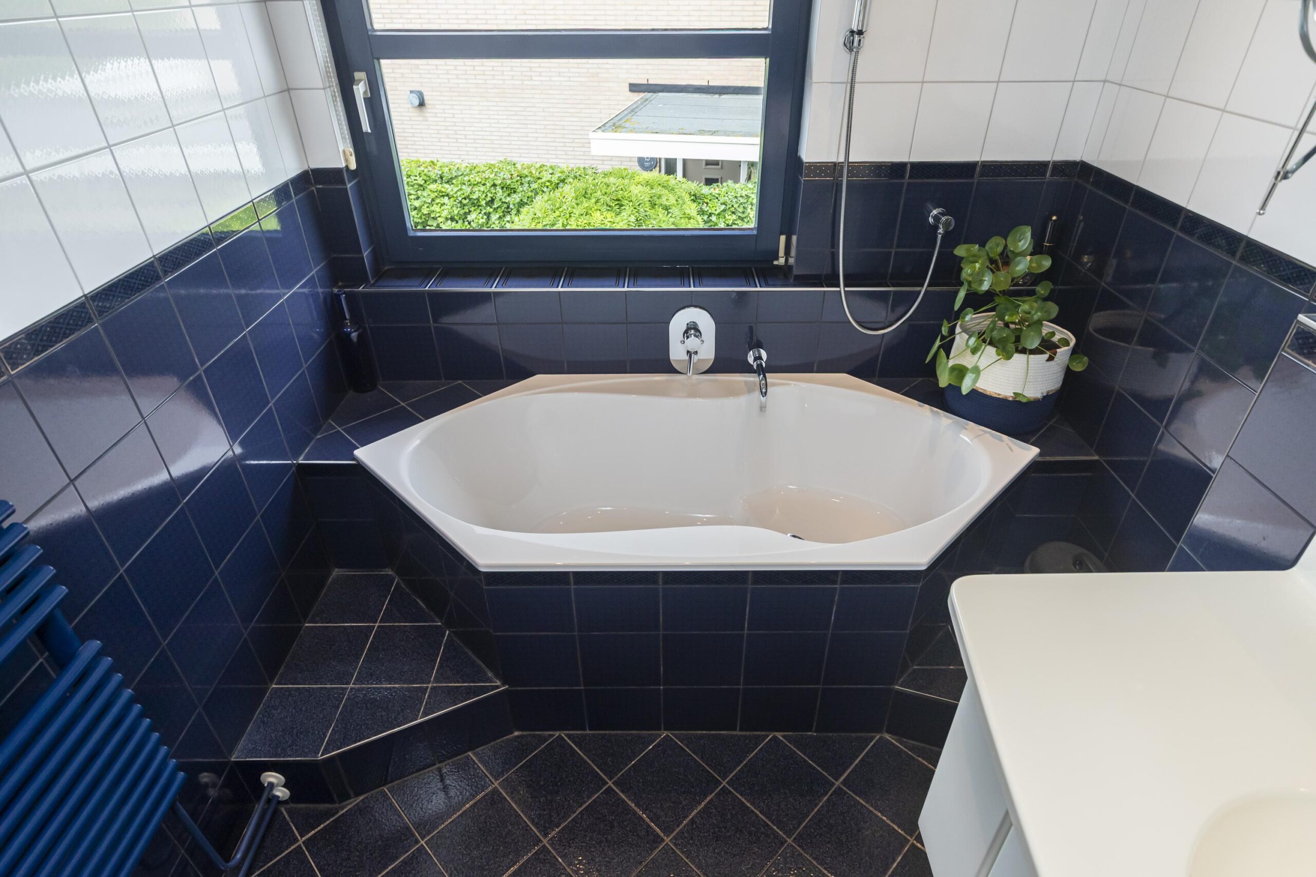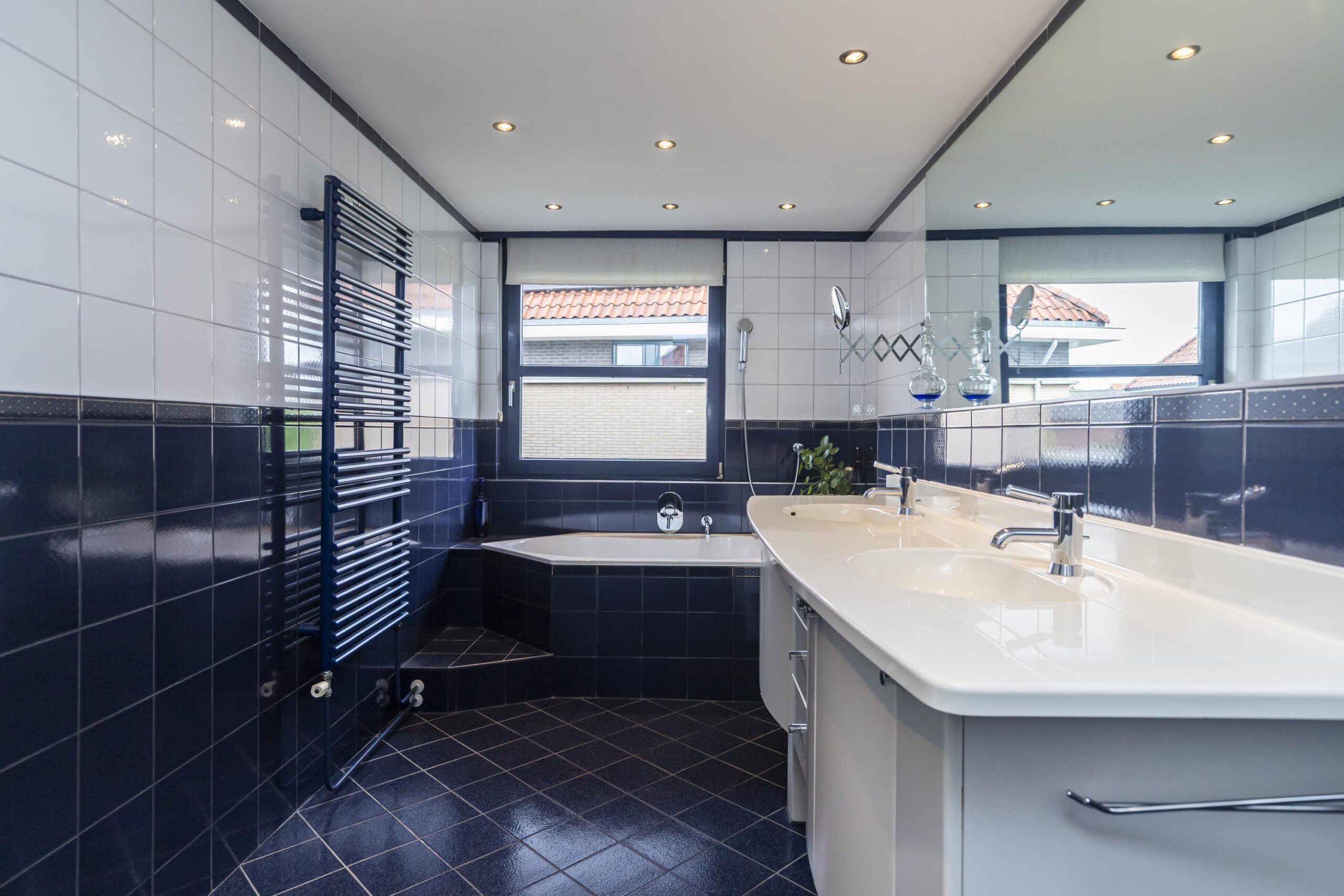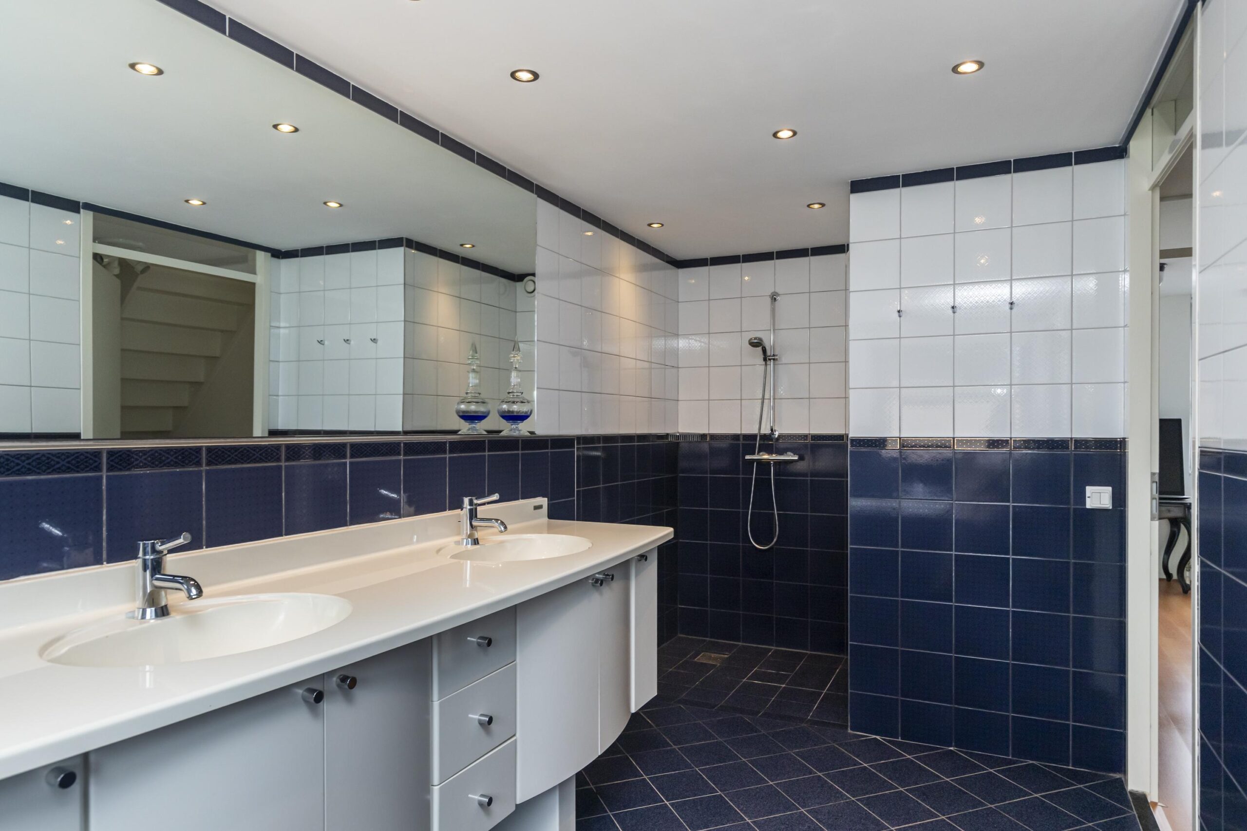 De overloop geeft toegang tot een functionele, betegelde badkamer met ruime inloopdouche, ligbad, wastafelmeubel en een separaat toilet met fonteintje. Aan de voorzijde bevindt zich de ruime ouderslaapkamer, terwijl aan de achterzijde een tweede grote slaapkamer ligt.