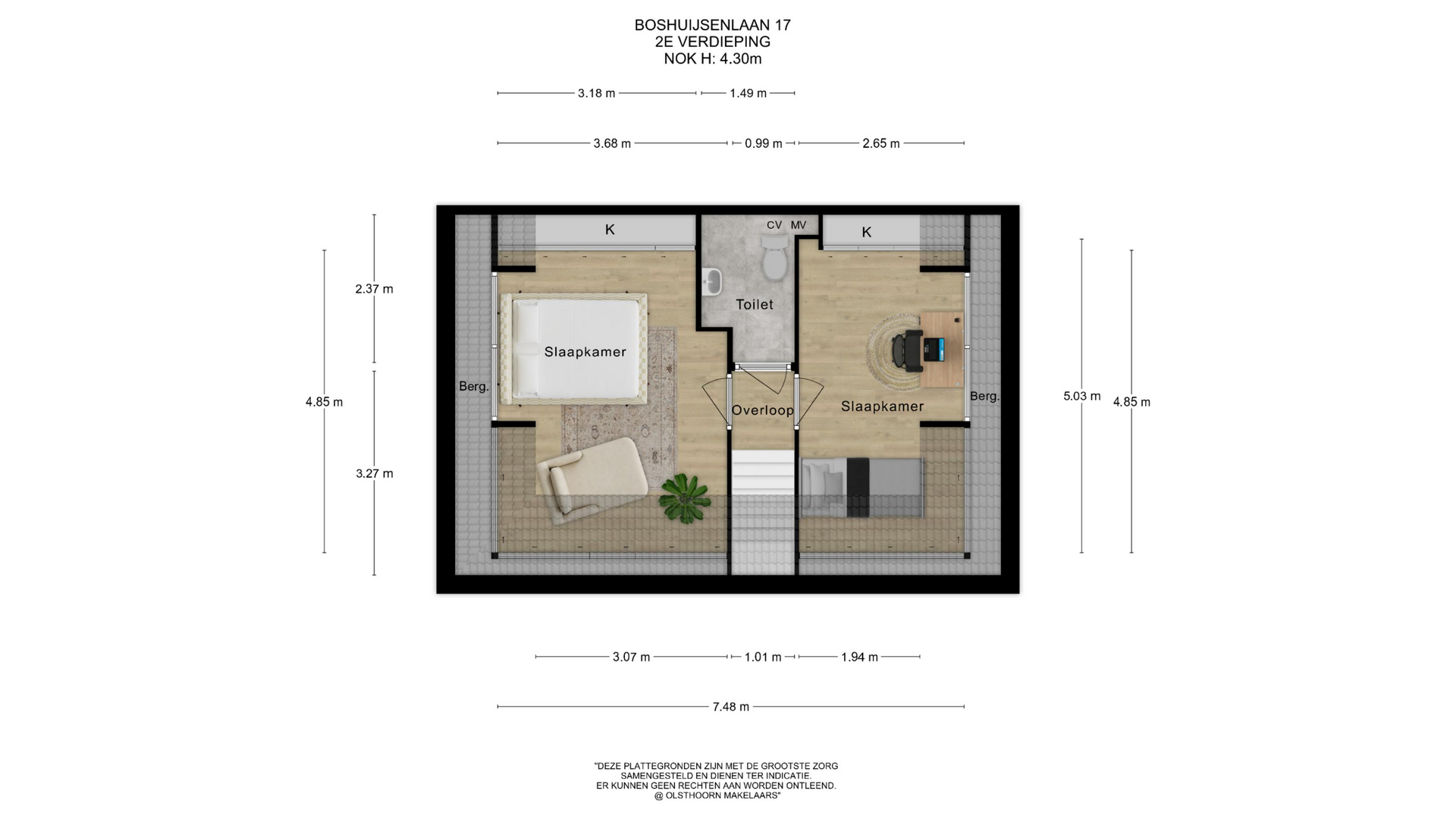 Op de overloop tref je een berging aan met toilet en wastafel, de opstelplaats voor de wasmachine, de combi-ketel en toegang tot de vliering. Daarnaast zijn er twee ruime zolderslaapkamers en beide kamers beschikken over een ruime dakkapel.