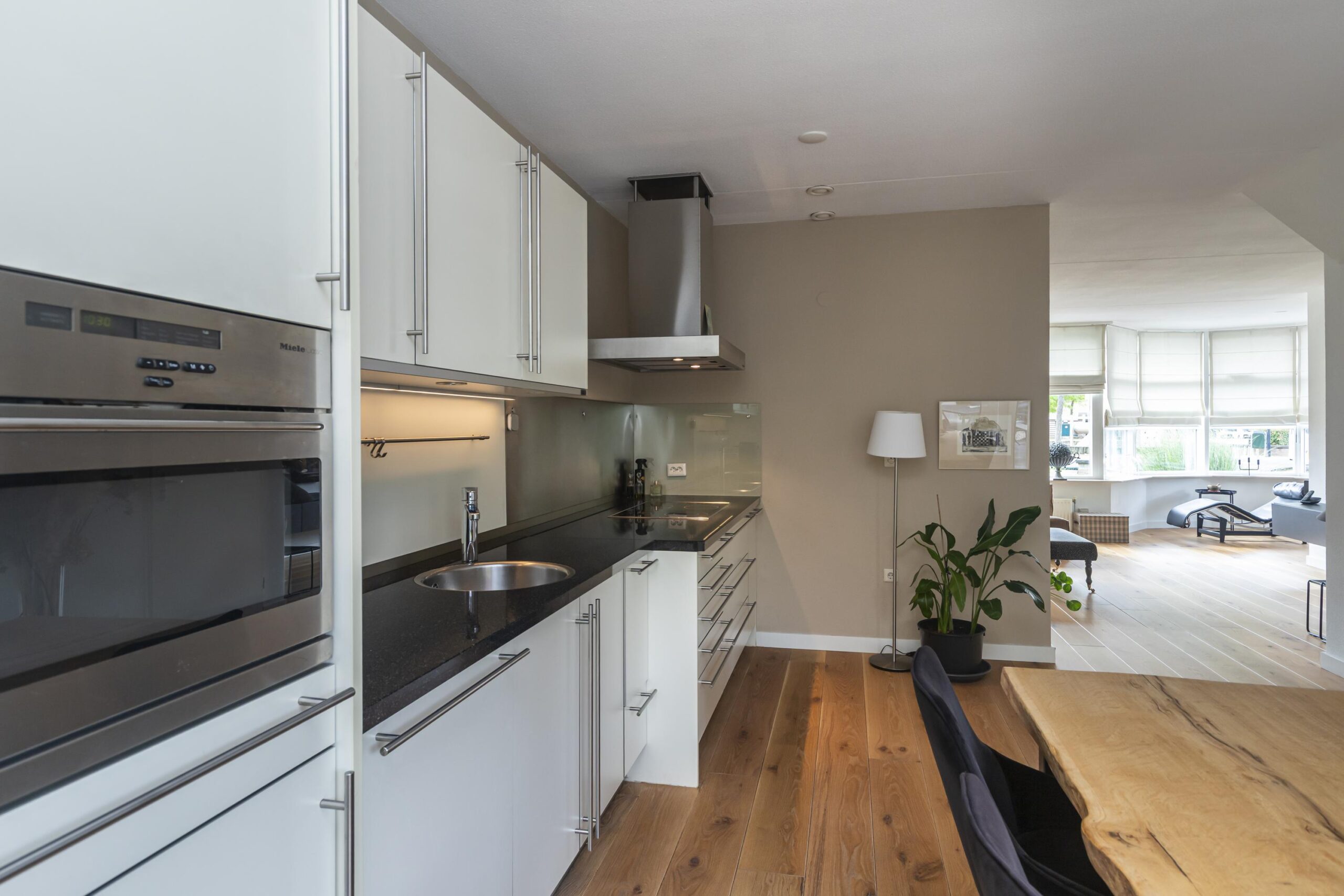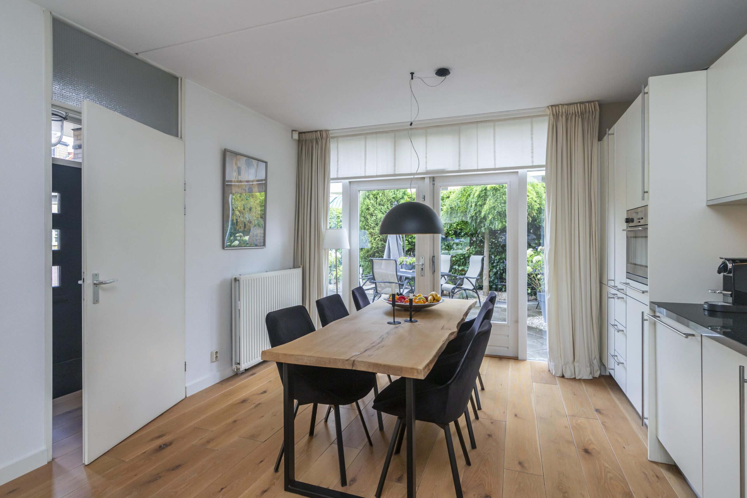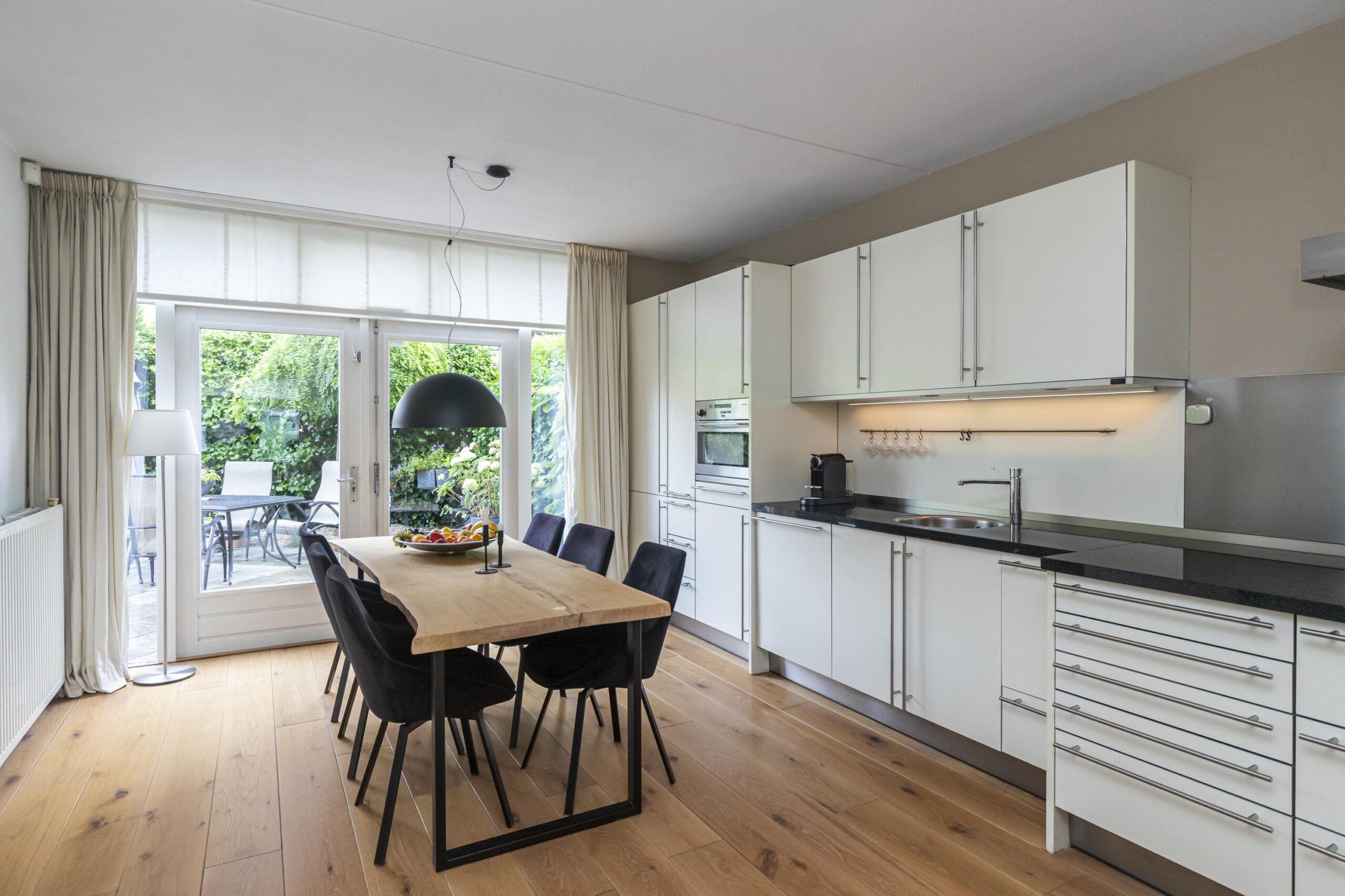 Via de entree in de zijgevel kom je in de ruime hal met meterkast en toilet met fonteintje. De lichte, brede woonkamer is afgewerkt met een massief houten vloer en sluit naadloos aan op de Bulthaup-keuken, compleet met keramische kookplaat, oven, koelkast, vriezer en vaatwasser. Vanuit de dubbele deuren in de achterpui stap je zo de zonnige achtertuin in. De garage beschikt over elektra, water en verwarming, waardoor deze ook als hobbyruimte te gebruiken is.