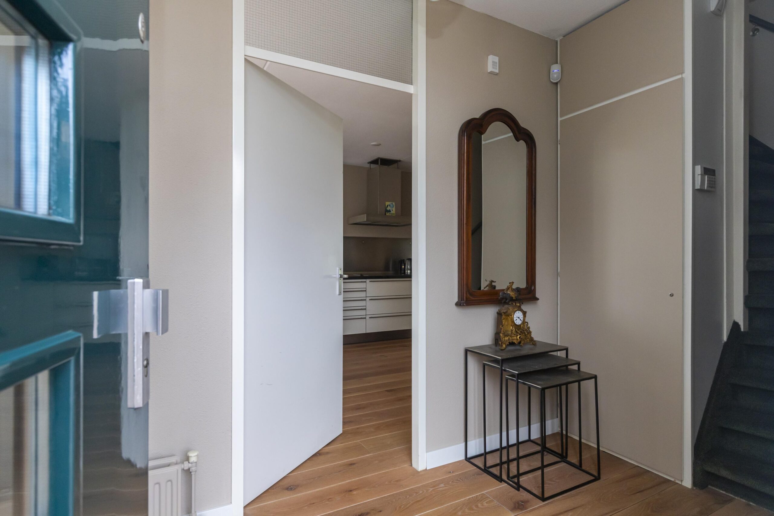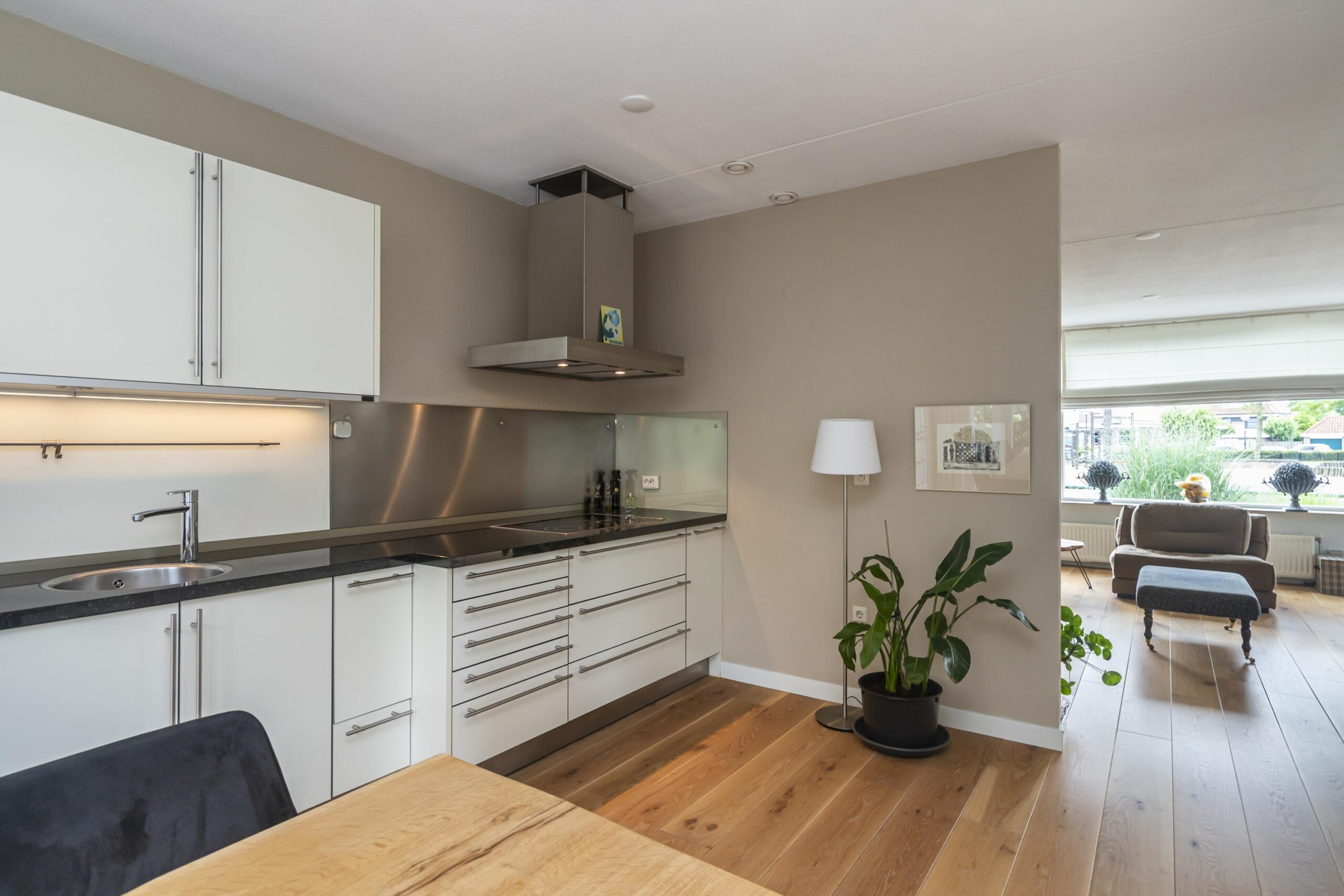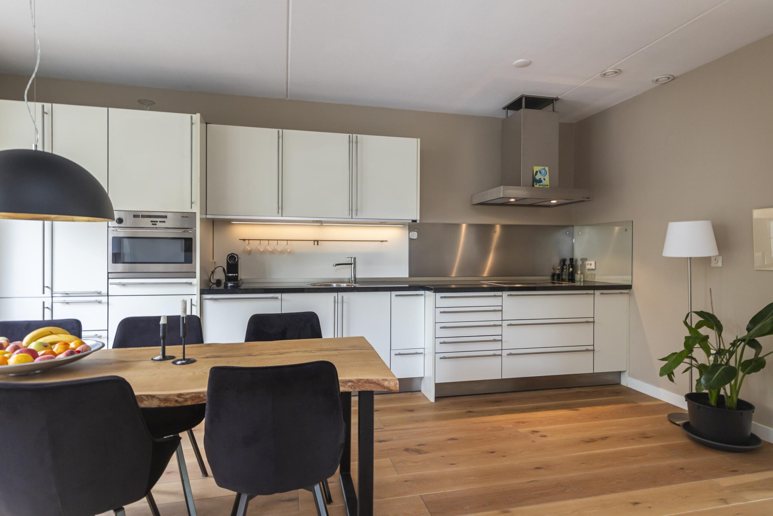 Via de entree in de zijgevel kom je in de ruime hal met meterkast en toilet met fonteintje. De lichte, brede woonkamer is afgewerkt met een massief houten vloer en sluit naadloos aan op de Bulthaup-keuken, compleet met keramische kookplaat, oven, koelkast, vriezer en vaatwasser. Vanuit de dubbele deuren in de achterpui stap je zo de zonnige achtertuin in. De garage beschikt over elektra, water en verwarming, waardoor deze ook als hobbyruimte te gebruiken is.