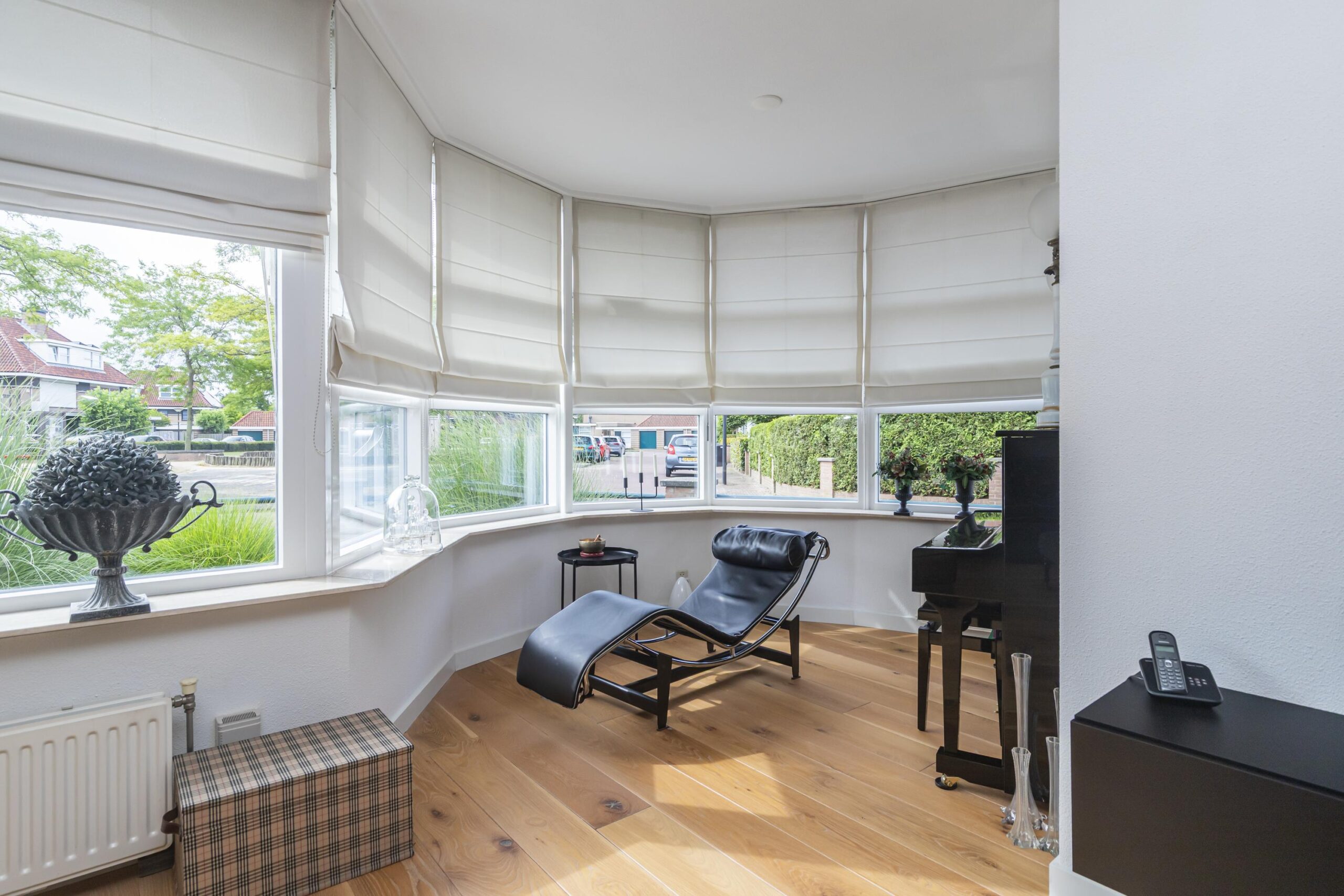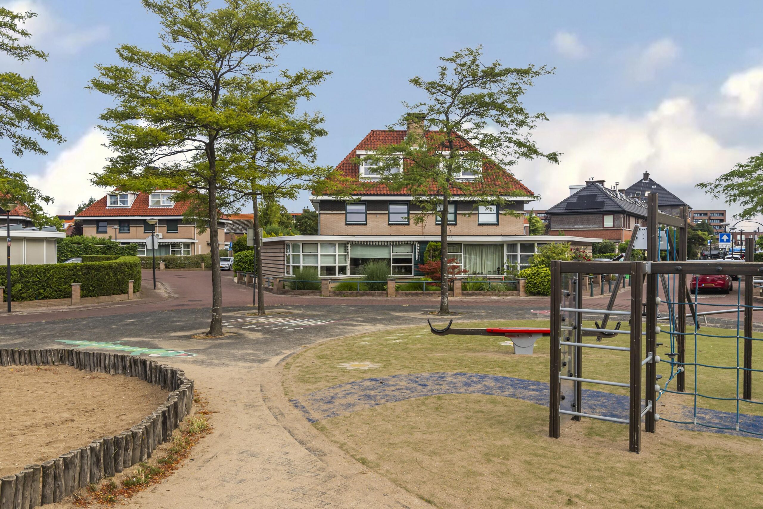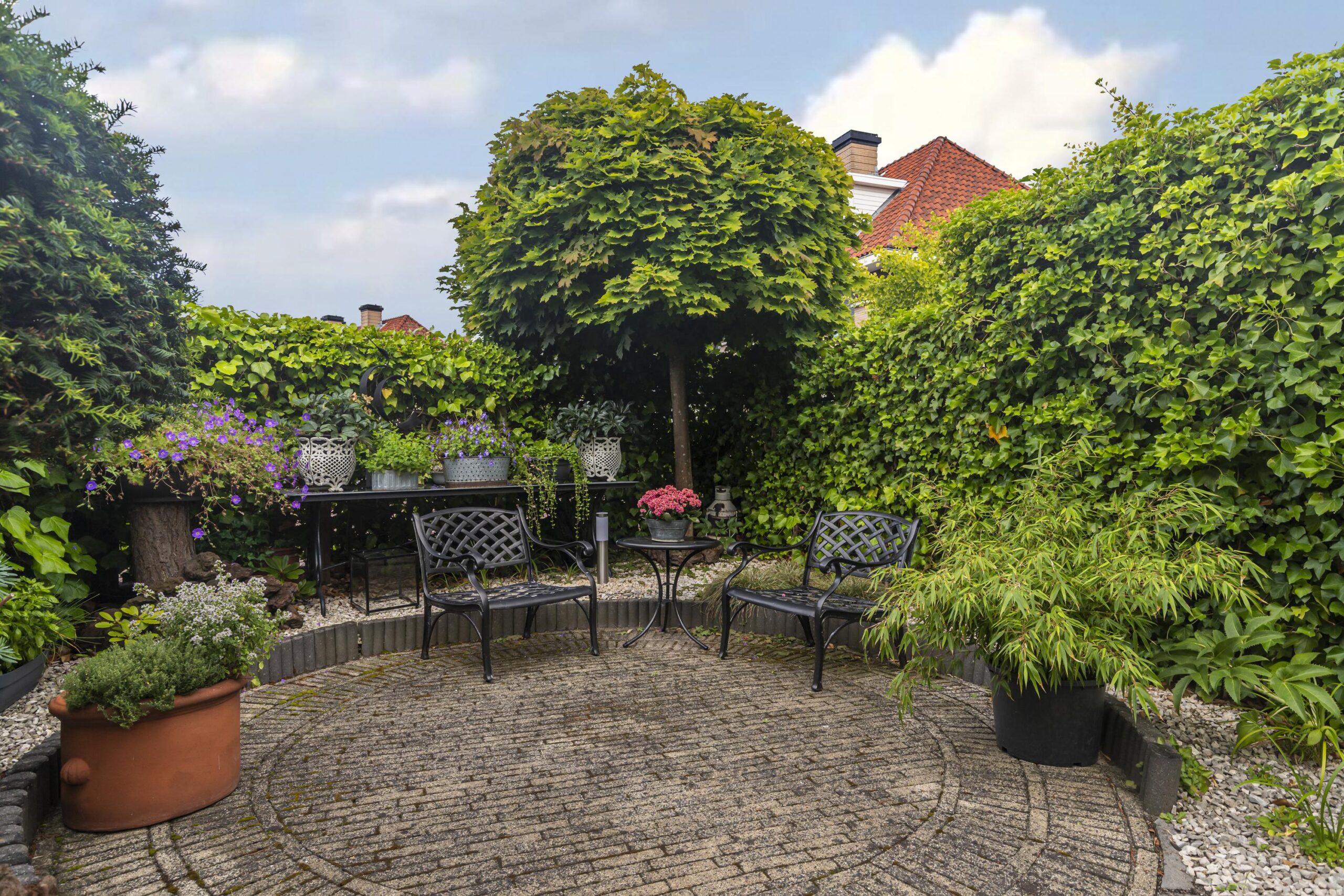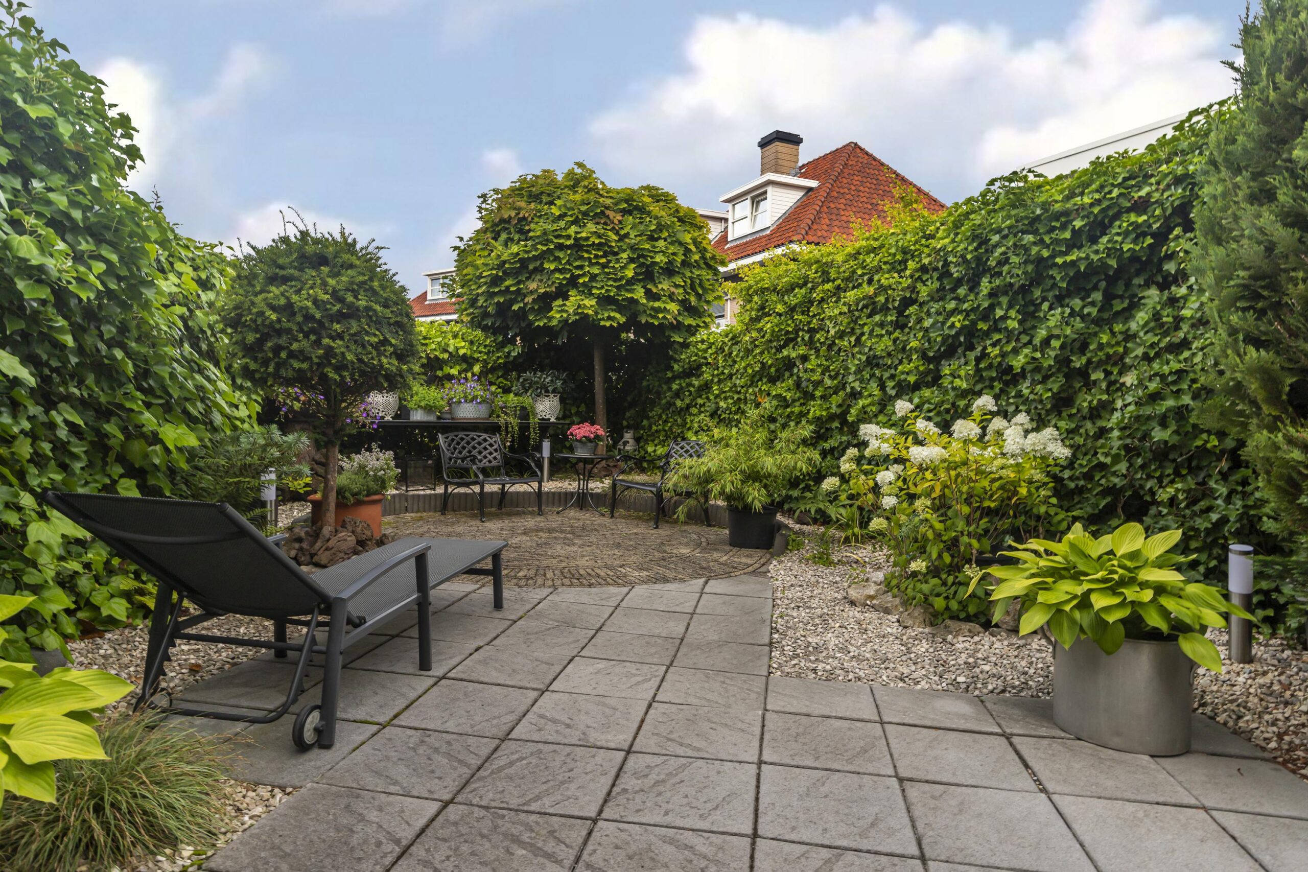 De woning ademt de charme van de jaren ’30, met fraaie dakoverstekken, erkers en karakteristieke tuinmuurtjes. Aan de voorzijde ligt een onderhoudsvriendelijke voortuin, terwijl de zonnige en kindvriendelijke achtertuin op het noordwesten via een zijdeur te bereiken is. De garage (ca. 19 m²) is ruim opgezet, voorzien van een elektrische overheaddeur en aansluiting voor de wasmachine.