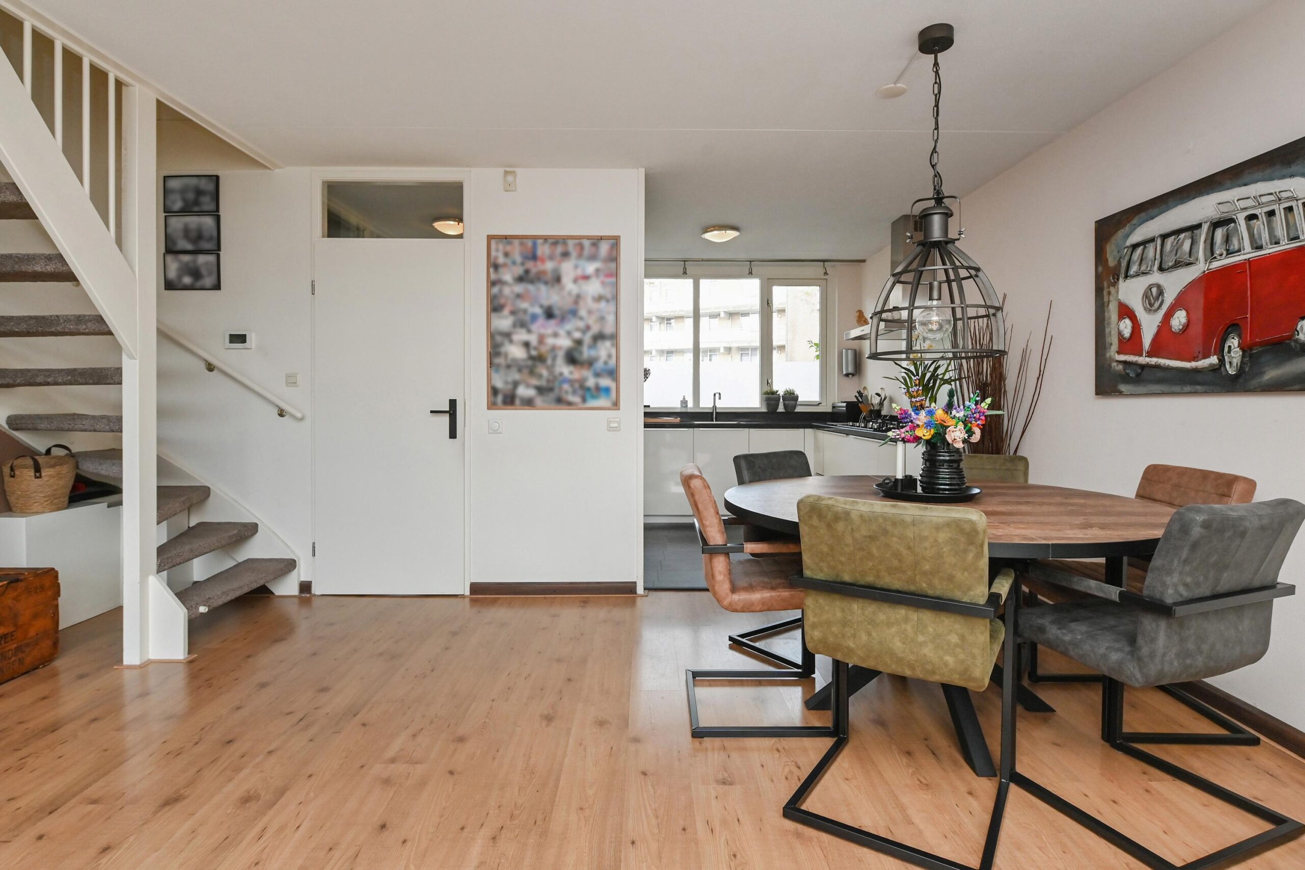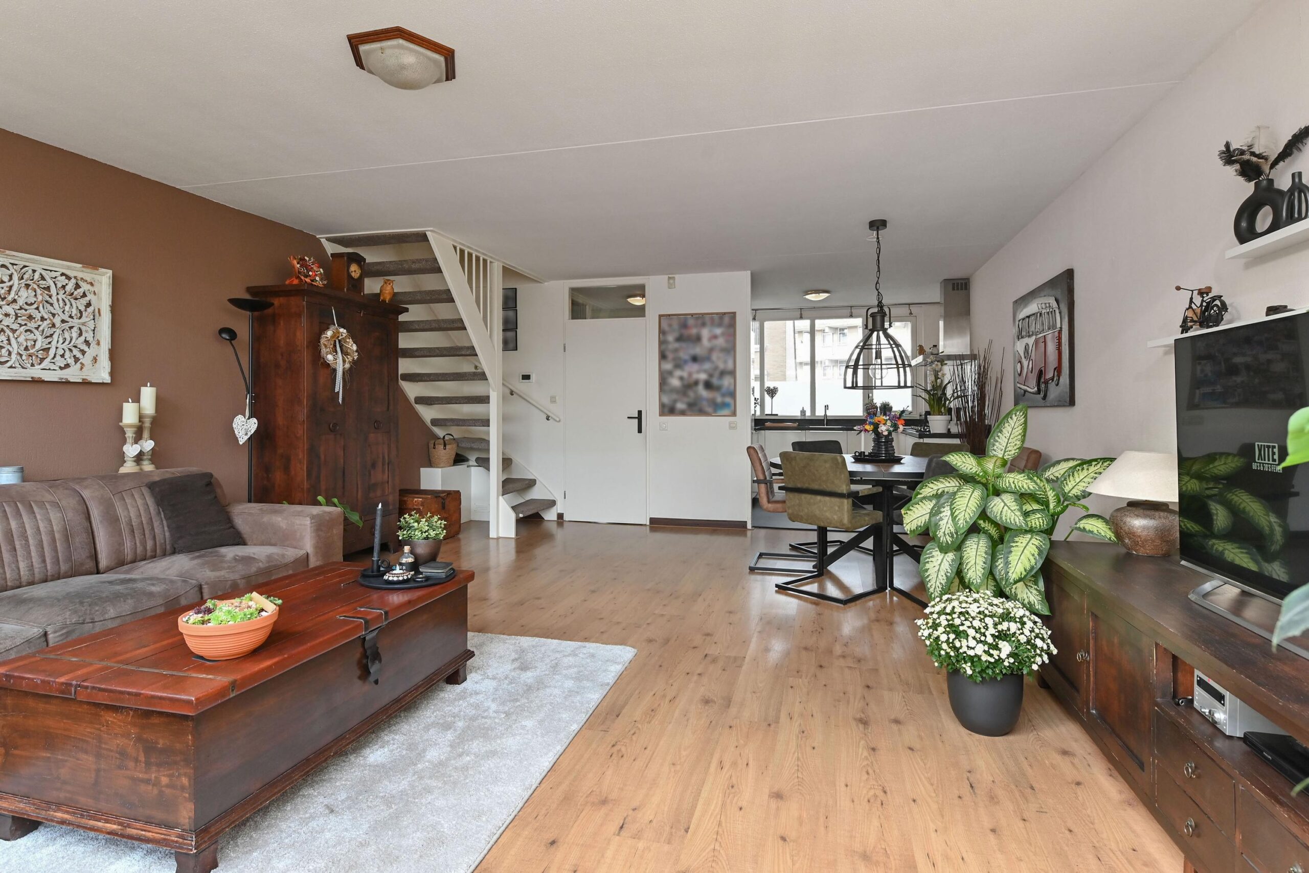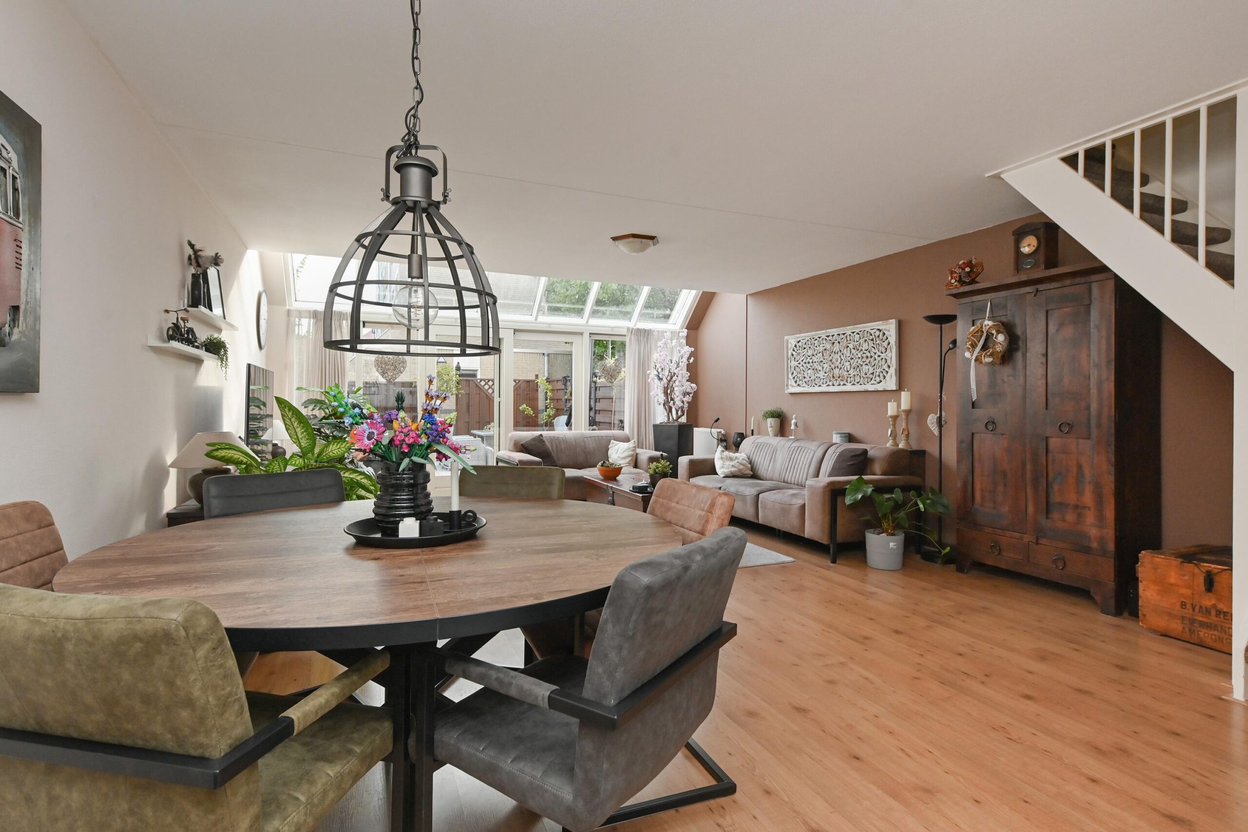 Dankzij de grote schuifpui stap je zo de ruime achtertuin in, waardoor binnen en buiten mooi in elkaar overlopen. De trap naar boven bevindt zich in de woonkamer, praktisch én sfeervol geplaatst.